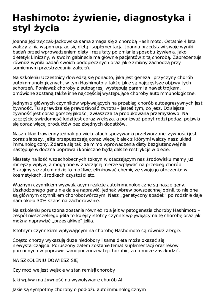 Hashimoto: żywienie, diagnostyka i styl życia Joanna Jędrzejczak-Jackowska sama zmaga się z chorobą Hashimoto. Ostatnie 4 lata walczy z nią wspomagając się dietą i suplementacją. Joanna przedstawi swoje wyniki badań przed wprowadzeniem diety i rezultaty po zmianie sposobu żywienia. Jako dietetyk kliniczny, w swoim gabinecie ma głównie pacjentów z tą chorobą. Zaprezentuje również wyniki badań swoich podopiecznych oraz jakie zmiany zachodzą przy sumiennym przestrzeganiu zaleceń. Na szkoleniu Uczestnicy dowiedzą się ponadto, jaka jest geneza i przyczyny chorób autoimmunologicznych, w tym Hashimoto a także jakie są najczęstsze objawy tych schorzeń. Ponieważ choroby z autoagresji występują parami a nawet trójkami, omówione zostaną także inne najczęściej występujące choroby autoimmunologiczne. Jednym z głównych czynników wpływających na przebieg chorób autoagresywnych jest żywność. Tu sprawdza się prawdziwość zwrotu – jesteś tym, co jesz. Dzisiejsza żywność jest coraz gorszej jakości, zwłaszcza ta produkowana przemysłowo. Na szczęście świadomość ludzi jest coraz większa, a ponieważ popyt rodzi podaż, pojawia się coraz więcej produktów bez zbędnych dodatków. Nasz układ trawienny jednak po wielu latach spożywania przetworzonej żywności jest coraz słabszy. Jelita przepuszczają coraz więcej białek z którymi walczy nasz układ immunologiczny. Zdarza się tak, że mimo wprowadzenia diety bezglutenowej nie następuje widoczna poprawa i konieczne będą dalsze restrykcje w diecie. Niestety na ilość wszechobecnych toksyn w otaczającym nas środowisku mamy już mniejszy wpływ, a mogą one w znaczącej mierze wpływać na przebieg chorób. Starajmy się zatem gdzie to możliwe, eliminować chemię ze swojego otoczenia: w kosmetykach, środkach czystości etc. Ważnym czynnikiem wyzwalającym reakcje autoimmunologiczne są nasze geny. Uszkodzonego genu nie da się naprawić, jednak wbrew powszechnej opinii, to nie one są głównym czynnikiem chorobotwórczym. Nasz „genetyczny spadek” po rodzinie daje nam około 30% szans na zachorowanie. Na szkoleniu poruszona zostanie również rola jelit w patogenezie choroby Hashimoto – zespół nieszczelnego jelita to kolejny istotny czynnik wpływający na tę chorobę oraz jak można naprawiać „przesiąkliwe” jelita. Istotnym czynnikiem wpływającym na chorobę Hashomoto są również alergie. Często chorzy wykazują duże niedobory i sama dieta może okazać się niewystarczająca. Poruszony zatem zostanie temat suplementacji oraz leków pomocnych w poprawie samopoczucia w tej chorobie, a co może zaszkodzić. NA SZKOLENIU DOWIESZ SIĘ Czy możliwe jest wejście w stan remisji choroby Jaki wpływ ma żywność na wywoływanie chorób AI Jakie są sympotmy choroby o podłożu autoimmunologicznym O prozapalnym działaniu alergii Jak poprawić metylację, czyli usuwanie toksyn z organizmu Czy da się naprawić jelita i jak to zrobić Jak poprawić pracę nadnerczy Jakie suplementy są ważne dla tarczycy Co można zrobić samemu, żeby zatrzymać chorobę Prowadzący: Joanna Jędrzejczak-Jackowska Link do wydarzenia: http://bonavita.pl/kalendarz/lw/hashimoto-zywienie-diagnostyka-istyl-zycia