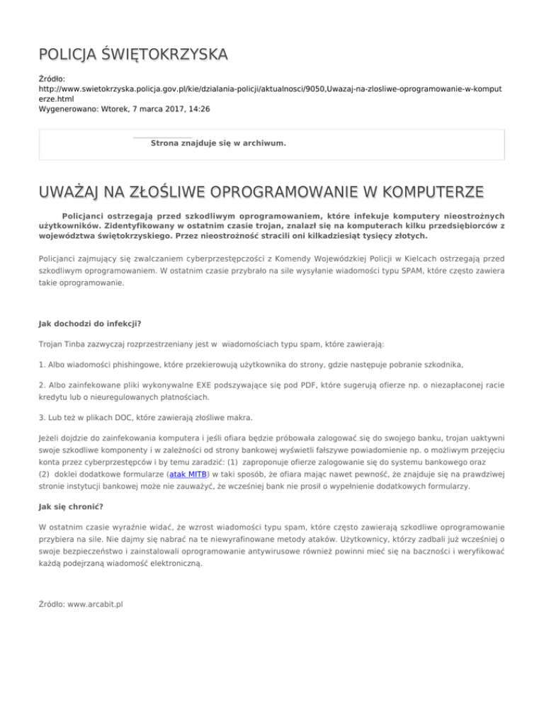 POLICJA ŚWIĘTOKRZYSKA Źródło: http://www.swietokrzyska.policja.gov.pl/kie/dzialania-policji/aktualnosci/9050,Uwazaj-na-zlosliwe-oprogramowanie-w-komput erze.html Wygenerowano: Wtorek, 7 marca 2017, 14:26 Strona znajduje się w archiwum. UWAŻAJ NA ZŁOŚLIWE OPROGRAMOWANIE W KOMPUTERZE Policjanci ostrzegają przed szkodliwym oprogramowaniem, które infekuje komputery nieostrożnych użytkowników. Zidentyfikowany w ostatnim czasie trojan, znalazł się na komputerach kilku przedsiębiorców z województwa świętokrzyskiego. Przez nieostrożność stracili oni kilkadziesiąt tysięcy złotych. Policjanci zajmujący się zwalczaniem cyberprzestępczości z Komendy Wojewódzkiej Policji w Kielcach ostrzegają przed szkodliwym oprogramowaniem. W ostatnim czasie przybrało na sile wysyłanie wiadomości typu SPAM, które często zawiera takie oprogramowanie. Jak dochodzi do infekcji? Trojan Tinba zazwyczaj rozprzestrzeniany jest w wiadomościach typu spam, które zawierają: 1. Albo wiadomości phishingowe, które przekierowują użytkownika do strony, gdzie następuje pobranie szkodnika, 2. Albo zainfekowane pliki wykonywalne EXE podszywające się pod PDF, które sugerują ofierze np. o niezapłaconej racie kredytu lub o nieuregulowanych płatnościach. 3. Lub też w plikach DOC, które zawierają złośliwe makra. Jeżeli dojdzie do zainfekowania komputera i jeśli ofiara będzie próbowała zalogować się do swojego banku, trojan uaktywni swoje szkodliwe komponenty i w zależności od strony bankowej wyświetli fałszywe powiadomienie np. o możliwym przejęciu konta przez cyberprzestępców i by temu zaradzić: (1) zaproponuje ofierze zalogowanie się do systemu bankowego oraz (2) doklei dodatkowe formularze (atak MITB) w taki sposób, że ofiara mając nawet pewność, że znajduje się na prawdziwej stronie instytucji bankowej może nie zauważyć, że wcześniej bank nie prosił o wypełnienie dodatkowych formularzy. Jak się chronić? W ostatnim czasie wyraźnie widać, że wzrost wiadomości typu spam, które często zawierają szkodliwe oprogramowanie przybiera na sile. Nie dajmy się nabrać na te niewyrafinowane metody ataków. Użytkownicy, którzy zadbali już wcześniej o swoje bezpieczeństwo i zainstalowali oprogramowanie antywirusowe również powinni mieć się na baczności i weryfikować każdą podejrzaną wiadomość elektroniczną. Źródło: www.arcabit.pl Ocena: 0/5 (0) Tweetnij