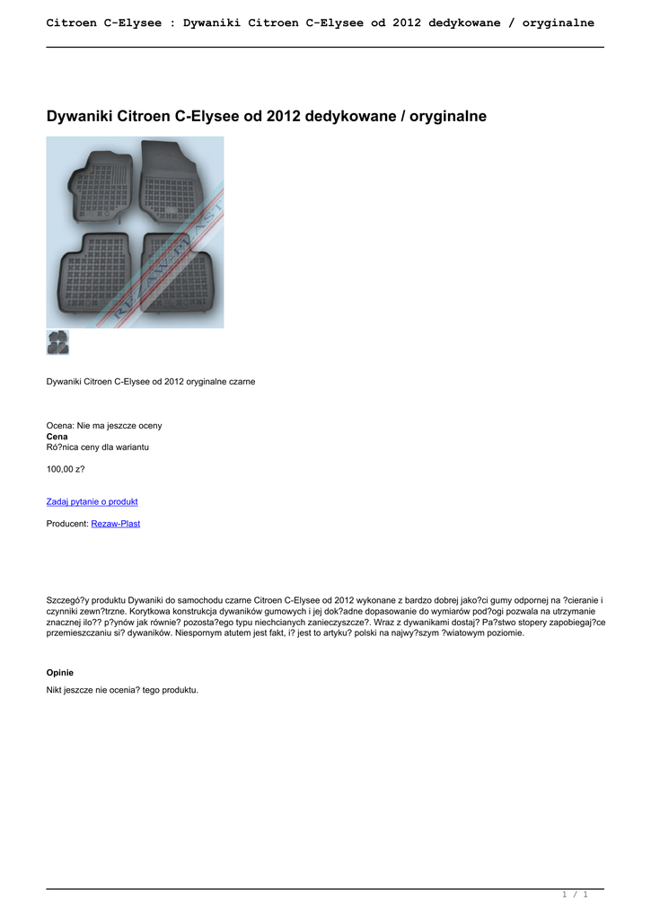 Citroen C-Elysee : Dywaniki Citroen C-Elysee od 2012 dedykowane / oryginalne Dywaniki Citroen C-Elysee od 2012 dedykowane / oryginalne Dywaniki Citroen C-Elysee od 2012 oryginalne czarne Ocena: Nie ma jeszcze oceny Cena Ró?nica ceny dla wariantu 100,00 z? Zadaj pytanie o produkt Producent: Rezaw-Plast Szczegó?y produktu Dywaniki do samochodu czarne Citroen C-Elysee od 2012 wykonane z bardzo dobrej jako?ci gumy odpornej na ?cieranie i czynniki zewn?trzne. Korytkowa konstrukcja dywaników gumowych i jej dok?adne dopasowanie do wymiarów pod?ogi pozwala na utrzymanie znacznej ilo?? p?ynów jak równie? pozosta?ego typu niechcianych zanieczyszcze?. Wraz z dywanikami dostaj? Pa?stwo stopery zapobiegaj?ce przemieszczaniu si? dywaników. Niespornym atutem jest fakt, i? jest to artyku? polski na najwy?szym ?wiatowym poziomie. Opinie Nikt jeszcze nie ocenia? tego produktu. 1 / 1 Powered by TCPDF (www.tcpdf.org)