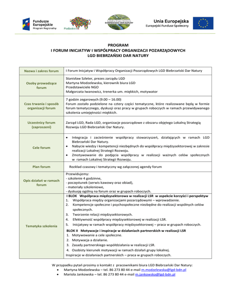 PROGRAM I FORUM INICJATYW I WSPÓŁPRACY ORGANIZACJI POZARZĄDOWYCH LGD BIEBRZAŃSKI DAR NATURY Nazwa i zakres forum Osoby prowadzące forum Czas trwania i sposób organizacji forum Uczestnicy forum (zaproszeni) I Forum Inicjatyw i Współpracy Organizacji Pozarządowych LGD Biebrzański Dar Natury Stanisław Szleter, prezes zarządu LGD Martyna Modzelewska, kierownik biura LGD Przedstawiciele NGO Małgorzata Iwanowicz, trenerka um. miękkich, motywator 7 godzin zegarowych (9.00 – 16.00) Forum zostało podzielone na cztery części tematyczne, które realizowane będą w formie forum tematycznego, dyskusji oraz pracy w grupach roboczych w ramach przewidywanego szkolenia umiejętności miękkich. Zarząd LGD, Rada LGD, organizacje pozarządowe z obszaru objętego Lokalną Strategią Rozwoju LGD Biebrzański Dar Natury. Cele forum Plan forum Integracja i zacieśnienie współpracy stowarzyszeń, działających w ramach LGD Biebrzański Dar Natury. Nabycie wiedzy i kompetencji niezbędnych do współpracy międzysektorowej w zakresie realizacji Lokalnej Strategii Rozwoju. Zmotywowanie do podjęcia współpracy w realizacji ważnych celów społecznych w ramach Lokalnej Strategii Rozwoju. Rozkład czasowy i tematyczny wg załączonej agendy forum Opis działań w ramach forum Tematyka szkolenia Przewidujemy: - szkolenie 4 godzinne, - poczęstunek (serwis kawowy oraz obiad), - materiały szkoleniowe, - dyskusję ogólną na forum oraz w grupach roboczych. I BLOK Współpraca międzysektorowa w realizacji LSR w aspekcie korzyści i perspektyw 1. Współpraca między organizacjami pozarządowymi – wprowadzenie. 2. Kompetencje społeczne i psychospołeczne niezbędne do realizacji wspólnych celów społecznych. 3. Tworzenie relacji międzysektorowych. 4. Efektywność współpracy międzysektorowej w realizacji LSR. 5. Inicjatywy w ramach współpracy międzysektorowej – praca w grupach roboczych. BLOK II Motywacje i inspiracje w działaniach partnerskich w realizacji LSR 1. Motywowanie a cele społeczne. 2. Motywacja a działanie. 3. Zasady partnerskiego współdziałania w realizacji LSR. 4. Osobisty kierunek motywacji w ramach działań grupy lokalnej. Inspiracje w działaniach partnerskich – praca w grupach roboczych. W przypadku pytań prosimy o kontakt z pracownikami biura LGD Biebrzański Dar Natury: Martyna Modzelewska – tel. 86 273 80 44 e-mail [email protected] Mariola Jankowska – tel. 86 273 80 44 e-mail [email protected] AGENDA I FORUM INICJATYW I WSPÓŁPRACY ORGANIZACJI POZARZĄDOWYCH LGD BIEBRZAŃSKI DAR NATURY miejsce: zajazd „Stara Kuźnia”, Ruda ul. Białostocka 26, 19-200 Grajewo termin: 13.10.2016 r. 9:00- 9:15 Rejestracja uczestników Forum 9:15 – 9:30 Powitanie gości Prezes Zarządu Stanisław Szleter 9:30 – 10:00 Działalność stowarzyszeń na terenie LGD Biebrzański Dar Natury Kierownik Biura Martyna Modzelewska, przedstawiciele NGO 10:00- 11:30 Współpraca międzysektorowa w realizacji LSR w aspekcie korzyści i perspektyw, Małgorzata Iwanowicz 11:30 – 12:00 Przerwa kawowa 12:00 – 14:30 Motywacje i inspiracje działań partnerskich w realizacji LSR, Małgorzata Iwanowicz 14:30 – 15:00 Przerwa obiadowa 15.00-16.00 Podsumowanie forum - dyskusja 16:00 Zakończenie I Forum Organizacji Pozarządowych Lokalnej Grupy Działania Biebrzański Dar Natury