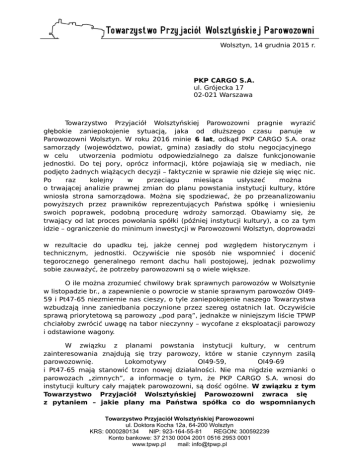 Wolsztyn, 14 grudnia 2015 r. PKP CARGO S.A. ul. Grójecka 17 02-021 Warszawa Towarzystwo Przyjaciół Wolsztyńskiej Parowozowni pragnie wyrazić głębokie zaniepokojenie sytuacją, jaka od dłuższego czasu panuje w Parowozowni Wolsztyn. W roku 2016 minie 6 lat, odkąd PKP CARGO S.A. oraz samorządy (województwo, powiat, gmina) zasiadły do stołu negocjacyjnego w celu utworzenia podmiotu odpowiedzialnego za dalsze funkcjonowanie jednostki. Do tej pory, oprócz informacji, które pojawiają się w mediach, nie podjęto żadnych wiążących decyzji – faktycznie w sprawie nie dzieje się więc nic. Po raz kolejny w przeciągu miesiąca usłyszeć można o trwającej analizie prawnej zmian do planu powstania instytucji kultury, które wniosła strona samorządowa. Można się spodziewać, że po przeanalizowaniu powyższych przez prawników reprezentujących Państwa spółkę i wniesieniu swoich poprawek, podobną procedurę wdroży samorząd. Obawiamy się, że trwający od lat proces powołania spółki (później instytucji kultury), a co za tym idzie – ograniczenie do minimum inwestycji w Parowozowni Wolsztyn, doprowadzi w rezultacie do upadku tej, jakże cennej pod względem historycznym i technicznym, jednostki. Oczywiście nie sposób nie wspomnieć i docenić tegorocznego generalnego remont dachu hali postojowej, jednak pozwolimy sobie zauważyć, że potrzeby parowozowni są o wiele większe. O ile można zrozumieć chwilowy brak sprawnych parowozów w Wolsztynie w listopadzie br., a zapewnienie o powrocie w stanie sprawnym parowozów Ol4959 i Pt47-65 niezmiernie nas cieszy, o tyle zaniepokojenie naszego Towarzystwa wzbudzają inne zaniedbania poczynione przez szereg ostatnich lat. Oczywiście sprawą priorytetową są parowozy „pod parą”, jednakże w niniejszym liście TPWP chciałoby zwrócić uwagę na tabor nieczynny – wycofane z eksploatacji parowozy i odstawione wagony. W związku z planami powstania instytucji kultury, w centrum zainteresowania znajdują się trzy parowozy, które w stanie czynnym zasilą parowozownię. Lokomotywy Ol49-59, Ol49-69 i Pt47-65 mają stanowić trzon nowej działalności. Nie ma nigdzie wzmianki o parowozach „zimnych”, a informacje o tym, że PKP CARGO S.A. wnosi do instytucji kultury cały majątek parowozowni, są dość ogólne. W związku z tym Towarzystwo Przyjaciół Wolsztyńskiej Parowozowni zwraca się z pytaniem – jakie plany ma Państwa spółka co do wspomnianych Towarzystwo Przyjaciół Wolsztyńskiej Parowozowni ul. Doktora Kocha 12a, 64-200 Wolsztyn KRS: 0000280134 NIP: 923-164-55-81 REGON: 300592239 Konto bankowe: 37 2130 0004 2001 0516 2953 0001 www.tpwp.pl mail: [email protected] zimnych eksponatów? Przypomnijmy, na dzień dzisiejszy parowozownia posiada następujące lokomotywy: Znajdujące się obecnie w Lesznie: 1. 2. 3. 4. 5. 6. Ty3-2 – jedyny egzemplarz tej serii w Polsce Ol49-99 Ol49-23 Ol49-60 Ty2-1086 Resztki Ol49-111 Parowozy zgromadzone na bocznicy w Powodowie: 1. 2. 3. 4. 5. Ty2-406 Ty2-1298 Ty42-148 Ty45-379 – jedyny parowóz tej serii w zbiorach wolsztyńskiej parowozowni TKt48-147 Poza tym na stacji w Wolsztynie: 1. 2. 3. 4. 5. 6. 7. 8. Ty5-10 – jedyny w Polsce kompletny parowóz tej serii Ty43-92 Pt47-106 Pt47-112 Ty43-123 TKt48-143 Ty51-223 Wrak Ol49-81 9. Wrak Ol49-85 …oraz na terenie samej parowozowni: 1. 2. 3. 4. 5. 6. 7. 8. 9. TKb-b4 Ty1-76 Ol49-7 (w fatalnym stanie, pomimo odstawienia dopiero w 2011 roku) TKt48-143 Ok1-322 Ok1-359 Tr5-65 Ok22-31 Pm36-2 Jak widać, jest to niemal 30 maszyn kilkunastu różnych serii, niejednokrotnie bardzo cennych. Zaniechanie w ostatnich latach ich zewnętrznej renowacji oraz pozostawienie zdecydowanej większości z nich w miejscach bez dozoru, powoduje postępującą w szybkim tempie degradację i dewastację parowozów, a kradzieże części bardzo utrudniają ewentualne późniejsze przywrócenie do zadowalającego stanu. Towarzystwo Przyjaciół Wolsztyńskiej Parowozowni ul. Doktora Kocha 12a, 64-200 Wolsztyn KRS: 0000280134 NIP: 923-164-55-81 REGON: 300592239 Konto bankowe: 37 2130 0004 2001 0516 2953 0001 www.tpwp.pl mail: [email protected] Kolejnym, bardzo nas niepokojącym aspektem, jest stan wagonów osobowych typu 43A, 101A i 102A. Od kilku lat wagony te znajdują się na terenie lokomotywowni Poznań Franowo w coraz gorszym stanie (po pożarze w 2010 roku do renowacji nadają się 3 z 4 sztuk). Pragniemy nadmienić, że tego typu wagony znajdują się w stanie czynnym w skansenie w Chabówce i są najchętniej wybieranym typem wagonów przez klientów zamawiających pociągi specjalne. Również nasze Towarzystwo niejednokrotnie wynajmowało przejazdy okolicznościowe z tymi właśnie wagonami. W przypadku remontu wagonów znajdujących się na Franowie, zdecydowanie polepszyłaby się oferta turystyczna parowozowni. Warto zauważyć, że ww. wagony historycznie najbardziej pasują do posiadanych w stanie czynnym parowozów i nadają się doskonale na dłuższe trasy z pociągami specjalnymi. Można śmiało stwierdzić, że dla stricte turystycznej działalności instytucji kultury, tego typu tabor jest niezbędny. Wagony posiadają instalację ogrzewania parowego, co w przypadku pociągów zamawianych zimą eliminuje konieczność wynajmowania dodatkowej lokomotywy spalinowej do ogrzewania składu. Wraz z posiadanym przez parowozownię czynnym składem wagonów z lat 20. i 30. XX wieku, odzwierciedlałyby dwie ważne epoki w historii polskiego kolejnictwa. W imieniu Towarzystwa Przyjaciół Wolsztyńskiej Parowozowni już teraz wyrażamy zainteresowanie zamawianiem pociągów specjalnych z tymi wagonami, w przypadku przywrócenia ich do ruchu. W lokomotywowni Poznań Franowo, wraz z ww. wagonami znajduje się również wagon serii Brx niemieckiej budowy z roku 1938. Kilka lat temu stanowił on w Wolsztynie element ekspozycji stałej na stacji. Oprócz tego wagonu jest jeszcze jeden, najcenniejszy eksponat – wagon trzyosiowy, pi