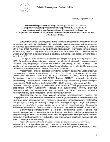 PolskieTowarzystwoBarkuiŁokcia Poznań,2stycznia2017 StanowiskoiprotestPolskiegoTowarzystwaBarkuiŁokcia wsprawiewycenyprocedurartroskopowychH21,H22iH23 zaproponowanejprzezAgencjęOcenyTechnologiiMedycznych iTaryfikacjiwdniu06.12.2016rokuizatwierdzonejwobwieszczeniuzdnia 30.12.2016roku. Zarząd Polskiego Towarzystwa Barku i Łokcia z niepokojem obserwuje od lat tendencje instytucji taryfikujących do obniżania wycen procedur artroskopowych w katalogu gwarantowanych świadczeń ortopedycznych. Opublikowany 6 grudnia 2016 roku przez Agencję Oceny Technologii Medycznych i Taryfikacji projekt zmian w zaszeregowaniu i wycenie kosztów procedur artroskopowych zakładał cięcie wycen punktowych oraz rezygnację z podziału artroskopii na diagnostyczną H23 i leczniczą H22. O ile spójne z naszym stanowiskiem jest połączenie grup katalogowych H23 i H22 (artroskopia diagnostyczna bowiem w dobie dostępności nowoczesnych narzędzi diagnostycznych straciła na swoim znaczeniu), o tyle redukcja i tak zaniżonych od samego początku, a dodatkowo okrojonych w roku 2015, stawek za procedury artroskopowe budzi nasz stanowczy sprzeciw ! Wspomniany projekt zakładał obniżenie wyceny punktowej „artroskopowej rekonstrukcji z użyciem implantów H21“ z 85 do 68,94 punktów (o 19%) oraz „artroskopii leczniczej H22“ z 55 do 38,79 punktów (o 29%). Mimo protestów środowiska ortopedycznego 30.12.2016 Prezes AOTMiT zamieścił ma stronie internetowej obwieszczenie zawierające ustalenia taryf świadczeń gwarantowanych na poziomie 70,90 punktów dla katalogu H21 i 38,79 punktów dla katalogu H22. Otwarte pozostaje pytanie, na podstawie jakich analiz AOTMiT przygotowała swoje propozycje wycen? Dodatkowo szokuje nas dysproporcja wyceny procedur ortopedycznych w porównaniu na przykład ze skalą wyceny procedur neurochirurgów, kardiochirurgów i chirurgów naczyniowych. Obowiązująca do tej pory wycena procedur artroskopowych niestety nie uwzględnia kilku zasadniczych elementów, które mają znaczenie w kształtowaniu się kosztów: ceny jednorazowych narzędzi, implantów ortopedycznych, materiałów medycznych , koszty amortyzacji i utrzymania drogiego sprzętu, sterylizacji, pobytu pacjenta w szpitalu i pracy personelu o wysokich kwalifikacjach. Nawiązanie ściślejszej współpracy z Towarzystwami Naukowymi pozwoliłoby spełnić te warunki. Z przykrością odnotowujemy, iż Polskie Towarzystwo Barku i Łokcia nie zostało zaproszone do prac nad tym projektem i nie brało udziału w opiniowaniu proponowanych zmian. W naszej opinii brak uwzględnienia rzeczywistych kosztów procedur artroskopowych, a tym bardziej ich bezzasadne obniżanie doprowadzi do wielu poważnych konsekwencji. Jednostki służby zdrowia zmuszone będą do zaprzestania wykonywania artroskopii z przyczyn ekonomicznych. Niedoszacowanie kosztów wykluczy procedury artroskopowe z leczenia chorób stawów na rzecz procedur otwartych. Jest 1 PolskieTowarzystwoBarkuiŁokcia to działanie wbrew powszechnie uznanym zasadom wyboru metod leczenia opartym na kryteriach: “best practice” (udowodnione najlepsze wyniki leczenia przy mniejszym ryzyku powikłań) oraz “value cost-effectivness” (udowodnione wyniki skuteczności wobec poniesionych kosztów). Zastosowanie obydwóch parametrów pozwoliło w literaturze fachowej na udowodnienie przewagi technik artroskopowych nad otwartymi. W następstwie powyższego dojdzie lawinowo do kolejnych implikacjiprzewlekania się leczenia ambulatoryjnego, wzrostu absencji chorobowej pacjentów, “produkcji" młodych rencistów, a w konsekwencji wzrostu publicznych wydatków w formie świadczeń ZUS i KRUS oraz utraty dochodów państwa płynących z pracy przywróconych do zdrowia obywateli. Problem dotyczy w większości ludzi w wieku produkcyjnym! Należy pamiętać, że choroby barku wśród osób dorosłych stanowią drugą pod względem częstości przyczynę zgłoszeń do lekarzy ortopedów oraz drugie najczęstsze źródło bólu mięśniowo-szkieletowego. Leczenie artroskopowe jako technika małoinwazyjna pozwala na poprawę jakości życia i szybszy powrót do zdrowia. Polskie Towarzystwo Barku i Łokcia, współpracując ściśle z jego europejskim odpowiednikiem- SECEC, realizuje swoje statutowe cele walcząc o poprawę skuteczności leczenia patologii barku i łokcia oraz odpowiada za edukację medyczną w tym kierunku. Opracowuje i krzewi wysokie standardy leczenia (w tym artroskopowego zaopatrzenia chorób stawów kończyny górnej ). Brak należytej wyceny tego typu operacji to nie tylko odcinanie chorych od dostępu do właściwego leczenia, ale i niszczenie ogromnego potencjału ludzkiego oraz technologicznego. Obawiam się, że nieracjonalne obniżenie cen procedur artroskopowych doprowadzi do cofnięcia się w tej sferze usług medycznych o 10-20 lat ! Będzie miał również niewątpliwie negatywny wpływ na rozwój nowoczesnych technik operacyjnych i pociągnie za sobą nieodwracalne skutki, obniżając znacznie kompetencje ortopedów. Proponowane przez AOTMiT zmiany zakładające oszczędności w sferze nakładów finansowych na procedury artroskopowe mogą niestety uderzyć w znaczącą część społeczeństwa, wywołując obniżenie nastrojów społecznych. W naszej ocenie należy bezzwłocznie przystąpić do weryfikacji taryf przedstawionych w obwieszczeniu Prezesa AOTMiT z 30 grudnia 2016 roku. Z poważaniem Zarząd Polskiego Towarzystwa Barku i Łokcia Dr hab. n.med. Przemysław Lubiatowski Dr n.med. Roman Brzóska Prezes Polskiego Towarzystwa Barku i Łokcia Członek Zarządu Europejskiego Towarzystwa Barku i Łokcia Prezes Elekt Polskiego Towarzystwa Barku i Łokcia Lek. med. Robert Pełka Członek Zarządu Polskiego Towarzystwa Barku i Łokcia 2
