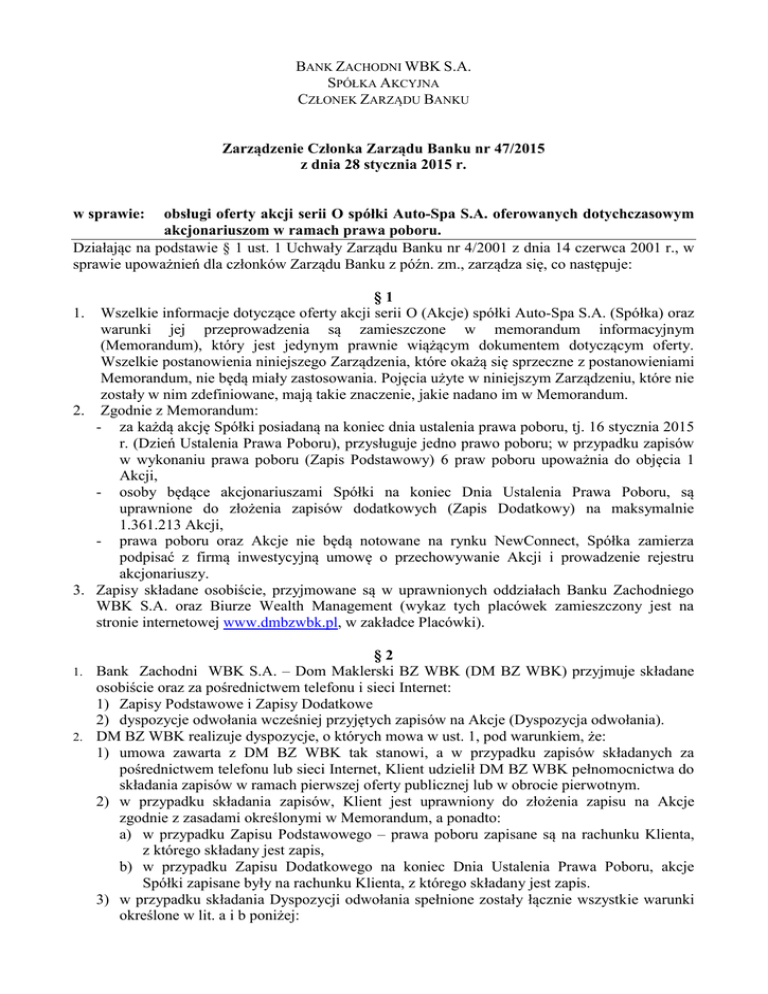 BANK ZACHODNI WBK S.A. SPÓŁKA AKCYJNA CZŁONEK ZARZĄDU BANKU Zarządzenie Członka Zarządu Banku nr 47/2015 z dnia 28 stycznia 2015 r. obsługi oferty akcji serii O spółki Auto-Spa S.A. oferowanych dotychczasowym akcjonariuszom w ramach prawa poboru. Działając na podstawie § 1 ust. 1 Uchwały Zarządu Banku nr 4/2001 z dnia 14 czerwca 2001 r., w sprawie upoważnień dla członków Zarządu Banku z późn. zm., zarządza się, co następuje: w sprawie: §1 1. Wszelkie informacje dotyczące oferty akcji serii O (Akcje) spółki Auto-Spa S.A. (Spółka) oraz warunki jej przeprowadzenia są zamieszczone w memorandum informacyjnym (Memorandum), który jest jedynym prawnie wiążącym dokumentem dotyczącym oferty. Wszelkie postanowienia niniejszego Zarządzenia, które okażą się sprzeczne z postanowieniami Memorandum, nie będą miały zastosowania. Pojęcia użyte w niniejszym Zarządzeniu, które nie zostały w nim zdefiniowane, mają takie znaczenie, jakie nadano im w Memorandum. 2. Zgodnie z Memorandum: - za każdą akcję Spółki posiadaną na koniec dnia ustalenia prawa poboru, tj. 16 stycznia 2015 r. (Dzień Ustalenia Prawa Poboru), przysługuje jedno prawo poboru; w przypadku zapisów w wykonaniu prawa poboru (Zapis Podstawowy) 6 praw poboru upoważnia do objęcia 1 Akcji, - osoby będące akcjonariuszami Spółki na koniec Dnia Ustalenia Prawa Poboru, są uprawnione do złożenia zapisów dodatkowych (Zapis Dodatkowy) na maksymalnie 1.361.213 Akcji, - prawa poboru oraz Akcje nie będą notowane na rynku NewConnect, Spółka zamierza podpisać z firmą inwestycyjną umowę o przechowywanie Akcji i prowadzenie rejestru akcjonariuszy. 3. Zapisy składane osobiście, przyjmowane są w uprawnionych oddziałach Banku Zachodniego WBK S.A. oraz Biurze Wealth Management (wykaz tych placówek zamieszczony jest na stronie internetowej www.dmbzwbk.pl, w zakładce Placówki). §2 1. Bank Zachodni WBK S.A. – Dom Maklerski BZ WBK (DM BZ WBK) przyjmuje składane osobiście oraz za pośrednictwem telefonu i sieci Internet: 1) Zapisy Podstawowe i Zapisy Dodatkowe 2) dyspozycje odwołania wcześniej przyjętych zapisów na Akcje (Dyspozycja odwołania). 2. DM BZ WBK realizuje dyspozycje, o których mowa w ust. 1, pod warunkiem, że: 1) umowa zawarta z DM BZ WBK tak stanowi, a w przypadku zapisów składanych za pośrednictwem telefonu lub sieci Internet, Klient udzielił DM BZ WBK pełnomocnictwa do składania zapisów w ramach pierwszej oferty publicznej lub w obrocie pierwotnym. 2) w przypadku składania zapisów, Klient jest uprawniony do złożenia zapisu na Akcje zgodnie z zasadami określonymi w Memorandum, a ponadto: a) w przypadku Zapisu Podstawowego – prawa poboru zapisane są na rachunku Klienta, z którego składany jest zapis, b) w przypadku Zapisu Dodatkowego na koniec Dnia Ustalenia Prawa Poboru, akcje Spółki zapisane były na rachunku Klienta, z którego składany jest zapis. 3) w przypadku składania Dyspozycji odwołania spełnione zostały łącznie wszystkie warunki określone w lit. a i b poniżej: a) w przypadku składania Dyspozycji odwołania, z przyczyn wskazanych w art. 51a Ustawy z dnia 29 lipca 2005 r. o ofercie publicznej i warunkach wprowadzania instrumentów finansowych do zorganizowanego systemu obrotu oraz o spółkach publicznych (t.j. Dz. U. z 2013, poz. 1382 z późn. zm.) (Ustawa), zaistniały przesłanki upoważniające do odwołania zapisu zgodnie z art. 51a Ustawy, określone w Memorandum, b) dyspozycja zawiera imię i nazwisko lub nazwę Klienta, numer rachunku papierów wartościowych Klienta oraz parametry odwoływanej Dyspozycji zapisu. 3. Składane przez Klienta zapisy oraz Dyspozycje odwołania nie mogą zawierać żadnych zastrzeżeń. §3 1. Składając zapis Klient określa w szczególności liczbę Akcji, a także oświadcza, że: zapoznał się z treścią Memorandum i akceptuje warunki publicznej subskrypcji Akcji; zna treść Statutu Spółki i wyraża zgodę na jego brzmienie oraz na przystąpienie do Spółki; zgadza się na przydzielenie lub nie przydzielenie mu Akcji, zgodnie z warunkami zawartymi w Memorandum. Nieprzydzielenie Akcji lub przydzielenie mniejszej ich liczby może nastąpić wyłącznie w następstwie zastosowania zasad przydziału Akcji opisanych w Memorandum; wyraża zgodę na zdeponowanie w firmie inwestycyjnej Akcji, które zostaną mu przydzielone przez Spółkę wyraża zgodę na przetwarzanie danych osobowych w zakresie niezbędnym do przeprowadzenia emisji Akcji Spółki, w przypadku zapisów składanych za pośrednictwem telefonu lub sieci Internet – zapoznał się z treścią niniejszego Zarządzenia oraz wyraża zgodę na jego brzmienie. 2. Składając Dyspozycję odwołania Klient potwierdza, że: - w przypadku Dyspozycji odwołania składanych za pośrednictwem telefonu lub sieci Internet – zapoznał się z treścią niniejszego Zarządzenia oraz zna warunki realizacji Dyspozycji odwołania określone w § 2 niniejszego Zarządzenia i wyraża zgodę na ich brzmienie, - przyjął do wiadomości, że w przypadku zrealizowania Dyspozycji odwołania, zapis którego ta Dyspozycja dotyczy zostanie odwołany, - przyjął do wiadomości, że złożenie Dyspozycji odwołania jest nieodwołalne. 3. DM BZ WBK nie ponosi odpowiedzialności za przydzielenie mniejszej liczby Akcji niż określona w zapisie lub za nieprzydzielenie ich w ogóle, zgodnie z odpowiednimi zapisami Memorandum. 1. 2. §4 Za wyjątkiem zapisów opłacanych w drodze umownego potrącenia wierzytelności, środki na opłacenie zapisu DM BZ WBK pobiera z rachunku Klienta, z którego składany jest zapis, w chwili składania tego zapisu. Na opłacenie zapisu wykorzystane mogą być jedynie wolne środki finansowe. W systemie “Inwestor online”, środki takie oznaczone są jako “Środki pod wypłatę lub zlecenia na rynek terminowy”. Za wyjątkiem zapisów opłacanych w drodze umownego potrącenia wierzytelności, środki w wysokości r