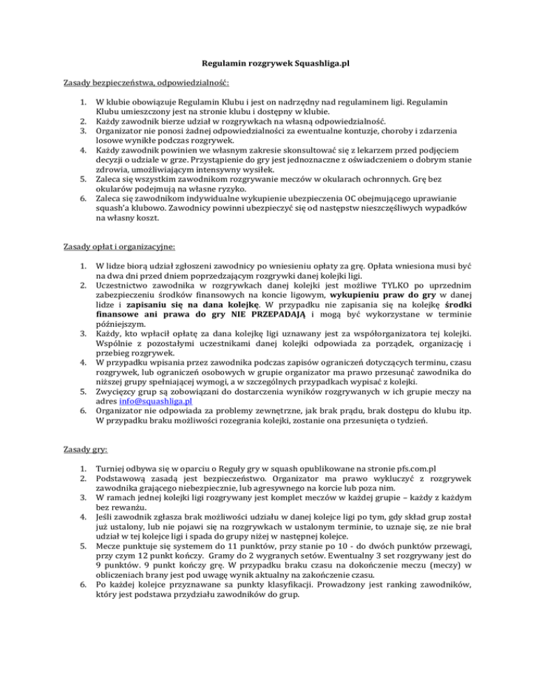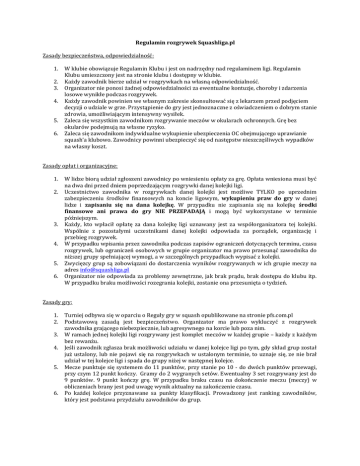 Regulamin rozgrywek Squashliga.pl Zasady bezpieczeństwa