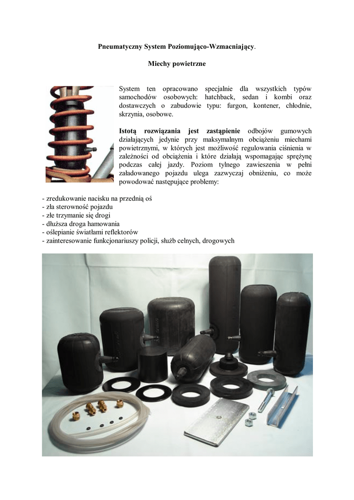 Pneumatyczny System Poziomująco-Wzmacniający. Miechy powietrzne System ten opracowano specjalnie dla wszystkich typów samochodów osobowych: hatchback, sedan i kombi oraz dostawczych o zabudowie typu: furgon, kontener, chłodnie, skrzynia, osobowe. Istotą rozwiązania jest zastąpienie odbojów gumowych działających jedynie przy maksymalnym obciążeniu miechami powietrznymi, w których jest możliwość regulowania ciśnienia w zależności od obciążenia i które działają wspomagając sprężynę podczas całej jazdy. Poziom tylnego zawieszenia w pełni załadowanego pojazdu ulega zazwyczaj obniżeniu, co może powodować następujące problemy: - zredukowanie nacisku na przednią oś - zła sterowność pojazdu - złe trzymanie się drogi - dłuższa droga hamowania - oślepianie światłami reflektorów - zainteresowanie funkcjonariuszy policji, służb celnych, drogowych Dzięki zastosowaniu miechów powietrznych, przy różnych obciążeniach, pojazd znajduje się w równowadze. Zalety systemu to: - zwiększona stabilność, amortyzacja i sterowność - spadek czułości na boczny wiatr i przechyły - polepszone trzymanie się drogi - prawidłowy rozkład obciążenia na przedni i tylny oś, - optymalne siły hamowania - eliminuje "siadanie" sprężyn i innych podzespołów - eliminuje niedoskonałość drogi - eliminuje oślepianie światłami reflektorów - zmniejsza ryzyko zapłacenia mandatu karnego. Ten prosty w obsłudze i montażu (nadaje się do samodzielnego montażu) system wykorzystuje rozwiązania konstrukcyjne podwozia, zwiększa komfort i bezpieczeństwo jazdy. Miechy powietrzne budowane są z gumy i są zaopatrywane wentylem do ustawienia odpowiedniego ciśnienia. Miechy powietrzne mogą być zastosowane w różnych typach samochodów, jak np. Alfa Romeo, Audi, BMW, Chevrolet, Daewoo, Fiat, Ford, Mercedes, Mitsubishi, Opel, Renault, Saab, Seat, Skoda, SsangYong, Suzuki, Toyota, Volvo, Volkswagen.