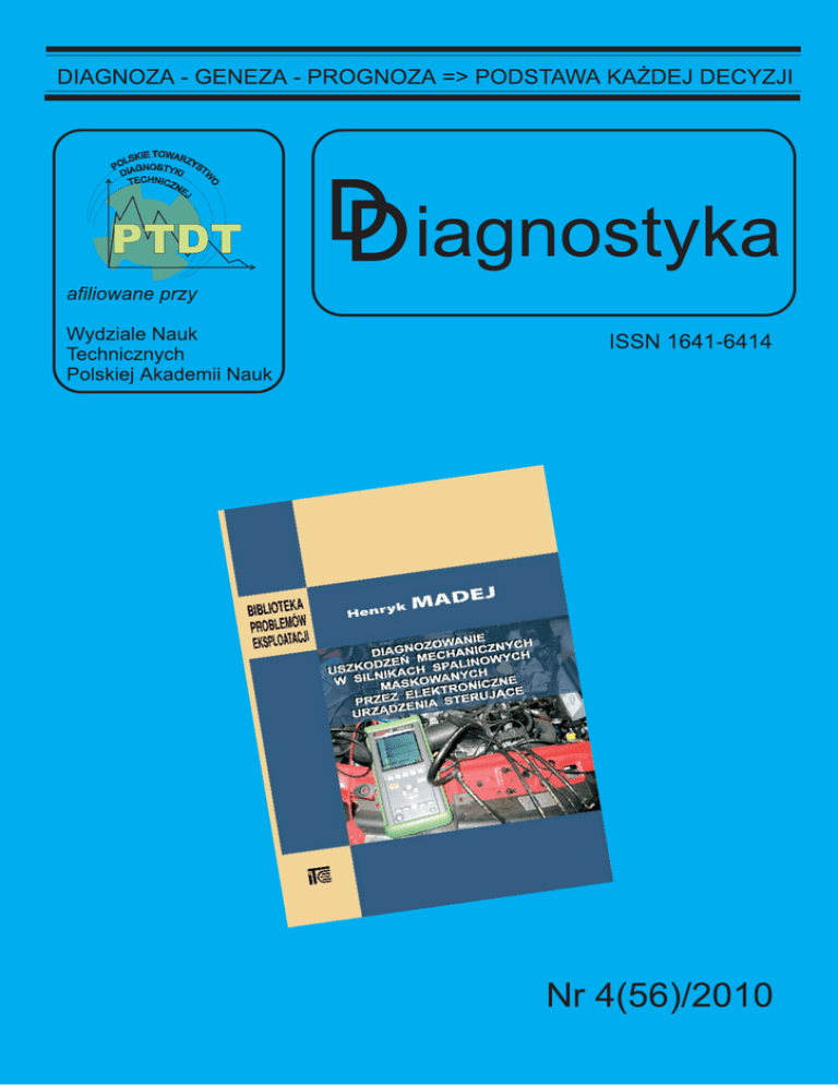 RADA PROGRAMOWA / PROGRAM COUNCIL PRZEWODNICZĄCY / CHAIRMAN: prof. dr hab. dr h.c. mult. Czesław CEMPEL Politechnika Poznańska REDAKTOR NACZELNY / CHIEF EDITOR: prof. dr hab. inż. Ryszard MICHALSKI UWM w Olsztynie CZŁONKOWIE / MEMBERS: prof. dr hab. inż. Jan ADAMCZYK AGH w Krakowie prof. dr hab. inż. Jerzy KISILOWSKI Politechnika Warszawska prof. Jérôme ANTONI University of Technology of Compiegne – France prof. dr hab. inż. Daniel KUJAWSKI Western Michigan University – USA prof. dr. Ioannis ANTONIADIS National Technical University Of Athens – Greece prof. dr hab. Wojciech MOCZULSKI Politechnika Śląska dr inż. Roman BARCZEWSKI Politechnika Poznańska prof. dr hab. inż. Stanisław NIZIŃSKI UWM w Olsztynie prof. dr hab. inż. Walter BARTELMUS Politechnika Wrocławska prof. dr hab. inż. Stanisław RADKOWSKI Politechnika Warszawska prof. dr hab. inż. Wojciech BATKO AGH w Krakowie prof. Bob RANDALL University of South Wales – Australia prof. dr hab. inż. Lesław BĘDKOWSKI WAT Warszawa prof. dr Raj B. K. N. RAO President COMADEM International – England prof. dr hab. inż. Adam CHARCHALIS Akademia Morska w Gdyni prof. Vasily S. SHEVCHENKO BSSR Academy of Sciences Mińsk – Belarus prof. dr hab. inż. Wojciech CHOLEWA Politechnika Śląska prof. Menad SIDAHMED University of Technology Compiegne – France prof. dr hab. inż. Zbigniew DĄBROWSKI Politechnika Warszawska Prof. Wiesław TRĄMPCZYŃSKI Politechnika Świętokrzyska prof. Wiktor FRID Royal Institute of Technology in Stockholm – Sweden prof. dr hab. inż. Tadeusz UHL AGH w Krakowie dr inż. Tomasz GAŁKA Instytut Energetyki w Warszawie prof. Vitalijus VOLKOVAS Kaunas University of Technology – Lithuania prof. Len GELMAN Cranfield University – England prof. dr hab. inż. Andrzej WILK Politechnika Śląska prof. Mohamed HADDAR National School of Engineers of Sfax – Tunisia dr Gajraj Singh YADAVA Indian Institute of Technology – India prof. dr hab. inż. Jan KICIŃSKI IMP w Gdańsku prof. dr hab. inż. Bogdan ŻÓŁTOWSKI UTP w Bydgoszczy WYDAWCA: Polskie Towarzystwo Diagnostyki Technicznej ul. Narbutta 84 02-524 Warszawa SEKRETARZ REDAKCJI: dr inż. Sławomir WIERZBICKI ADRES REDAKCJI: Redakcja Diagnostyki Katedra Budowy, Eksploatacji Pojazdów i Maszyn UWM w Olsztynie ul. Oczapowskiego 11 10-736 Olsztyn, Poland tel.: 89-523-48-11, fax: 89-523-34-63 www.diagnostyka.net.pl e-mail: [email protected] CZŁONKOWIE KOMITETU REDAKCYJNEGO: dr inż. Krzysztof LIGIER dr inż. Paweł MIKOŁAJCZAK KONTO PTDT: Bank PEKAO SA O/Warszawa nr konta: 33 1240 5963 1111 0000 4796 8376 REDAKTOR NACZELNY: prof. dr hab. inż. Ryszard MICHALSKI NAKŁAD: 500 egzemplarzy Wydanie dofinansowane przez Ministra Nauki i Szkolnictwa Wyższego DIAGNOSTYKA’ 4(56)/2010 Spis treści / Contents Czesław CEMPEL, Maciej TABASZEWSKI − Politechnika Poznańska ...............................................................3 Singular spectrum analysis as a smoothing method of load variability Analiza widma szczególnego jako metoda wygładzania zmienności obciążenia Damian SKUPNIK − Politechnika Śląska ...............................................................................................................9 An application example of a multiaspect diagnostic model Przykład zastosowania wieloaspektowego modelu diagnostycznego Andrzej KLEPKA, Łukasz AMBROZIŃSKI − Akademia Górniczo-Hutnicza w Krakowie................................17 Selection of piezoceramic sensor parameters for damage detection and localization system Dobór parametrów przetworników piezoceramicznych do systemu detekcji i lokalizacji uszkodzeń Andrzej KATUNIN − Politechnika Śląska ............................................................................................................23 Numerical study of the fatigue delamination growth considering thermal phenomena Analiza numeryczna zmęczeniowego przyrostu delaminacji z uwzględnieniem zjawisk cieplnych Andrzej KAZMIERCZAK, Krzysztof MIKSIEWICZ, Radosław WRÓBEL − Politechnika Wrocławska ..........27 The diagnosis of EGR system’s failuers depended on detection and measure of vibroacustic vibrations Diagnostyka usterek układu EGR na podstawie detekcji i pomiarów drgań wibroakustycznych Mariusz GIBIEC, Tomasz BARSZCZ, Marzena BIELECKA − Akademia Górniczo-Hutnicza w Krakowie......37 Selection of clustering methods for wind turbines operational data Dobór metod grupowania danych procesowych dla turbin wiatrowych Jakub KOMODA, Jacek DYBAŁA − Politechnika Warszawska..........................................................................43 Image change detection as a supplement for adaptive cruise control with stop&go functionality Wykrywanie zmiany obrazu jako uzupełnienie systemu tempomatu adaptacyjnego z funkcją stop&go Justyna BERLIŃSKA − Zachodniopomorski Uniwersytet Technologiczny w Szczecinie ...................................49 Determining the optimal load of machines and devices in the production system Wyznaczanie optymalnego obciążenia maszyn i urządzeń w systemie produkcyjnym Tomasz BARSZCZ, Jacek URBANEK, Łukasz SZUMILAS − Akademia Górniczo-Hutnicza w Krakowie ......55 Selection of efficient monitoring methods for machinery generating high vibration signal disturbance Dobór efektywnych metod monitoringu dla maszyn generujących silne zakłócenia sygnałów drganiowych Witold CIOCH Piotr KRZYWORZEKA − Akademia Górniczo-Hutnicza w Krakowie ......................................59 Sighting through as part of shaft alignment procedure PLD we wspomaganiu demodulacji drgań silnika okrętowego Eliza JARYSZ-KAMIŃSKA − Zachodniopomorski Uniwersytet Technologiczny w Szczecinie ........................65 Sighting through as part of shaft alignment procedure Wyznaczanie linii odniesienia jako element procedury osiowania wałów Wojciech BATKO, Tomasz KORBIEL, Jerzy STOJEK − Akademia Górniczo-Hutnicza w Krakowie...............69 Trajektoria fazowa jako n