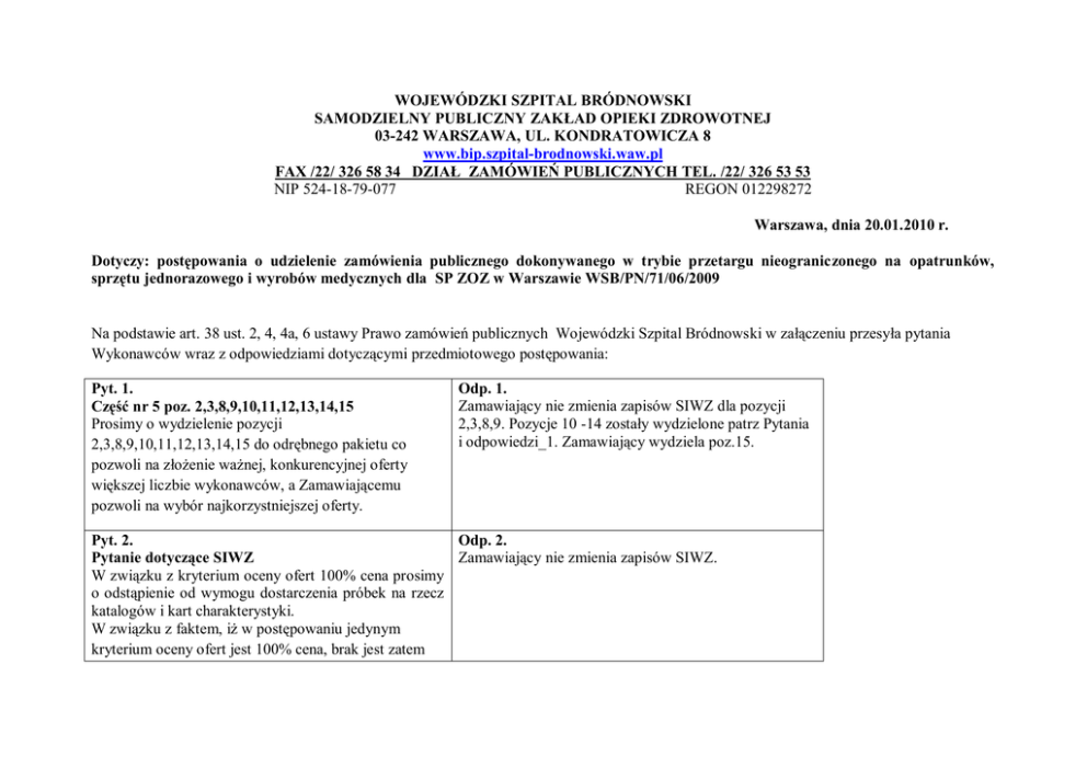 WOJEWÓDZKI SZPITAL BRÓDNOWSKI SAMODZIELNY PUBLICZNY ZAKŁAD OPIEKI ZDROWOTNEJ 03-242 WARSZAWA, UL. KONDRATOWICZA 8 www.bip.szpital-brodnowski.waw.pl FAX /22/ 326 58 34 DZIAŁ ZAMÓWIEŃ PUBLICZNYCH TEL. /22/ 326 53 53 NIP 524-18-79-077 REGON 012298272 Warszawa, dnia 20.01.2010 r. Dotyczy: postępowania o udzielenie zamówienia publicznego dokonywanego w trybie przetargu nieograniczonego na opatrunków, sprzętu jednorazowego i wyrobów medycznych dla SP ZOZ w Warszawie WSB/PN/71/06/2009 Na podstawie art. 38 ust. 2, 4, 4a, 6 ustawy Prawo zamówień publicznych Wojewódzki Szpital Bródnowski w załączeniu przesyła pytania Wykonawców wraz z odpowiedziami dotyczącymi przedmiotowego postępowania: Pyt. 1. Część nr 5 poz. 2,3,8,9,10,11,12,13,14,15 Prosimy o wydzielenie pozycji 2,3,8,9,10,11,12,13,14,15 do odrębnego pakietu co pozwoli na złożenie ważnej, konkurencyjnej oferty większej liczbie wykonawców, a Zamawiającemu pozwoli na wybór najkorzystniejszej oferty. Odp. 1. Zamawiający nie zmienia zapisów SIWZ dla pozycji 2,3,8,9. Pozycje 10 -14 zostały wydzielone patrz Pytania i odpowiedzi_1. Zamawiający wydziela poz.15. Pyt. 2. Odp. 2. Zamawiający nie zmienia zapisów SIWZ. Pytanie dotyczące SIWZ W związku z kryterium oceny ofert 100% cena prosimy o odstąpienie od wymogu dostarczenia próbek na rzecz katalogów i kart charakterystyki. W związku z faktem, iż w postępowaniu jedynym kryterium oceny ofert jest 100% cena, brak jest zatem podstawy prawnej do żądania przez zamawiającego próbek, gdyż nie jest to dokument niezbędny do prawidłowego przeprowadzania postępowania. Gdyby bowiem próbki były niezbędne dla zamawiającego do prawidłowego przeprowadzenia postępowania, wówczas obok kryterium ceny wskazane zostałoby dodatkowe kryterium – jakość czy funkcjonalność. Pyt. 3. Odp. 3. Zamawiający nie zmienia zapisów SIWZ. Pytanie dotyczące warunków umowy Prosimy o zmianę zapisu we wzorze umowy w § 7 pkt. 1 na zapis o brzemieniu: 1. Zamawiający zastrzega sobie stosowanie następujących kar umownych: 1. Za odstąpienie od umowy przez Wykonawcę, Wykonawca zapłaci karę umowną w wysokości 5%wynagrodzenia brutto za niezrealizowaną część umowy określonej w § 5 ust. 1 pkt. 2, 2. W przypadku odstąpienia od umowy przez Zamawiającego z przyczyn, za które odpowiedzialność ponosi Wykonawca, Wykonawca zapłaci Zamawiającemu karę umowną w wysokości 5%wynagrodzenia brutto za niezrealizowaną część umowy określoną w § 5 ust. 1 pkt. 2. 3. Wykonawca zapłaci karę umowną za zwłokę w realizacji dostawy w stosunku do terminu określonego przez zamawiającego w wysokości 0,2% wynagrodzenia brutto niezrealizowanej części Zamówienia za 4. każdy dzień zwłoki. Za zwłokę usunięcia wad stwierdzonych przy odbiorze Wykonawca zapłaci zamawiającemu karę umowną w wysokości 0,2% wynagrodzenia brutto za wadliwą część zamówienia, za każdy dzień zwłoki. W przypadku pierwotnego zapisu tego postanowienia, należy podnieść, że kara umowna może zostać zgodnie z art. 483 na wypadek niewykonania lub nienależytego wykonania umowy, jako naprawienie poniesionej z tego tytułu przez wierzyciela szkody. Zgodnie z art. 484 § 2 kara umowna nie może być rażąco wygórowana w takim przypadku, gdy wartość ewentualnej szkody jaką wierzyciel może w danym przypadku niewykonania zobowiązania odnieść jest zdecydowanie niższa niż wartość kary. Pierwotny zapis umowy jest krzywdzący dla Wykonawców. W razie odstąpienia od umowy już w części wykonanej nie można żądać zapłaty karty stanowiącej procent od całej wartości umowy, ponieważ taka kara będzie rażąco wygórowana, w im większym rozmiarze umowa została wykonana, w tym mniejsza jest szkoda jaka odnosi zamawiający w razie odstąpienia od umowy. W związku z powyższym prosimy o modyfikację tego zapisu. Pyt. 4. Odp. 4. Czy w związku z dopuszczeniem przez zamawiającego Zamawiający nie zmienia zapisów SIWZ. możliwości składania ofert częściowych na każdy z pakietów z osobna, Zamawiający przewiduje możliwość podpisania z jednym wykonawcą oddzielnych umów na poszczególne pakiety? W razie udzielenia na powyższe pytanie odpowiedzi odmownej, w związku z dopuszczeniem przez zamawiającego składania ofert częściowych na każdy z pakietów z osobna, uprzejmie prosimy o wyrażenie przez Zamawiającego zgody na wprowadzenie w treści umowy obejmującej wszystkie pakiety, w ramach których konkretnemu wykonawcy zostało udzielone zamówienie, poniższego zapisu: „Realizacja każdego z pakietów z osobna ma charter samodzielnego zobowiązania stron”. Pyt. 5. Odp. 5. Zamawiający wyraża zgodę na wydzielenie z części nr 7 Część nr 7 poz. 3,4,5,23,24,25,42,43,44 Czy Zamawiający wydzieli z części nr 7 sprzęt pozycje o numerach 3,4,5,23,24,25,42,43,44. jednorazowy pozycje 3,4,5,23,24,25,42,43,44 (sprzęt do znieczuleń) i utworzy z nich oddzielny pakiet? Umożliwi to na złożenie konkurencyjnych ofert przez więcej wykonawców. Przepisy Ustawy o zamówieniach publicznych w art. 17 nakładają na Zamawiającego, który przystępuje do udzielenia zamówienia publicznego, obowiązek zobiektywizowanego określenia przedmiotu zamówienia. W świetle stanu prawnego jest niewątpliwym, iż obowiązkiem Zamawiającego jest takie sprecyzowanie specyfikacji istotnych warunków zamówienia, aby stwarzała możliwość złożenia oferty przez różnych dostawców, oferty zawierającej artykuły o porównywalnych parametrach technicznych i tych samych funkcjach bez wyraźnego wskazania producenta. W przedmiotowej sprawie zdefiniowanie przedmiotu zamówienia jest wadliwe i narusza wskazane wyżej zapisy ustawowe. Jest oczywistym, iż podany opis przedmiotu zamówienia, skonstruowanie pakietów w obecnej formie nie ma merytorycznego znaczenia w żaden sposób nie zapewnia uczciwej konkurencji a jednoznacznie wskazuje wybór Zamawiającego dokonany już na eta