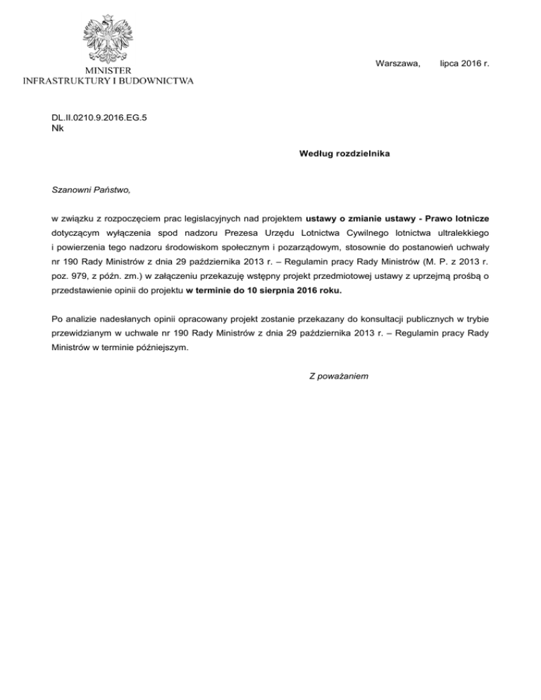 Warszawa, lipca 2016 r. DL.II.0210.9.2016.EG.5 Nk Według rozdzielnika Szanowni Państwo, w związku z rozpoczęciem prac legislacyjnych nad projektem ustawy o zmianie ustawy - Prawo lotnicze dotyczącym wyłączenia spod nadzoru Prezesa Urzędu Lotnictwa Cywilnego lotnictwa ultralekkiego i powierzenia tego nadzoru środowiskom społecznym i pozarządowym, stosownie do postanowień uchwały nr 190 Rady Ministrów z dnia 29 października 2013 r. – Regulamin pracy Rady Ministrów (M. P. z 2013 r. poz. 979, z późn. zm.) w załączeniu przekazuję wstępny projekt przedmiotowej ustawy z uprzejmą prośbą o przedstawienie opinii do projektu w terminie do 10 sierpnia 2016 roku. Po analizie nadesłanych opinii opracowany projekt zostanie przekazany do konsultacji publicznych w trybie przewidzianym w uchwale nr 190 Rady Ministrów z dnia 29 października 2013 r. – Regulamin pracy Rady Ministrów w terminie późniejszym. Z poważaniem Otrzymują: 1) Aeroklub Polski, 2) Aeroklub Rzeczypospolitej Polskiej, 3) Business Center Club – Związek Pracodawców, 4) Forum Związków Zawodowych, 5) IATA Polska, 6) Instytut Meteorologii i Gospodarki Wodnej PIB, 7) Krajowa Rada Lotnictwa, 8) Krajowe Towarzystwo Lotnicze AOPA POLAND, 9) NSZZ „Solidarność”, 10) Ogólnopolskie Porozumienie Związków Zawodowych, 11) Pracodawcy Rzeczypospolitej Polskiej, 12) Polska Konfederacja Pracodawców Prywatnych – Lewiatan, 13) Polska Agencja Żeglugi Powietrznej, 14) Polski Klub Lotniczy ul. Świeradowska 43, 15) Polskie Centrum Kształcenia Lotniczego, 16) Polskie Centrum Badań i Certyfikacji, 17) Polskie Stowarzyszenie Motoszybowcowe, 18) Polskie Stowarzyszenie Paralotniowe, 19) Stowarzyszenie Lotnictwa Eksperymentalnego EAA 991, 20) Stowarzyszenie Instruktorów Lotniowych i Paralotniowych, 21) Stowarzyszenie Mechaników Lotniczych „SML”, 22) Związek Polskich Spadochroniarzy, 23) Związek Rzemiosła Polskiego, 24) Związek Regionalnych Portów Lotniczych, 25) RFgroup Kancelaria Ułatwień Lotniczych, 26) Aeroklub Krainy Jezior.