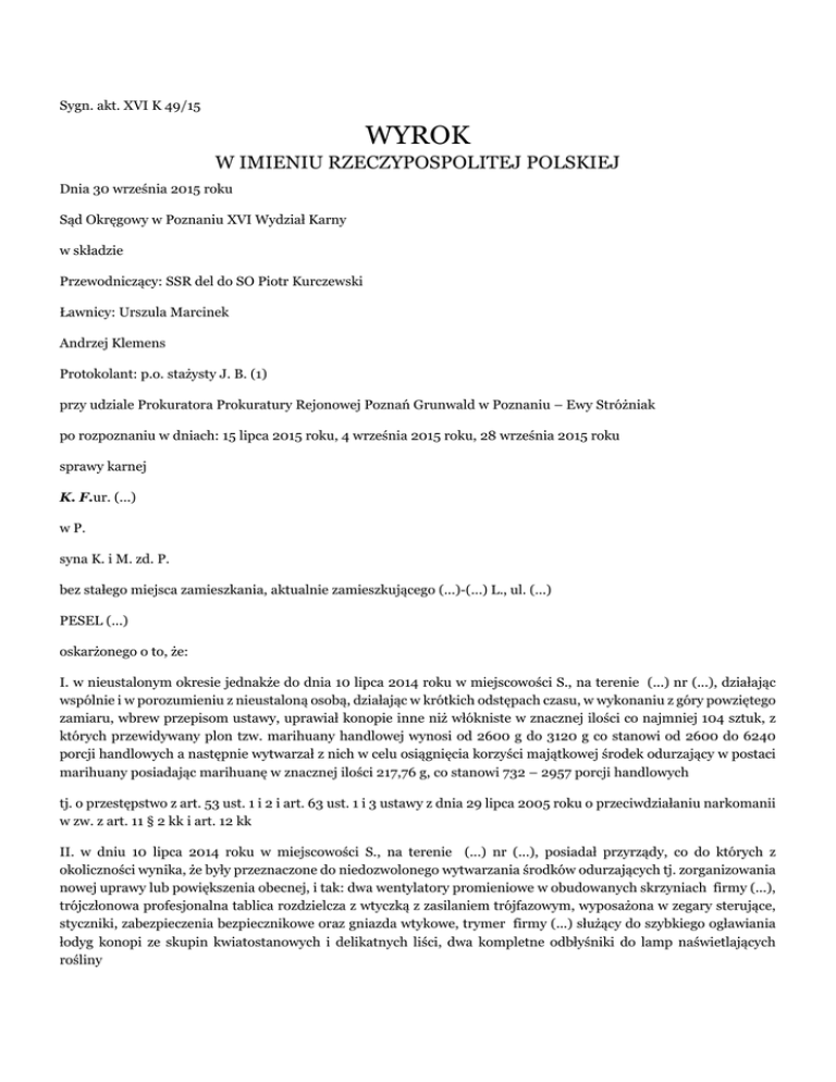 Sygn. akt. XVI K 49/15 WYROK W IMIENIU RZECZYPOSPOLITEJ POLSKIEJ Dnia 30 września 2015 roku Sąd Okręgowy w Poznaniu XVI Wydział Karny w składzie Przewodniczący: SSR del do SO Piotr Kurczewski Ławnicy: Urszula Marcinek Andrzej Klemens Protokolant: p.o. stażysty J. B. (1) przy udziale Prokuratora Prokuratury Rejonowej Poznań Grunwald w Poznaniu – Ewy Stróżniak po rozpoznaniu w dniach: 15 lipca 2015 roku, 4 września 2015 roku, 28 września 2015 roku sprawy karnej K. F.ur. (...) w P. syna K. i M. zd. P. bez stałego miejsca zamieszkania, aktualnie zamieszkującego (...)-(...) L., ul. (...) PESEL (...) oskarżonego o to, że: I. w nieustalonym okresie jednakże do dnia 10 lipca 2014 roku w miejscowości S., na terenie (...) nr (...), działając wspólnie i w porozumieniu z nieustaloną osobą, działając w krótkich odstępach czasu, w wykonaniu z góry powziętego zamiaru, wbrew przepisom ustawy, uprawiał konopie inne niż włókniste w znacznej ilości co najmniej 104 sztuk, z których przewidywany plon tzw. marihuany handlowej wynosi od 2600 g do 3120 g co stanowi od 2600 do 6240 porcji handlowych a następnie wytwarzał z nich w celu osiągnięcia korzyści majątkowej środek odurzający w postaci marihuany posiadając marihuanę w znacznej ilości 217,76 g, co stanowi 732 – 2957 porcji handlowych tj. o przestępstwo z art. 53 ust. 1 i 2 i art. 63 ust. 1 i 3 ustawy z dnia 29 lipca 2005 roku o przeciwdziałaniu narkomanii w zw. z art. 11 § 2 kk i art. 12 kk II. w dniu 10 lipca 2014 roku w miejscowości S., na terenie (...) nr (...), posiadał przyrządy, co do których z okoliczności wynika, że były przeznaczone do niedozwolonego wytwarzania środków odurzających tj. zorganizowania nowej uprawy lub powiększenia obecnej, i tak: dwa wentylatory promieniowe w obudowanych skrzyniach firmy (...), trójczłonowa profesjonalna tablica rozdzielcza z wtyczką z zasilaniem trójfazowym, wyposażona w zegary sterujące, styczniki, zabezpieczenia bezpiecznikowe oraz gniazda wtykowe, trymer firmy (...) służący do szybkiego ogławiania łodyg konopi ze skupin kwiatostanowych i delikatnych liści, dwa kompletne odbłyśniki do lamp naświetlających rośliny tj. o przestępstwo z art. 54 ust. 1 ustawy z dnia 29 lipca 2005 roku o przeciwdziałaniu narkomanii III. w dniu 10 lipca 2014 roku w miejscowości S.na terenie (...) nr (...), dokonał naruszenia nietykalności cielesnej funkcjonariusza policji – sierż. sztab. Ł. Z.i sierż. R. K. (1)podczas i w związku z pełnieniem przez nich obowiązków służbowych w ten sposób, że zadawał ciosy w klatkę piersiową, brzuch, ramiona , odpychał, kopał a nadto przytrzasnął drzwiami lewą stopę Ł. Z. tj. o przestępstwo z art. 222 § 1 kk IV. w okresie od miesiąc czerwca 2013 roku do dnia 10 lipca 2014 roku w S., w krótkich odstępach czasu w wykonaniu z góry powziętego zamiaru, wbrew przepisom ustawy, udzielił M. W. (1)środek odurzający w postaci marihuany co najmniej kilkanaście razy w ilościach od 1 do 3 gramów tj. o przestępstwo z art. 58 ust. 1 ustawy z dnia 29 lipca 2005 roku o przeciwdziałaniu narkomanii w zw. z art. 12 kk 1.Uznaje oskarżonego K. F.za winnego tego, że w nieustalonym okresie jednakże od co najmniej czerwca 2013 roku do dnia 10 lipca 2014 roku w miejscowości S., na terenie (...) nr (...), działając w krótkich odstępach czasu, w wykonaniu z góry powziętego zamiaru, wbrew przepisom ustawy, uprawiał konopie inne niż włókniste w znacznej ilości - co najmniej 104 sztuk, która to uprawa mogła dostarczyć znaczną ilość środka odurzającego w postaci marihuany tj. co najmniej 2600 gram, a z której to uprawy wytworzył w celu osiągnięcia korzyści majątkowej znaczną ilość środka odurzającego w postaci marihuany tj. co najmniej 140,13 grama tj. przestępstwa z art. 63 ust. 1 i 3 oraz art. 53 ust. 1 i 2 ustawy z dnia 29 lipca 2005 roku o przeciwdziałaniu narkomanii w zw. z art. 11 § 2 kk i art. 12 kk i za to na podstawie art. 11 § 3 kk w zw. z art. 53 ust. 2 ustawy z dnia 29 lipca 2005 roku o przeciwdziałaniu narkomanii wymierza mu karę 3 (trzech) lat pozbawienia wolności i 200 (dwustu) stawek dziennych grzywny przy ustaleniu wysokości jednej stawki dziennej na kwotę 20 (dwudziestu) złotych. 2. Na podstawie art. 70 ust. 4 ustawy z dnia 29 lipca 2005 roku o przeciwdziałaniu narkomanii orzeka od oskarżonego na rzecz (...) Centrum Pomocy (...) w R., na cele związane z zapobieganiem i zwalczaniem narkomanii nawiązkę w kwocie 2000 (dwóch tysięcy) złotych. 3. Uznaje oskarżonego K. F.za winnego tego, że w dniu 10 lipca 2014 roku w miejscowości S., na terenie (...) nr (...), posiadał przyrządy w postaci suszarki nylonowej ośmiopółkowej oraz trymera firmy (...)służącego do szybkiego ogławiania łodyg konopi ze skupin kwiatostanowych i delikatnych liści, co do których z okoliczności wynika, że były przeznaczone do niedozwolonego wytwarzania środków odurzających tj. występku z art. 54 ust. 1 ustawy z dnia 29 lipca 2005 roku o przeciwdziałaniu narkomanii i za to na podstawie art. 54 ust. 1 ustawy z dnia 29 lipca 2005 roku o przeciwdziałaniu narkomanii wymierza mu karę 3 (trzech) miesięcy pozbawienia wolności. 4. Uznaje oskarżonego K. F.za winnego zarzucanego mu czynu popełnionego w sposób opisany w punkcie III tj. występku z art. 222 § 1 kk i za to na podstawie art. 222 § 1 kk wymierza mu karę 6 (sześciu) miesięcy pozbawienia wolności. 5. Na podstawie art. 46 § 2 kk ( w brzemieniu z dnia 30 czerwca 2015 roku) orzeka od oskarżonego na rzecz pokrzywdzonych Ł. Z.oraz R. K. (1)nawiązkę w kwocie po 500 (pięćset) złotych tytułem zadośćuczynienia. 6. Uznaje oskarżonego K. F.za winnego zarzucanego mu czynu popełnionego w sposób opisany w punkcie IV tj. występku z art. 58 ust. 1 ustawy z dnia 29 lipca 2005 roku o przeciwdziałaniu narkomanii w zw. z art. 12 kk i za to na podstawie art. 58 ust. 1 ustawy z dnia 29 lipca 2005