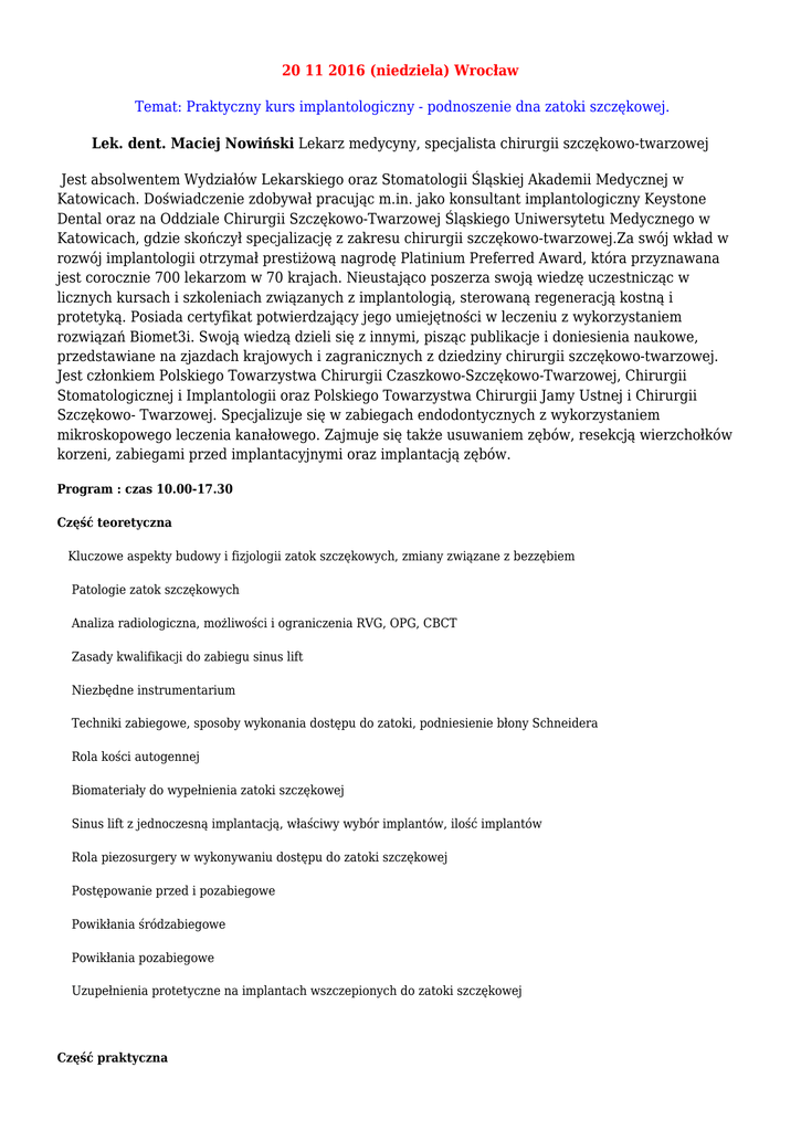 20 11 2016 (niedziela) Wrocław Temat: Praktyczny kurs implantologiczny - podnoszenie dna zatoki szczękowej. Lek. dent. Maciej Nowiński Lekarz medycyny, specjalista chirurgii szczękowo-twarzowej Jest absolwentem Wydziałów Lekarskiego oraz Stomatologii Śląskiej Akademii Medycznej w Katowicach. Doświadczenie zdobywał pracując m.in. jako konsultant implantologiczny Keystone Dental oraz na Oddziale Chirurgii Szczękowo-Twarzowej Śląskiego Uniwersytetu Medycznego w Katowicach, gdzie skończył specjalizację z zakresu chirurgii szczękowo-twarzowej.Za swój wkład w rozwój implantologii otrzymał prestiżową nagrodę Platinium Preferred Award, która przyznawana jest corocznie 700 lekarzom w 70 krajach. Nieustająco poszerza swoją wiedzę uczestnicząc w licznych kursach i szkoleniach związanych z implantologią, sterowaną regeneracją kostną i protetyką. Posiada certyfikat potwierdzający jego umiejętności w leczeniu z wykorzystaniem rozwiązań Biomet3i. Swoją wiedzą dzieli się z innymi, pisząc publikacje i doniesienia naukowe, przedstawiane na zjazdach krajowych i zagranicznych z dziedziny chirurgii szczękowo-twarzowej. Jest członkiem Polskiego Towarzystwa Chirurgii Czaszkowo-Szczękowo-Twarzowej, Chirurgii Stomatologicznej i Implantologii oraz Polskiego Towarzystwa Chirurgii Jamy Ustnej i Chirurgii Szczękowo- Twarzowej. Specjalizuje się w zabiegach endodontycznych z wykorzystaniem mikroskopowego leczenia kanałowego. Zajmuje się także usuwaniem zębów, resekcją wierzchołków korzeni, zabiegami przed implantacyjnymi oraz implantacją zębów. Program : czas 10.00-17.30 Część teoretyczna Kluczowe aspekty budowy i fizjologii zatok szczękowych, zmiany związane z bezzębiem Patologie zatok szczękowych Analiza radiologiczna, możliwości i ograniczenia RVG, OPG, CBCT Zasady kwalifikacji do zabiegu sinus lift Niezbędne instrumentarium Techniki zabiegowe, sposoby wykonania dostępu do zatoki, podniesienie błony Schneidera Rola kości autogennej Biomateriały do wypełnienia zatoki szczękowej Sinus lift z jednoczesną implantacją, właściwy wybór implantów, ilość implantów Rola piezosurgery w wykonywaniu dostępu do zatoki szczękowej Postępowanie przed i pozabiegowe Powikłania śródzabiegowe Powikłania pozabiegowe Uzupełnienia protetyczne na implantach wszczepionych do zatoki szczękowej Część praktyczna Podniesienie zatoki szczękowej na modelu i wszczepienie implantów Sterowana regeneracja kości (użycie piezosurgery i biomateriałów) na materiale zwierzęcym