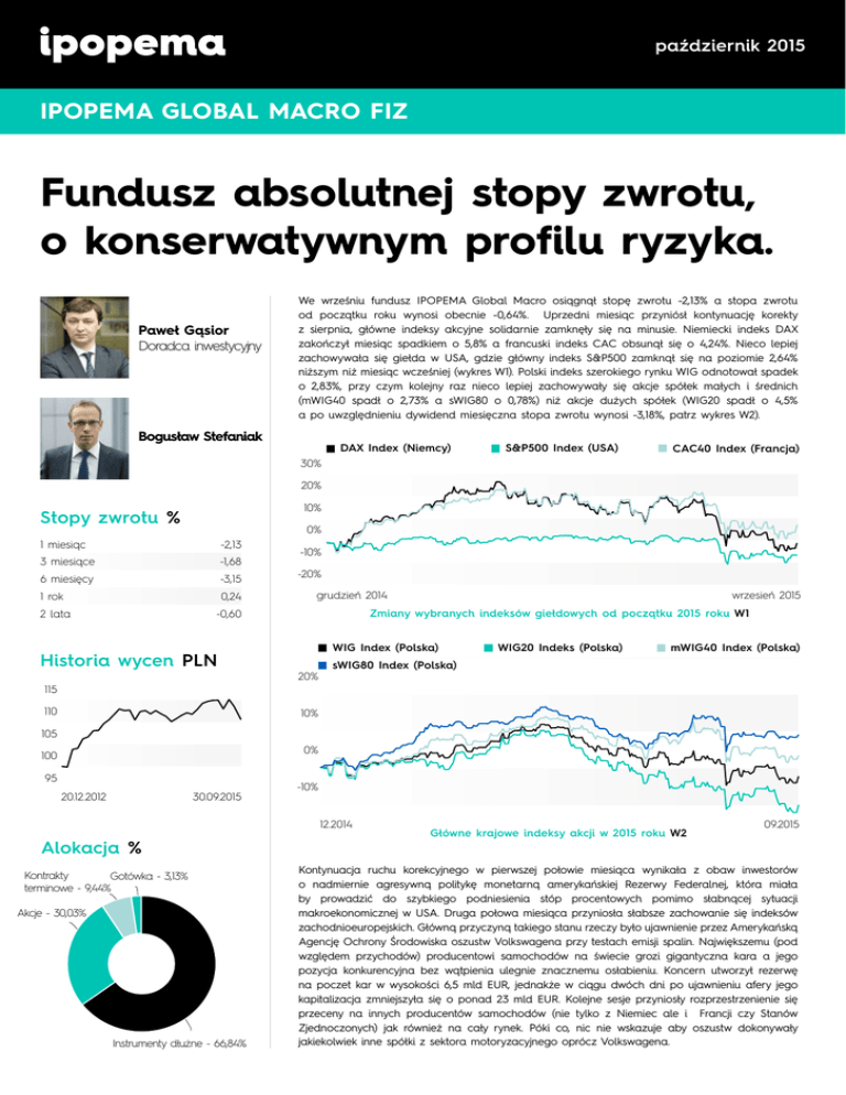październik 2015 IPOPEMA GLOBAL MACRO FIZ Fundusz absolutnej stopy zwrotu, o konserwatywnym profilu ryzyka. Paweł Gąsior Doradca inwestycyjny We wrześniu fundusz IPOPEMA Global Macro osiągnął stopę zwrotu -2,13% a stopa zwrotu od początku roku wynosi obecnie -0,64%. Uprzedni miesiąc przyniósł kontynuację korekty z sierpnia, główne indeksy akcyjne solidarnie zamknęły się na minusie. Niemiecki indeks DAX zakończył miesiąc spadkiem o 5,8% a francuski indeks CAC obsunął się o 4,24%. Nieco lepiej zachowywała się giełda w USA, gdzie główny indeks S&P500 zamknął się na poziomie 2,64% niższym niż miesiąc wcześniej (wykres W1). Polski indeks szerokiego rynku WIG odnotował spadek o 2,83%, przy czym kolejny raz nieco lepiej zachowywały się akcje spółek małych i średnich (mWIG40 spadł o 2,73% a sWIG80 o 0,78%) niż akcje dużych spółek (WIG20 spadł o 4,5% a po uwzględnieniu dywidend miesięczna stopa zwrotu wynosi -3,18%, patrz wykres W2). Bogusław Stefaniak DAX Index (Niemcy) S&P500 Index (USA) CAC40 Index (Francja) 30% 20% 10% Stopy zwrotu % 0% 1 miesiąc -2,13 3 miesiące -1,68 6 miesięcy -3,15 1 rok 0,24 2 lata -10% -20% grudzień 2014 Historia wycen PLN 115 110 wrzesień 2015 Zmiany wybranych indeksów giełdowych od początku 2015 roku W1 -0,60 WIG Index (Polska) 20% WIG20 Indeks (Polska) mWIG40 Index (Polska) sWIG80 Index (Polska) 10% 105 0% 100 95 20.12.2012 30.09.2015 -10% 12.2014 Alokacja % Kontrakty Gotówka - 3,13% terminowe - 9,44% Akcje - 30,03% Instrumenty dłużne - 66,84% Główne krajowe indeksy akcji w 2015 roku W2 09.2015 Kontynuacja ruchu korekcyjnego w pierwszej połowie miesiąca wynikała z obaw inwestorów o nadmiernie agresywną politykę monetarną amerykańskiej Rezerwy Federalnej, która miała by prowadzić do szybkiego podniesienia stóp procentowych pomimo słabnącej sytuacji makroekonomicznej w USA. Druga połowa miesiąca przyniosła słabsze zachowanie się indeksów zachodnioeuropejskich. Główną przyczyną takiego stanu rzeczy było ujawnienie przez Amerykańską Agencję Ochrony Środowiska oszustw Volkswagena przy testach emisji spalin. Największemu (pod względem przychodów) producentowi samochodów na świecie grozi gigantyczna kara a jego pozycja konkurencyjna bez wątpienia ulegnie znacznemu osłabieniu. Koncern utworzył rezerwę na poczet kar w wysokości 6,5 mld EUR, jednakże w ciągu dwóch dni po ujawnieniu afery jego kapitalizacja zmniejszyła się o ponad 23 mld EUR. Kolejne sesje przyniosły rozprzestrzenienie się przeceny na innych producentów samochodów (nie tylko z Niemiec ale i Francji czy Stanów Zjednoczonych) jak również na cały rynek. Póki co, nic nie wskazuje aby oszustw dokonywały jakiekolwiek inne spółki z sektora motoryzacyjnego oprócz Volkswagena. październik 2015 IPOPEMA GLOBAL MACRO FIZ Waluty % Według naszych szacunków wpływ problemów Volkswagena na niemiecką gospodarkę będzie marginalny. W chwili obecnej wyceny niemieckich spółek znajdują się lekko poniżej historycznych średnich (patrz wykres W3), co według nas należy uznać za atrakcyjne poziomy między innymi z uwagi na najwyższą historycznie różnicę między stopą dywidendy a rentownością niemieckich obligacji (co pokazuje relatywną atrakcyjność akcji w środowisku niskich stóp procentowych – patrz wykres W4). Zwiększamy również zaangażowanie w spółkach z sektora motoryzacyjnego (za wyjątkiem Volkswagena), traktując obecną przecenę jako okazję do zakupów. Naszym zdaniem spółki te w średnim terminie zyskają na słabości swojego konkurenta. We wrześniu z okazji targów IAA we Frankfurcie odbyliśmy kilkanaście spotkań ze spółkami motoryzacyjnymi z całego świata i wierzymy w dobre perspektywy dla tego sektora. Scenariusz silnego spowolnienia w Chinach wydaje się mało prawdopodobny (z wielu powodów, ale między innymi z uwagi na duże możliwości stymulacji wzrostu przez rząd). Sektorowi sprzyja zaś popyt w Europie i Ameryce Północnej jak również słabe euro i niskie ceny surowców. HUF - 0,02% EUR - 15,72% USD - 24,16% Prognozowane P/E (best estimate) za bieżący rok kalendarzowy Odchylenie standardowe dla P/E (-1 i +1) P/E dla indeksu DAX - średnia długoletnia PLN - 60,11% 16 14 12 Sektory % Przemysł motoryzacyjny 20,65 10 Banki 19,38 8 Informatyka 5,13 Inne usługi 5,12 Handel detaliczny 4,75 Media 4,46 Przemysł farmaceutyczny 4,40 Przemysł metalowy 4,31 Technologie 3,88 Handel hurtowy 3,86 Przemysł elektromaszynowy 3,30 Telekomunikacja 2,59 Przemysł drzewny 2,27 Pozostałe 15,90 2012 2013 2014 2015 P/E dla indeksu DAX za bieżący rok kalendarzowy W3 2016 DAX stopa dywidendy za bieżący rok (prognoza best estimate) 10-letnia rentowność niemieckich obligacji skarbowych (generic) 4,0 3,0 2,0 1,0 0,0 2012 Struktura geograficzna % Polska 56,49 Niemcy 21,22 Francja 12,20 Wielka Brytania Hiszpania 3,97 3,11 Holandia 1,61 Luksemburg 1,40 2013 2014 2015 Stopa dywidendy (DAX) vs 10-letnie obligacje skarbowe W4 2016 Okres ostatnich kilku miesięcy to na rynkach akcji czas największej od 2011 roku zmienności co wynikało z napływu na rynek szeregu negatywnych informacji: pogarszającej się perspektywy gospodarczej w Chinach, problemów Grecji, oszustw Volkswagena, potencjalnego zacieśniania polityki monetarnej przez amerykańską Rezerwę Federalną, a w kraju osłabienia się franka do złotówki i pojawienia się perspektywy opodatkowania sektora bankowego. Jesteśmy jednak przekonani, że obecne poziomy cenowe z nawiązką uwzględniają te informacje, a rynek w krótkiej perspektywie ustabilizuje się i zacznie zwracać uwagę na niezmiennie pozytywne otoczenie makroekonomiczne w Europie, poprawę zysków spółek i luzowanie polityki monetarnej przez Europejski Bank Centralny. Historycznie okresy podwyższonej zmienności i znaczących korelacji pomiędzy aktywami trwają od dwóch do czterech miesięcy, co sugerowało by, że powoli zbliżam