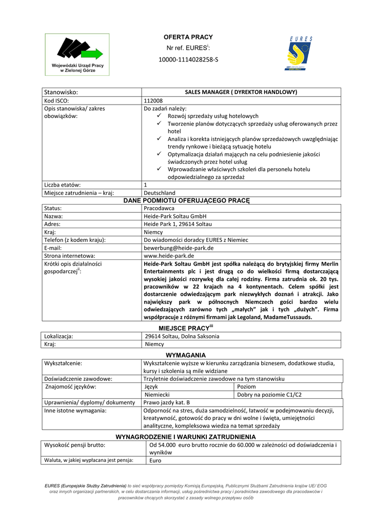 OFERTA PRACY i Nr ref. EURES : 10000-1114028258-S SALES MANAGER ( DYREKTOR HANDLOWY) Stanowisko: Kod ISCO: Opis stanowiska/ zakres obowiązków: Liczba etatów: Miejsce zatrudnienia – kraj: Status: Nazwa: Adres: Kraj: Telefon (z kodem kraju): E-mail: Strona internetowa: Krótki opis działalności ii gospodarczej : 112008 Do zadań należy: Rozwój sprzedaży usług hotelowych Tworzenie planów dotyczących sprzedaży usług oferowanych przez hotel Analiza i korekta istniejących planów sprzedażowych uwzględniając trendy rynkowe i bieżącą sytuację hotelu Optymalizacja działań mających na celu podniesienie jakości świadczonych przez hotel usług Wprowadzanie właściwych szkoleń dla personelu hotelu odpowiedzialnego za sprzedaż 1 Deutschland DANE PODMIOTU OFERUJĄCEGO PRACĘ Pracodawca Heide-Park Soltau GmbH Heide Park 1, 29614 Soltau Niemcy Do wiadomości doradcy EURES z Niemiec [email protected] www.heide-park.de Heide-Park Soltau GmbH jest spółka należącą do brytyjskiej firmy Merlin Entertainments plc i jest drugą co do wielkości firmą dostarczającą wysokiej jakości rozrywkę dla całej rodziny. Firma zatrudnia ok. 20 tys. pracowników w 22 krajach na 4 kontynentach. Celem spółki jest dostarczenie odwiedzającym park niezwykłych doznań i atrakcji. Jako największy park w północnych Niemczech gości bardzo wielu odwiedzających zarówno tych „małych” jak i tych „dużych”. Firma współpracuje z różnymi firmami jak Legoland, MadameTussauds. iii Lokalizacja: Kraj: Wykształcenie: Doświadczenie zawodowe: Znajomość języków: Uprawnienia/ dyplomy/ dokumenty Inne istotne wymagania: MIEJSCE PRACY 29614 Soltau, Dolna Saksonia Niemcy WYMAGANIA Wykształcenie wyższe w kierunku zarządzania biznesem, dodatkowe studia, kursy i szkolenia są mile widziane Trzyletnie doświadczenie zawodowe na tym stanowisku Język Poziom Niemiecki Dobry na poziomie C1/C2 Prawo jazdy kat. B Odporność na stres, duża samodzielność, łatwość w podejmowaniu decyzji, kreatywność, gotowość do pracy w dni wolne i święta, umiejętności analityczne, kompleksowa wiedza na temat sprzedaży WYNAGRODZENIE I WARUNKI ZATRUDNIENIA Od 54.000 euro brutto rocznie do 60.000 w zależności od doświadczenia i wyników Waluta, w jakiej wypłacana jest pensja: Euro Wysokość pensji brutto: EURES (Europejskie Służby Zatrudnienia) to sieć współpracy pomiędzy Komisją Europejską, Publicznymi Służbami Zatrudnienia krajów UE/ EOG oraz innych organizacji partnerskich, w celu dostarczania informacji, usług pośrednictwa pracy i poradnictwa zawodowego dla pracodawców i pracowników chcących skorzystać z zasady wolnego przepływu osób Rodzaj stawki wynagrodzenia: Nazwa firmy, z którą zostanie podpisana umowa: Rodzaj umowy: Wymiar czasu pracy Liczba godzin tygodniowo: roczna Heide-Park Soltau GmbH Data rozpoczęcia Jak najszybciej Umowa na czas nieokreślony Praca na pełen etat 40 SPOSÓB SKŁADANIA WNIOSKU Wymagane dokumenty (list motywacyjny, CV itp.): Język, w którym muszą być sporządzone przedkładane dokumenty: Do kogo należy wysłać dokumenty: Dane teleadresowe przedstawiciela pracodawcy: CV w języku niemieckim wraz ze zdjęciem oraz kopiami dyplomów potwierdzających wykształcenie, list motywacyjny z podaną informacją na temat kwoty wynagrodzenia, którą osoba ubiegająca się o to stanowisko chciałaby otrzymywać wraz z uzasadnieniem oraz wypełniony formularz zgłoszeniowy. Kandydatów prosi się o podanie realnego terminu podjęcia pracy. j. niemiecki Do doradcy EURES z Niemiec pani Parlak: [email protected] W tytule maila należy podać numer referencyjny oferty „ 100001114028258-S Sales Manager. Formularz do pobrania ze strony internetowej www.wup.zgora.pl w zakładce „ Dokumenty EURES do pobrania”. Doradca EURES Pani Parlak +49 228 713 2133, kontakt tylko w języku niemieckim WAŻNOŚĆ Data publikacji: 20.08.2014 Termin przedkładania podań o pracę / zakończenia ważności oferty: odwołania UWAGA: Umowa z zagranicznym pracodawcą zostanie zawarta zgodnie z prawem kraju zatrudnienia. Oznacza to, że wszystkie roszczenia odnośnie do warunków, które obejmuje umowa, można kierować wyłącznie do odpowiedniego sądu w kraju zatrudnienia. Publiczne służby zatrudnienia (EURES) nie mogą pośredniczyć ani reprezentować pracownika w sądzie kraju zatrudnienia w przypadku sporu z pracodawcą. Publiczne służby zatrudnienia (EURES) dokładają wszelkich starań, aby zapewnić rzetelność i wiarygodność ofert pracy zgłoszonych w lokalnym urzędzie pracy. Należy wyjaśnić, że oferta pracy została zgłoszona przez stronę trzecią i EURES nie odpowiada za ewentualne rozbieżności między warunkami pracy określonymi w ofercie pracy i warunkami oferowanymi przez potencjalnego pracodawcę. Publiczne służby zatrudnienia (EURES) informują, że będą zbierać, przetwarzać i przekazywać potencjalnym pracodawcom zgodnie z przepisami dotyczącymi ochrony danych osobowych wszystkie dane osobowe dostarczone przez osoby poszukujące pracy. i Nr ref. na portalu EURES www.eures.europa.eu . Dotyczy ofert pracy publicznych służb zatrudnienia, których bazy danych ofert pracy nie są połączone z portalem EURES. ii Informacje o firmie, takie jak: status prawny, sektor, typ działalności, rodzaj produktów lub świadczonych usług, data rozpoczęcia działalności gospodarczej, liczba pracowników itp. iii Miejsce, w którym będzie wykonywana praca. Należy wypełnić w przypadku gdy: 1) miejsce wykonywania pracy jest inne niż siedziba podmiotu oferującego pracę, 2) pracę oferuje agencja pośrednictwa pracy/ agencja pracy tymczasowej. EURES (Europejskie Służby Zatrudnienia) to sieć współpracy pomiędzy Komisją Europejską, Publicznymi Służbami Zatrudnienia krajów UE/ EOG oraz innych organizacji partnerskich, w celu dostarczania informacji, usług pośrednictwa pracy i poradnictwa zawodowego dla pracodawców i pracownik