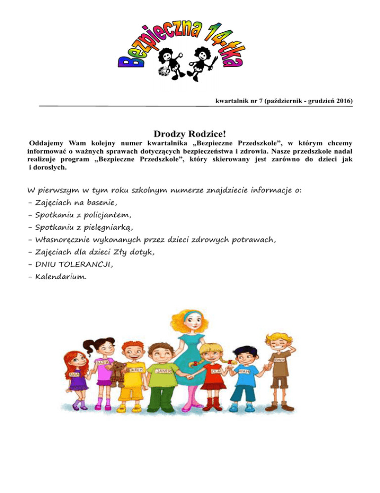 kwartalnik nr 7 (październik - grudzień 2016) Drodzy Rodzice! Oddajemy Wam kolejny numer kwartalnika „Bezpieczne Przedszkole”, w którym chcemy informować o ważnych sprawach dotyczących bezpieczeństwa i zdrowia. Nasze przedszkole nadal realizuje program „Bezpieczne Przedszkole”, który skierowany jest zarówno do dzieci jak i dorosłych. W pierwszym w tym roku szkolnym numerze znajdziecie informacje o: - Zajęciach na basenie, - Spotkaniu z policjantem, - Spotkaniu z pielęgniarką, - Własnoręcznie wykonanych przez dzieci zdrowych potrawach, - Zajęciach dla dzieci Zły dotyk, - DNIU TOLERANCJI, - Kalendarium. kwartalnik nr 7 (październik - grudzień 2016) ZAJĘCIA NA BASENIE Bez względu na wiek i stopień sprawności ruchowej, zajęcia na basenie wpływają pozytywnie na rozwój psychofizyczny i sprawność dziecka. Wyzwalają nie tylko naturalną potrzebę ruchu, ale pozwalają dziecku na kreowanie samodzielnej aktywności ruchowej. Kształtują wreszcie cechy motoryczne i osobowościowe uczestników. Zajęcia prowadzone przez doświadczonych instruktorów nauki pływania z wykorzystaniem atrakcyjnych i zróżnicowanych zestawów ćwiczeń - w ciekawy i bezpieczny sposób zachęcają dzieci do zabaw w wodzie i nauki pływania. Ćwiczenia i zabawy w wodzie w bezpieczny i przyjazny sposób oswajają z nowym środowiskiem, pozwalają pokonać strach i opór przed wodą. Nauka pływania przynosi wiele radości i pozytywnych emocji, a samodzielne pływanie daje dziecku satysfakcję ze zdobycia nowej, trudnej do opanowania umiejętności oraz podnosi wiarę we własne siły i możliwości. Dzieci uczą się podstawowych technik pływackich , co daje im możliwość udziału i zdobywania medali w zawodach pływackich na szczeblu miejskim, wojewódzkim i ogólnopolskim. Pływanie jest formą aktywności, która ze względu na swoje walory zdrowotne i rekreacyjne zajmuje szczególne miejsce w profilaktyce wad postawy i kształtowaniu prawidłowych sylwetek. Pływanie ponadto w sposób harmonijny i symetryczny rozwija całe ciało, bardziej pobudza mięśnie niż inna forma aktywności fizycznej. Jest swoistą gimnastyką mięśni i stawów, zmniejsza napięcie mięśniowe, stymuluje prawidłowy rozwój gorsetu mięśniowego i aparatu kostno – stawowego. Zajęcia na basenie są dla wielu dzieci ważnym uzupełnieniem zajęć z wychowania fizycznego i gimnastyki korekcyjnej. Dlatego nasze przedszkolaki uczęszczają na basen raz w tygodniu. kwartalnik nr 7 (październik - grudzień 2016) SPOTKANIE Z POLICJANTEM W przedszkolu wszyscy zwracamy uwagę na bezpieczeństwo. Dlatego przedszkolaków z Przedszkola Miejskiego nr 14 z Oddziałami Integracyjnymi odwiedziła pani policjantka Monika Śliwińska z Komendy Miejskiej Policji w Jaworznie. W czasie spotkania policjantka sprawdziła, czy dzieci znają podstawowe zasady bezpieczeństwa, w tym numery alarmowe. Następnie wraz z dziećmi omówiła, zasady postępowania podczas kontaktu z obcymi dorosłymi, czy z nieznajomymi zwierzętami, zwracając uwagę na właściwe zachowania wobec tych zagrożeń. Tradycyjnie przypomniała zasady prawidłowego przechodzenia przez jezdnię Później pani policjantka zaprezentował wyposażenie stroju policjanta: tarcza odblaskowa, rodzaje czapek, elementy odblaskowe na ubraniu, rodzaje pasków, rękawiczki, omawiając osobno każde z akcesoriów. Kajdanki oczywiście wzbudziły najwięcej emocji wśród przedszkolaków. W podziękowaniu za spotkanie przedszkolaki wręczyły pani policjant słodki upominek. kwartalnik nr 7 (październik - grudzień 2016) SPOTKANIE Z PIELĘGNIARKĄ Pierwszego grudnia odbyło się spotkanie z panią pielęgniarką Olgą Kobyłecką. Pani pielęgniarka przypomniała okoliczności w jakich powinniśmy myć ręce. Zademonstrowała poprawną czynność mycia rąk i przedstawiła dzieciom na obrazkach powiększone obrazy drobnoustrojów. Omówiła jak powinniśmy zachowywać się podczas kichania i kaszlu w celu zapobiegania rozprzestrzeniania się zarazków na innych. Przypomniała ogólne zasady dbania o higienę oraz konieczność stosowania się do wskazówek lekarza w razie zaistnienia choroby. Przedszkolaki podziękowały gościowi za przyjście do naszego przedszkola. kwartalnik nr 7 (październik - grudzień 2016) JEMY ZDROWO Od dawna wiadomo, że jedzenie owoców i warzyw ma same pozytywne skutki dla naszego zdrowia. Jest to niewątpliwie prawdą, którą odkrywamy zazwyczaj dopiero w życiu dorosłym wcześniej stroniąc od wszelkich warzyw „wtykanych” nam przez mamy czy babcie. Jedzenie warzyw i owoców może mieć pozytywne skutki nie tylko zdrowotne, ale także materialne – słodkie jabłuszko mniej kosztuje niż batonik z karmelem. Często w naszej diecie brakuje podstawowych mikro i makroelementów oraz witamin, które z łatwością odnaleźć możemy w tych najbardziej popularnych produktach dostępnych w Polsce. Jaki więc dobroczynny wpływ mają na nas owoce i warzywa? Oto 10 korzyści : 1. Zapobiegają powstawaniu anemii 2. Są to naturalne leki przeciwwirusowe i antybiotyki 3. Obniżają poziom „złego” cholesterolu, a więc działają dobroczynnie na funkcjonowanie serca 4. Poprawiają odporność organizmu 5. Zapobiegają uczuciu zmęczenia i dobrze wpływają na pracę całego organizmu 6. Zapewniają prawidłowy wzrost i rozwój (szczególnie dzieci) 7. Regulują pracę mózgu 8. Działają dobroczynnie na zmysł wzroku 9. Poprawiają pamięć, koncentrację, zapobiegają depresji 10. Działają przeciwalergicznie kwartalnik nr 7 (październik - grudzień 2016) Dzieci w naszym przedszkolu wiedzą co to zdrowe odżywianie, dlatego też podczas zajęć organizowanych przedszkolaki wykonywały zdrowe kanapki, sałatki z owoców i warzyw. kwartalnik nr 7 (październik - grudzień 2016) ZŁY DOTYK W naszym przedszkolu odbyło się szkolenie dla dzieci 5 – 6 – letnich „Zły dotyk”. Podczas spotkania dzieci dowiedziały się co to j