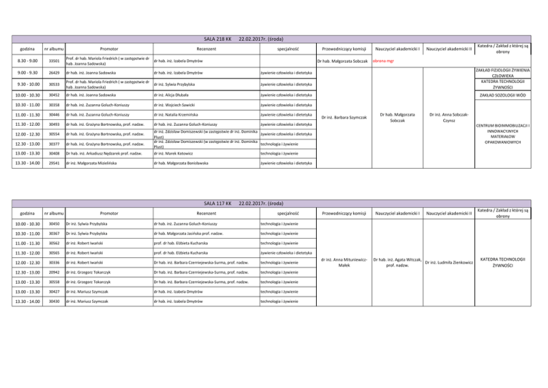 SALA 218 KK Promotor 22.02.2017r. (środa) godzina nr albumu Recenzent specjalność 8.30 - 9.00 33501 Prof. dr hab. Mariola Friedrich ( w zastępstwie dr hab. Joanna Sadowska) dr hab. inż. Izabela Dmytrów 9.00 - 9.30 26429 dr hab. inż. Joanna Sadowska dr hab. inż. Izabela Dmytrów żywienie człowieka i dietetyka 9.30 - 10.00 30533 Prof. dr hab. Mariola Friedrich ( w zastępstwie dr hab. Joanna Sadowska) dr inż. Sylwia Przybylska żywienie człowieka i dietetyka 10.00 - 10.30 30452 dr hab. inż. Joanna Sadowska dr inż. Alicja Dłubała żywienie człowieka i dietetyka 10.30 - 11.00 30358 dr hab. inż. Zuzanna Goluch-Koniuszy dr inż. Wojciech Sawicki żywienie człowieka i dietetyka 11.00 - 11.30 30446 dr hab. inż. Zuzanna Goluch-Koniuszy dr inż. Natalia Krzemińska żywienie człowieka i dietetyka 11.30 - 12.00 30493 dr hab. inż. Grażyna Bortnowska, prof. nadzw. dr hab. inż. Zuzanna Goluch-Koniuszy żywienie człowieka i dietetyka Dr hab. Małgorzata Sobczak 30554 dr hab. inż. Grażyna Bortnowska, prof. nadzw. 12.30 - 13.00 30377 dr hab. inż. Grażyna Bortnowska, prof. nadzw. 13.00 - 13.30 30408 Dr hab. inż. Arkadiusz Nędzarek prof. nadzw. dr inż. Marek Kotowicz technologia i żywienie 13.30 - 14.00 29541 dr inż. Małgorzata Mizielińska dr hab. Małgorzata Bonisławska żywienie człowieka i dietetyka SALA 117 KK nr albumu 10.00 - 10.30 30450 10.30 - 11.00 11.00 - 11.30 Promotor Nauczyciel akademicki I Nauczyciel akademicki II Katedra / Zakład z której są obrony obrona mgr ZAKŁAD FIZJOLOGII ŻYWIENIA CZŁOWIEKA KATEDRA TECHNOLOGII ŻYWNOŚCI ZAKŁAD SOZOLOGII WÓD Dr inż. Barbara Szymczak Dr hab. Małgorzata Sobczak Dr inż. Anna SobczakCzynsz CENTRUM BIOIMMOBILIZACJI I INNOWACYJNYCH MATERIAŁOW OPAKOWANIOWYCH dr inż. Zdzisław Domiszewski (w zastępstwie dr inż. Dominika żywienie człowieka i dietetyka Plust) dr inż. Zdzisław Domiszewski (w zastępstwie dr inż. Dominika technologia i żywienie Plust) 12.00 - 12.30 godzina Przewodniczący komisji 22.02.2017r. (środa) Recenzent specjalność Dr inż. Sylwia Przybylska dr hab. inż. Zuzanna Goluch-Koniuszy technologia i żywienie 30367 Dr inż. Sylwia Przybylska dr hab. Małgorzata Jasińska prof. nadzw. technologia i żywienie 30562 dr inż. Robert Iwański prof. dr hab. Elżbieta Kucharska technologia i żywienie 11.30 - 12.00 30565 dr inż. Robert Iwański prof. dr hab. Elżbieta Kucharska żywienie człowieka i dietetyka 12.00 - 12.30 30336 dr inż. Robert Iwański Dr hab. inż. Barbara Czerniejewska-Surma, prof. nadzw. technologia i żywienie 12.30 - 13.00 20942 dr inż. Grzegorz Tokarczyk Dr hab. inż. Barbara Czerniejewska-Surma, prof. nadzw. technologia i żywienie 13.00 - 13.30 30558 dr inż. Grzegorz Tokarczyk Dr hab. inż. Barbara Czerniejewska-Surma, prof. nadzw. technologia i żywienie 13.00 - 13.30 30427 dr inż. Mariusz Szymczak dr hab. inż. Izabela Dmytrów technologia i żywienie 13.30 - 14.00 30430 dr inż. Mariusz Szymczak dr hab. inż. Izabela Dmytrów technologia i żywienie Przewodniczący komisji dr inż. Anna MituniewiczMałek Nauczyciel akademicki I Nauczyciel akademicki II Dr hab. inż. Agata Witczak, Dr inż. Ludmiła Zienkowicz prof. nadzw. Katedra / Zakład z której są obrony KATEDRA TECHNOLOGII ŻYWNOŚCI