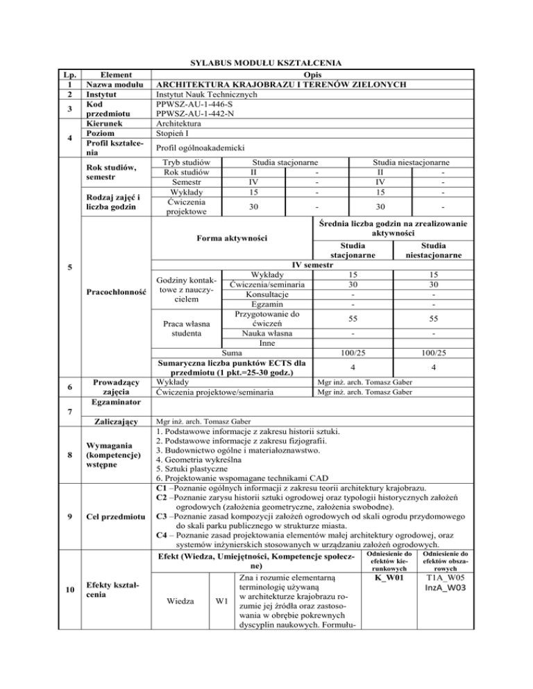 Lp. 1 2 3 4 Element Nazwa modułu Instytut Kod przedmiotu Kierunek Poziom Profil kształcenia Rok studiów, semestr Rodzaj zajęć i liczba godzin SYLABUS MODUŁU KSZTAŁCENIA Opis ARCHITEKTURA KRAJOBRAZU I TERENÓW ZIELONYCH Instytut Nauk Technicznych PPWSZ-AU-1-446-S PPWSZ-AU-1-442-N Architektura Stopień I Profil ogólnoakademicki Tryb studiów Rok studiów Semestr Wykłady Ćwiczenia projektowe Studia stacjonarne II IV 15 30 Forma aktywności 5 Pracochłonność 6 Prowadzący zajęcia Egzaminator - Studia niestacjonarne II IV 15 30 - Średnia liczba godzin na zrealizowanie aktywności Studia Studia stacjonarne niestacjonarne IV semestr Wykłady 15 15 Godziny kontakĆwiczenia/seminaria 30 30 towe z nauczyKonsultacje cielem Egzamin Przygotowanie do 55 55 ćwiczeń Praca własna studenta Nauka własna Inne Suma 100/25 100/25 Sumaryczna liczba punktów ECTS dla 4 4 przedmiotu (1 pkt.=25-30 godz.) Mgr inż. arch. Tomasz Gaber Wykłady Mgr inż. arch. Tomasz Gaber Ćwiczenia projektowe/seminaria 7 Zaliczający 8 Wymagania (kompetencje) wstępne 9 Cel przedmiotu 10 Efekty kształcenia Mgr inż. arch. Tomasz Gaber 1. Podstawowe informacje z zakresu historii sztuki. 2. Podstawowe informacje z zakresu fizjografii. 3. Budownictwo ogólne i materiałoznawstwo. 4. Geometria wykreślna 5. Sztuki plastyczne 6. Projektowanie wspomagane technikami CAD C1 –Poznanie ogólnych informacji z zakresu teorii architektury krajobrazu. C2 –Poznanie zarysu historii sztuki ogrodowej oraz typologii historycznych założeń ogrodowych (założenia geometryczne, założenia swobodne). C3 –Poznanie zasad kompozycji założeń ogrodowych od skali ogrodu przydomowego do skali parku publicznego w strukturze miasta. C4 – Poznanie zasad projektowania elementów małej architektury ogrodowej, oraz systemów inżynierskich stosowanych w urządzaniu założeń ogrodowych. Efekt (Wiedza, Umiejętności, Kompetencje społecz- Odniesienie do Odniesienie do efektów kieefektów obszane) runkowych rowych Zna i rozumie elementarną T1A_W05 K_W01 terminologię używaną InzA_W03 w architekturze krajobrazu roWiedza W1 zumie jej źródła oraz zastosowania w obrębie pokrewnych dyscyplin naukowych. Formułu- W2 W3 W4 U1 je wypowiedzi stosując terminologię specjalistyczną. Zna i rozumie wzajemne relacje obiektu architektonicznego i otoczenia. Zna zasady posługiwania się warsztatem plastycznym w rozwiązywaniu zagadnień projektowych. Ma uporządkowaną wiedzę w zakresie metodyki i technik inwentaryzacji architektonicznej, urbanistycznej i krajobrazowej. Potrafi samodzielnie zdobywać wiedzę i rozwijać swoje profesjonalne umiejętności, korzystając z różnych źródeł (w języku rodzimym i obcych) i nowoczesnych technologii Potrafi wykonać inwentaryzację architektoniczno –budowlaną i urbanistyczno- krajobrazową. K_W06 T1A_W03 InzA_W01 K_W17 T1A W03 T1A W04 InzA_W02 K_W09 K_U05 T1A _W01 T1A_W07 InzA_W02 T1A_U05 InzA_U04 K_U16 T1A _U08 T1A_U09 T1A_U10 Umiejętność InzA_U01 U2 InzA_U02 InzA_U03 InzA_U08 U3 Potrafi rozpoznać uwarunkowania krajobrazowe i środowiskowe mające wpływ na wybór koncepcji projektowej. K_U18 Ma świadomość ważności zachowania w sposób profesjonalny, przestrzegania zasad etyki zawodowej i poszanowania różnorodności poglądów i kultur. K_K05 T1A_U10 T1A_U16 InzA_U03 Kompetencje społeczne Efekt kształcenia W1 11 Forma i warunki potwierdzenia efektu kształcenia W2 W4 W3 U1 K1 T1A_K05 T1A_K07 Sposób potwierdzenia (weryfikacji) Umiejętność rozpoznania cech stylistycznych zabytkowych założeń ogrodowych – opracowanie eseju na temat wybranego założenia ogrodowego. Właściwe opracowanie kompozycyjne założenia ogrodowego i parkowego wraz z elementami małej architektury ogrodowej oraz prawidłowy dobór elementów tworzywa zielonego – opracowanie projektu semestralnego. Czytelne i ciekawe opracowanie graficzne i prezentacja zadania projektowego - opracowanie posteru wystawowego. Poprawność w zakresie rozwiązań projektowych, pozytywna ocena z projektu. Umiejętność przedstawienia koncepcji projektowej w rysunku trójU2 wymiarowym (perspektywa awialna, model komputerowy). Umiejętność sporządzenia dokumentacji inwentaryzacyjnej i projekU3 towej z zakresu sztuki ogrodowej. Poszanowanie prawa autorskiego w pracy, samodzielne wykonanie K1 pracy. 1. Wprowadzenie do problematyki projektowania założeń ogrodowych. Omówienie formy i zakresu projektów semestralnych. 2. Rozpoznanie terenu projektowania. 3. Kompozycja założenia ogrodowego. S – dla parków miejskich (studia stacjonarne) N – dla ogrodów przydomowych (studia niestacjonarne) 4. Elementy małej architektury ogrodowej: Ogrodzenia, altany, nawierzchnie, schody terenowe, urządzenie skarp, urządzenie założeń wodnych, oświetlenie, miejsca zabaw dla dzieci. 5. Tworzywo zielone. Zieleń niska, średnia i wysoka. Zasady kompozycji w założeniach ogrodowych w zależności od ich wielkości i przeznaczenia. 6. Kolor i faktura jako środki wyrazu, podnoszące atrakcyjność przestrzeni. 7. Powiązania kompozycyjne z bliższym i dalszym otoczeniem krajobrazowych projektowanego założenia ogrodowego. 8. Wstępna koncepcja przestrzenno-plastyczna. Kompozycja przestrzenna. Rozwiązania funkcjonalne. Dobór materiału roślinnego. Opracowanie elementów małej architektury ogrodowej. 9. Przegląd prac. Omówienie wstępnej koncepcji projektowej. 10. Dobór materiałów i technik graficznych do prezentacji i opracowania projektu. 11. Uszczegółowienie koncepcji projektowej. 12. Ostateczne opracowanie projektu semestralnego. Poster wystawowy; dokumentacja projektu. 12 Treści merytoryczne przedmiotu 13 Forma i warunki zaliczenia modułu, w tym zasady dopuszczenia do zaliczenia Uzyskanie pozytywnej oceny za projekt z zakresu przedmiotowej problematyki, obecność na ćwiczeniach, przygotowanie do zajęć, praca na zajęciach, postępy w projektowaniu, terminowość 14 Wykaz literatury podstawowej 1. J. Bo