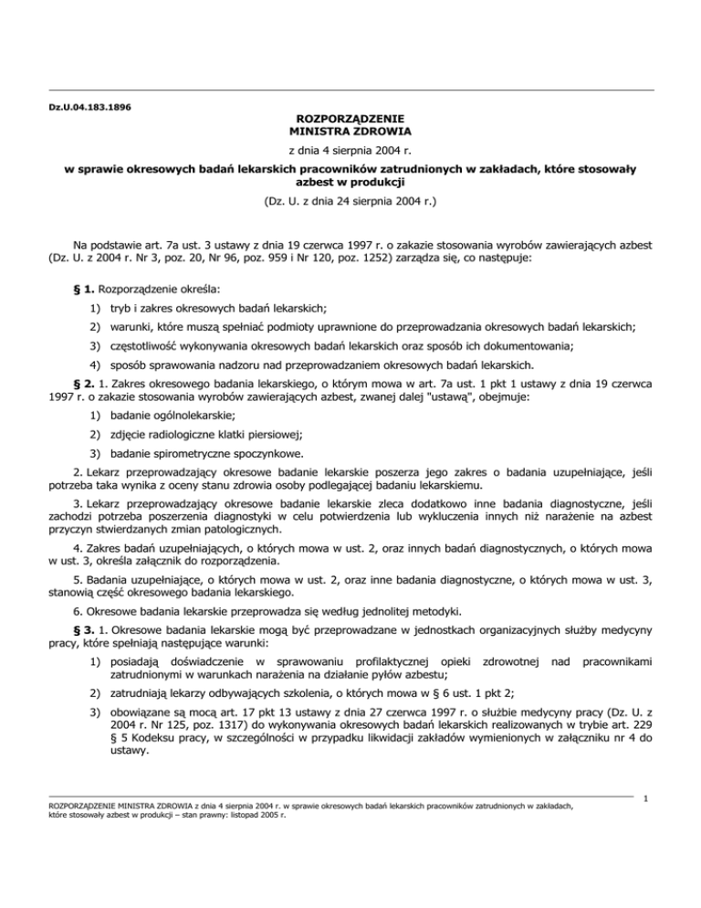Dz.U.04.183.1896 ROZPORZĄDZENIE MINISTRA ZDROWIA z dnia 4 sierpnia 2004 r. w sprawie okresowych badań lekarskich pracowników zatrudnionych w zakładach, które stosowały azbest w produkcji (Dz. U. z dnia 24 sierpnia 2004 r.) Na podstawie art. 7a ust. 3 ustawy z dnia 19 czerwca 1997 r. o zakazie stosowania wyrobów zawierających azbest (Dz. U. z 2004 r. Nr 3, poz. 20, Nr 96, poz. 959 i Nr 120, poz. 1252) zarządza się, co następuje: § 1. Rozporządzenie określa: 1) tryb i zakres okresowych badań lekarskich; 2) warunki, które muszą spełniać podmioty uprawnione do przeprowadzania okresowych badań lekarskich; 3) częstotliwość wykonywania okresowych badań lekarskich oraz sposób ich dokumentowania; 4) sposób sprawowania nadzoru nad przeprowadzaniem okresowych badań lekarskich. § 2. 1. Zakres okresowego badania lekarskiego, o którym mowa w art. 7a ust. 1 pkt 1 ustawy z dnia 19 czerwca 1997 r. o zakazie stosowania wyrobów zawierających azbest, zwanej dalej "ustawą", obejmuje: 1) badanie ogólnolekarskie; 2) zdjęcie radiologiczne klatki piersiowej; 3) badanie spirometryczne spoczynkowe. 2. Lekarz przeprowadzający okresowe badanie lekarskie poszerza jego zakres o badania uzupełniające, jeśli potrzeba taka wynika z oceny stanu zdrowia osoby podlegającej badaniu lekarskiemu. 3. Lekarz przeprowadzający okresowe badanie lekarskie zleca dodatkowo inne badania diagnostyczne, jeśli zachodzi potrzeba poszerzenia diagnostyki w celu potwierdzenia lub wykluczenia innych niż narażenie na azbest przyczyn stwierdzanych zmian patologicznych. 4. Zakres badań uzupełniających, o których mowa w ust. 2, oraz innych badań diagnostycznych, o których mowa w ust. 3, określa załącznik do rozporządzenia. 5. Badania uzupełniające, o których mowa w ust. 2, oraz inne badania diagnostyczne, o których mowa w ust. 3, stanowią część okresowego badania lekarskiego. 6. Okresowe badania lekarskie przeprowadza się według jednolitej metodyki. § 3. 1. Okresowe badania lekarskie mogą być przeprowadzane w jednostkach organizacyjnych służby medycyny pracy, które spełniają następujące warunki: 1) posiadają doświadczenie w sprawowaniu profilaktycznej opieki zatrudnionymi w warunkach narażenia na działanie pyłów azbestu; zdrowotnej nad pracownikami 2) zatrudniają lekarzy odbywających szkolenia, o których mowa w § 6 ust. 1 pkt 2; 3) obowiązane są mocą art. 17 pkt 13 ustawy z dnia 27 czerwca 1997 r. o służbie medycyny pracy (Dz. U. z 2004 r. Nr 125, poz. 1317) do wykonywania okresowych badań lekarskich realizowanych w trybie art. 229 § 5 Kodeksu pracy, w szczególności w przypadku likwidacji zakładów wymienionych w załączniku nr 4 do ustawy. ROZPORZĄDZENIE MINISTRA ZDROWIA z dnia 4 sierpnia 2004 r. w sprawie okresowych badań lekarskich pracowników zatrudnionych w zakładach, które stosowały azbest w produkcji – stan prawny: listopad 2005 r. 1 2. Okresowe badania lekarskie przeprowadza jednostka, o której mowa w ust. 1, właściwa terytorialnie ze względu na miejsce prowadzenia działalności zakładu wymienionego w załączniku nr 4 do ustawy. 3. Osoba podlegająca okresowym badaniom lekarskim może wystąpić z wnioskiem do jednostki, o której mowa w ust. 2, o przesłanie dokumentacji medycznej dotyczącej jej osoby i przeprowadzanie tych badań w jednostce właściwej terytorialnie ze względu na jej miejsce zamieszkania. 4. Jeżeli w wyniku wniosku, o którym mowa w ust. 3, zadania z zakresu okresowych badań lekarskich osoby podlegającej takim badaniom przejmie jednostka właściwa terytorialnie ze względu na miejsce zamieszkania tej osoby, dokumentację medyczną przekazuje się tej jednostce, w trybie poufnym, za pokwitowaniem. § 4. 1. Lekarz przeprowadzający okresowe badanie lekarskie ustala częstotliwość tych badań, biorąc pod uwagę ocenę stanu zdrowia osoby podlegającej okresowemu badaniu lekarskiemu, stanowisko pracy, wielkość narażenia na pył azbestu, staż pracy oraz okres latencji. 2. Okresowe badania lekarskie przeprowadza się na podstawie książeczki badań profilaktycznych, o której mowa w art. 7 ust. 1 ustawy, nie rzadziej niż co 3 lata. 3. Lekarz przeprowadzający okresowe badanie lekarskie wypełnia: 1) dokumentację medyczną, prowadzoną dla potrzeb przeprowadzania okresowych badań lekarskich osób podlegających tym badaniom, w tym kartę badania, prowadzoną dla potrzeb sprawowania nadzoru; 2) książeczkę badań profilaktycznych, o której mowa w art. 7 ust. 1 ustawy. 4. W dokumentach, o których mowa w ust. 3, należy podać termin następnego okresowego badania lekarskiego. § 5. 1. Okresowe badanie lekarskie kończy się orzeczeniem lekarskim zawierającym ocenę stanu zdrowia osoby badanej. 2. Lekarz przeprowadzający okresowe badanie lekarskie wysyła kartę badania, w terminie 14 dni od dnia przeprowadzenia badania, do jednostki nadzorującej, którą jest Instytut Medycyny Pracy im. prof. dr med. Jerzego Nofera w Łodzi. § 6. 1. Jednostka nadzorująca: 1) określa szczegółową metodykę badań, o której mowa w § 2 ust. 6, oraz zapewnia jednolitą ocenę radiogramów w ramach okresowych badań lekarskich; 2) przeprowadza szkolenia dla lekarzy wykonujących okresowe badania lekarskie, które obejmują w szczególności: a. metodykę badań, o której mowa w § 2 ust. 6, b. sposób prowadzenia dokumentacji, o której mowa w § 4 ust. 3 pkt 1; 3) udziela konsultacji lekarzom przeprowadzającym okresowe badania lekarskie; 4) przekazuje lekarzom przeprowadzającym okresowe badania lekarskie niezbędne informacje z rejestru, o którym mowa w pkt 7, w celu prawidłowej oceny narażenia na pył azbestu osoby podlegającej takiemu badaniu; 5) sprawuje nadzór nad podmiotami wykonującymi okresowe badania lekarskie; 6) przeprowadza analizę danych zawartych w kartach badań w celu monitorowania sytuacji zdrowotnej osób podlegających okresowym badaniom lekarskim; 7) prowadzi rejestr pracowników, o 