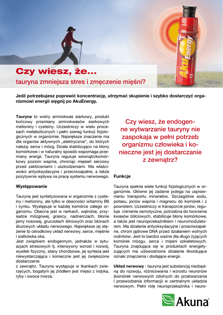 Czy wiesz, że... tauryna zmniejsza stres i zmęczenie mięśni? Jeśli potrzebujesz poprawić koncentrację, utrzymać skupienie i szybko dostarczyć organizmowi energii sięgnij po AkuEnergy. Tauryna to wolny aminokwas siarkowy, produkt końcowy przemiany aminokwasów siarkowych metioniny i cysteiny. Uczestniczy w wielu procesach metabolicznych i pełni szereg funkcji fizjologicznych w organizmie. Największe znaczenie ma dla organów aktywnych „elektrycznie”, do których należą: serce i mózg. Działa stabilizująco na błony komórkowe i w naturalny sposób wspomaga przemiany energii. Tauryna reguluje wewnątrzkomórkowy poziom wapnia, chroniąc mięsień sercowy przed zakłóceniami i uszkodzeniami. Ma właściwości antyoksydacyjne i przeciwzapalne, a także pozytywnie wpływa na pracę systemu nerwowego. Występowanie Tauryna jest syntetyzowana w organizmie z cysteiny i metioniny, ale tylko w obecności witaminy B6 i cynku. Występuje w każdej komórce całego organizmu. Obecna jest w nerkach, wątrobie, przysadce mózgowej, grasicy, nadnerczach, błonie jamy nosowej, gruczołach ślinowych oraz błonach śluzowych układu nerwowego. Największe jej stężenie to ośrodkowy układ nerwowy, serce, mięśnie i siatkówka oka. Jest związkiem endogennym, jednakże w sytuacjach stresowych tj. intensywny wzrost i rozwój, wysiłek fizyczny, stany chorobowe, jej synteza jest niewystarczająca i konieczne jest jej zwiększone dostarczenie z zewnątrz. Tauryna występuje w tkankach zwierzęcych, bogatym jej źródłem jest mięso z indyka, ryby i owoce morza. Czy wiesz, że endogenne wytwarzanie tauryny nie zaspokaja w pełni potrzeb organizmu człowieka i konieczne jest jej dostarczanie z zewnątrz? Funkcje Tauryna spełnia wiele funkcji fizjologicznych w organizmie. Główne jej zadanie polega na usprawnieniu transportu minerałów. Szczególnie sodu, potasu, jonów wapnia i magnezu do komórek i z powrotem. Uczestniczy w transporcie jonów, reguluje ciśnienie osmotyczne, potrzebna do tworzenia kwasów żółciowych, stabilizuje błony komórkowe, a także jest neuroprzekaźnikiem i neuromodulatorem. Ma działanie antyoksydacyjne i przeciwzapalne, chroni jądrowe DNA przed działaniem wolnych rodników. Jest to bardzo ważne dla długo żyjących komórek mózgu, serca i mięśni szkieletowych. Tauryna znajdująca się w produktach energetyzujących ma udowodnione działanie likwidujące oznaki zmęczenia i dodające energii. Układ nerwowy - tauryna jest substancją niezbędną do rozwoju, różnicowania i wzrostu neuronów (komórek nerwowych zdolnych do przetwarzania i przewodzenia informacji) w centralnym układzie nerwowym. Pełni rolę neuroprzekaźnika i neuro- modulatora, a jej wysokie stężenie stwierdza się w korze mózgowej, hipokampie i podwzgórzu. Czy wiesz, że tauryna stabilizuje i wzmacnia bicie serca? nocześnie podnosi aktywność mięśnia sercowego i wzmacnia jego pracę. Ogranicza tym samym powstawanie różnych zaburzeń serca. Niedobór tauryny Serce - największe ilości tauryny znajdują się w komórkach mięśnia sercowego. Wspomaga stabilizować i wzmacniać działanie błon komórkowych serca. Z jednej strony stabilizuje, a z drugiej jed- Niedobór tauryny w organizmie zmniejsza jego zdolność do usuwania toksycznych, chemicznych substancji. Jest aminokwasem niezbędnym to tworzenia kwasów żółciowych, a także prawidłowego funkcjonowania pęcherza żółciowego. W przypadku nadmiernego stresu lub choroby organizm potrzebuje jej większych ilości. AkuEnergy AkuEnergy – buteleczka energii AkuEnergy zawiera mnóstwo energii, którą możemy dostarczyć organizmowi. Jej najważniejszym zadaniem jest przeciwdziałać zmęczeniu. AkuEnergy zaczyna bardzo szybko działać, a pierwsze efekty odczuwalne są w ciągu 20 minut po spożyciu. Istotne jest to, że efekt ten jest długotrwały, utrzymujący się nawet do 12 godzin. Oczywiście w zależności od danego organizmu. Inaczej zareagować może mężczyzna o masie 100 kg, a inaczej kobieta ważąca 50 kg. Przemiana materii tych dwóch osób jest całkiem odmienna. AkuEnergy jest znakomitym środkiem redukującym stres i zmęczenie. Co zawiera AkuEnergy? W składzie produktu znajdują się bardzo ważne aminokwasy. Są one najważniejszymi częściami budulcowymi białek. Natomiast białka odgrywają zasadniczą rolę w produkowaniu energii potrzebnej do życia. AkuEnergy zawiera energetyzujące ekstrakty ziołowe (guaranę, żeń- szeń, zieloną herbatę oraz miłorząb japoński – Ginko biloba) oraz witaminę B6, która korzystnie wpływa na metabolizm białek i glikogenu, a także metabolizm dostarczający energii. Ponadto, zmniejsza odczucie zmęczenia i korzystnie wpływa na system nerwowy. Aminokwasy zawarte w AkuEnergy to: Tauryna, zmniejsza stres i zmęczenie mięśni. Wzmacnia i stabilizuje pracę serca, pozytywnie wpływa na pracę układu nerwowego. Posiada właściwości antyoksydacyjne i przeciwzapalne. L–karnityna, pełni wiele istotnych funkcji w organizmie. Po pierwsze wykorzystywana jest podczas metabolizmu tłuszczów. To oznacza, że dzięki L- karnitynie można pozbyć się nadmiaru tkanki tłuszczowej. Wspomaga utlenianie trójglicerydów, które są jednym z głównych źródeł energii. Pomaga zmniejszyć stres oksydacyjny, będący jedną z przyczyn wielu chorób nowotworowych. L- tyrozyna, wpływa na prawidłowe funkcjonowanie mózgu. Pomaga wchłaniać witaminy z grupy B, które korzystnie działają na system nerwowy i funkcje psychiczne. Wykorzystywana przez komórki do syntezy białek i produkcji energii. W wyniku oddziaływania L- tyrozyny wytwarza się adrenalina, czyli paliwo dla naszego organizmu. L- tyrozyna pomaga w produkcji melaniny, stanowiącej pigment skóry i włosów. Wpływa na zmniejszenie apetytu, pomocna dla osób odchudzających się. Jest niestabilna i wrażliwa na płyny. Dlatego w AkuEnergy jest w formie proszku, umieszczonego w zakrętce p