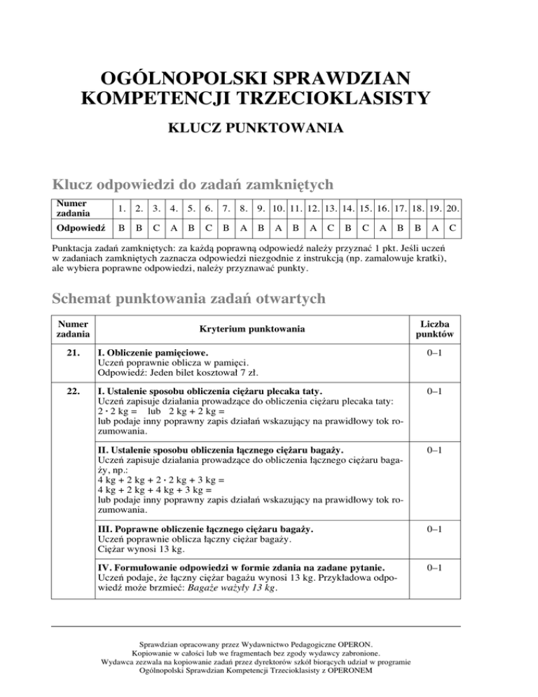 OGÓLNOPOLSKI SPRAWDZIAN KOMPETENCJI TRZECIOKLASISTY KLUCZ PUNKTOWANIA Klucz odpowiedzi do zadaƒ zamkni´tych Numer zadania 1. 2. 3. 4. 5. 6. 7. 8. 9. 10. 11. 12. 13. 14. 15. 16. 17. 18. 19. 20. Odpowiedê B B C A B C B A B A B A C B C A B B A C Punktacja zadaƒ zamkni´tych: za ka˝dà poprawnà odpowiedê nale˝y przyznaç 1 pkt. JeÊli uczeƒ w zadaniach zamkni´tych zaznacza odpowiedzi niezgodnie z instrukcjà (np. zamalowuje kratki), ale wybiera poprawne odpowiedzi, nale˝y przyznawaç punkty. Schemat punktowania zadaƒ otwartych Numer zadania Kryterium punktowania Liczba punktów 21. I. Obliczenie pami´ciowe. Uczeƒ poprawnie oblicza w pami´ci. Odpowiedê: Jeden bilet kosztowa∏ 7 z∏. 0–1 22. I. Ustalenie sposobu obliczenia ci´˝aru plecaka taty. Uczeƒ zapisuje dzia∏ania prowadzàce do obliczenia ci´˝aru plecaka taty: 2 • 2 kg = lub 2 kg + 2 kg = lub podaje inny poprawny zapis dzia∏aƒ wskazujàcy na prawid∏owy tok rozumowania. 0–1 II. Ustalenie sposobu obliczenia ∏àcznego ci´˝aru baga˝y. Uczeƒ zapisuje dzia∏ania prowadzàce do obliczenia ∏àcznego ci´˝aru baga˝y, np.: 4 kg + 2 kg + 2 • 2 kg + 3 kg = 4 kg + 2 kg + 4 kg + 3 kg = lub podaje inny poprawny zapis dzia∏aƒ wskazujàcy na prawid∏owy tok rozumowania. 0–1 III. Poprawne obliczenie ∏àcznego ci´˝aru baga˝y. Uczeƒ poprawnie oblicza ∏àczny ci´˝ar baga˝y. Ci´˝ar wynosi 13 kg. 0–1 IV. Formu∏owanie odpowiedzi w formie zdania na zadane pytanie. Uczeƒ podaje, ˝e ∏àczny ci´˝ar baga˝u wynosi 13 kg. Przyk∏adowa odpowiedê mo˝e brzmieç: Baga˝e wa˝y∏y 13 kg. 0–1 Sprawdzian opracowany przez Wydawnictwo Pedagogiczne OPERON. Kopiowanie w ca∏oÊci lub we fragmentach bez zgody wydawcy zabronione. Wydawca zezwala na kopiowanie zadaƒ przez dyrektorów szkó∏ bioràcych udzia∏ w programie Ogólnopolski Sprawdzian Kompetencji Trzecioklasisty z OPERONEM Klucz punktowania Ogólnopolskiego Sprawdzianu Kompetencji Trzecioklasisty z OPERONEM Numer zadania Kryterium punktowania Liczba punktów Uwagi ogólne: 1. Je˝eli uczeƒ poprawnie rozwiàza∏ zadanie, korzystajàc z innego sposobu ni˝ podany w kryteriach I–II, to otrzymuje maksymalnà liczb´ punktów. 2. JeÊli uczeƒ przedstawi b∏´dny sposób obliczenia ∏àcznego ci´˝aru baga˝y (np. pominie jednà wartoÊç), ale poprawnie doda zapisane przez siebie liczby, to otrzymuje punkty za kryterium III i IV. 3. JeÊli uczeƒ podaje tylko odpowiedê, to nie otrzymuje punktów. 23. I. Ustalenie sposobu obliczenia d∏ugoÊci boków kwadratu. Uczeƒ zapisuje dzia∏anie prowadzàce do obliczenia d∏ugoÊci boków kwadratu, np.: 4 • 12 cm = lub 2 • 12 cm + 2 • 12 cm = lub 12 cm + 12 cm + 12 cm + 12 cm = lub zastosuje inny poprawny zapis. 0–1 II. Poprawne obliczenie d∏ugoÊci boków kwadratu. Uczeƒ poprawnie oblicza zapisane przez siebie dzia∏anie. Wynik wynosi 48 cm. 0–1 III. Poprawne uzupe∏nienie odpowiedzi. Uczeƒ poprawnie uzupe∏nia odpowiedê, wpisujàc wyraz „krótsza”. 0–1 Uwagi ogólne: 1. JeÊli uczeƒ zapisze inne wartoÊci ni˝ podane w kryterium I, to nie otrzymuje punktu za to kryterium. 2. B∏àd rachunkowy pope∏niony w obliczeniach ocenianych za pomocà kryterium II nie powoduje obni˝enia punktacji w kryterium III. 3. Je˝eli uczeƒ poda odpowiedê niepoprawnà, ale zgodnà ze swoimi wyliczeniami, to otrzymuje punkt za kryterium III. 4. JeÊli uczeƒ wpisuje w odpowiedzi s∏owo „mniejsza”, otrzymuje punkt za kryterium III. 5. Zapisanie obliczeƒ bez podania jednostki miary nie wp∏ywa na przyznanie punktu. 24. Wybranie produktów zaliczanych do zdrowej ˝ywnoÊci. kanapki, rzodkiewki, sok, jab∏ko Za podanie dwóch poprawnych nazw produktów – 1 pkt Za podanie czterech poprawnych nazw produktów – 2 pkt 0–2 Uwagi ogólne: JeÊli uczeƒ zinterpretuje ilustracje przedstawiajàce rzodkiewki i jab∏ko jako inne warzywo lub owoc bàdê zapisze wyrazy „warzywa”, „owoce”, to nale˝y to uznaç. 25. 2 I. Stosowanie formy opowiadania. Uczeƒ nadaje pracy form´ opowiadania. 0–1 II. Realizacja tematu. Wypowiedê ucznia przynajmniej cz´Êciowo jest realizacjà tematu. Uczeƒ opowiedzia∏ o wycieczce w ciekawe miejsce. 0–1 III. SpójnoÊç tekstu. Wypowiedê jest spójna (kolejne zdania sà ze sobà powiàzane) i logicznie uporzàdkowana. 0–1 Klucz punktowania Ogólnopolskiego Sprawdzianu Kompetencji Trzecioklasisty z OPERONEM Numer zadania Kryterium punktowania Liczba punktów IV. Celowo dobrane Êrodki j´zykowe. Uczeƒ stosuje zró˝nicowane s∏ownictwo, u˝ywa trafnych zwrotów i okreÊleƒ. 0–1 V. Przestrzeganie norm j´zykowych. W pracach sk∏adajàcych si´ z 5 zdaƒ: – 2 b∏. j´z. – 2 pkt – 3–4 b∏. j´z. – 1 pkt – wi´cej ni˝ 4 b∏. j´z. – 0 pkt W pracach sk∏adajàcych si´ z wi´cej ni˝ 5 zdaƒ: – 4 b∏. j´z. – 2 pkt – 5–6 b∏. j´z. – 1 pkt – wi´cej ni˝ 6 b∏. j´z. – 0 pkt 0–2 VI. Przestrzeganie podstawowych norm ortograficznych. W pracach sk∏adajàcych si´ z 5 zdaƒ: – 3 b∏. ort. – 2 pkt – 4 b∏. ort. – 1 pkt – wi´cej ni˝ 4 b∏. ort. – 0 pkt W pracach sk∏adajàcych si´ z wi´cej ni˝ 5 zdaƒ: – 4 b∏. ort. – 2 pkt – 5 b∏. ort. – 1 pkt – wi´cej ni˝ 5 b∏. ort. – 0 pkt 0–2 VII. Przestrzeganie podstawowych norm interpunkcyjnych. Dopuszcza si´ 1 b∏àd interpunkcyjny w zapisie znaków interpunkcyjnych koƒczàcych zdania oraz 3 b∏´dy interpunkcyjne w zapisie przecinków przy wyliczaniu, myÊlników lub cudzys∏owów w dialogu oraz w innych sytuacjach ni˝ wymienione. 0–1 VIII. Dba∏oÊç o czytelnoÊç zapisu. Zapis jest czytelny. SkreÊlenia i naniesione poprawki nie zmniejszajà jego czytelnoÊci. 0–1 Uwagi ogólne: 1. Je˝eli praca ucznia sk∏ada si´ z mniej ni˝ 5 zdaƒ, punktuje si´ jà tylko za pomocà kryteriów I, II, III. 2. Nie wymaga si´, aby w tekÊcie zosta∏y wyró˝nione wst´p, rozwini´cie i zakoƒczenie. 3. JeÊli pod