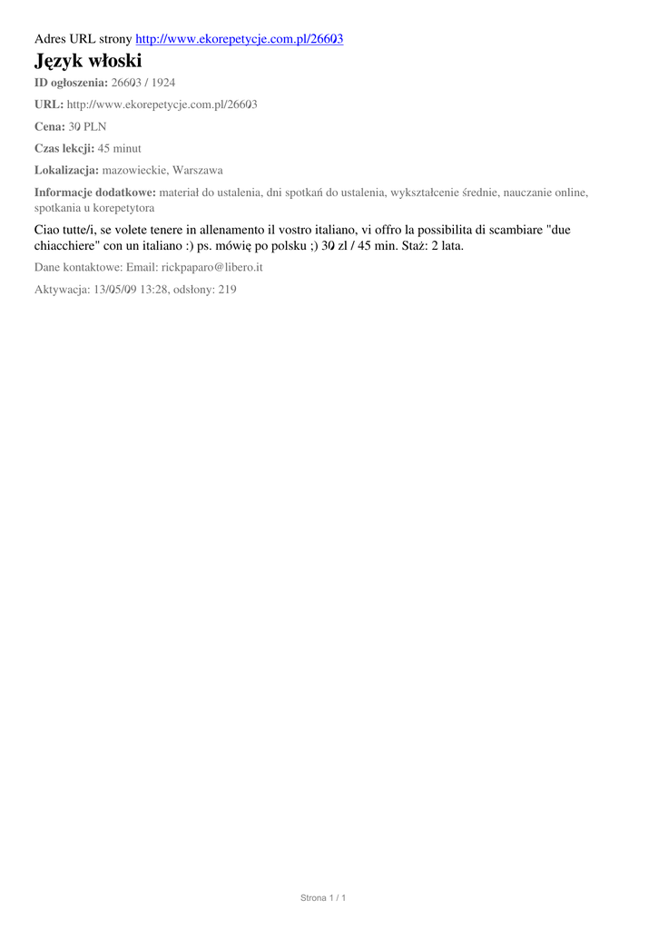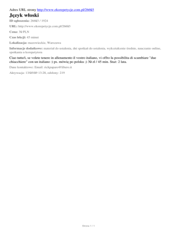 Adres URL strony http://www.ekorepetycje.com.pl/26603 Język włoski ID ogłoszenia: 26603 / 1924 URL: http://www.ekorepetycje.com.pl/26603 Cena: 30 PLN Czas lekcji: 45 minut Lokalizacja: mazowieckie, Warszawa Informacje dodatkowe: materiał do ustalenia, dni spotkań do ustalenia, wykształcenie średnie, nauczanie online, spotkania u korepetytora Ciao tutte/i, se volete tenere in allenamento il vostro italiano, vi offro la possibilita di scambiare "due chiacchiere" con un italiano :) ps. mówię po polsku ;) 30 zl / 45 min. Staż: 2 lata. Dane kontaktowe: Email: [email protected] Aktywacja: 13/05/09 13:28, odsłony: 219 Strona 1 / 1