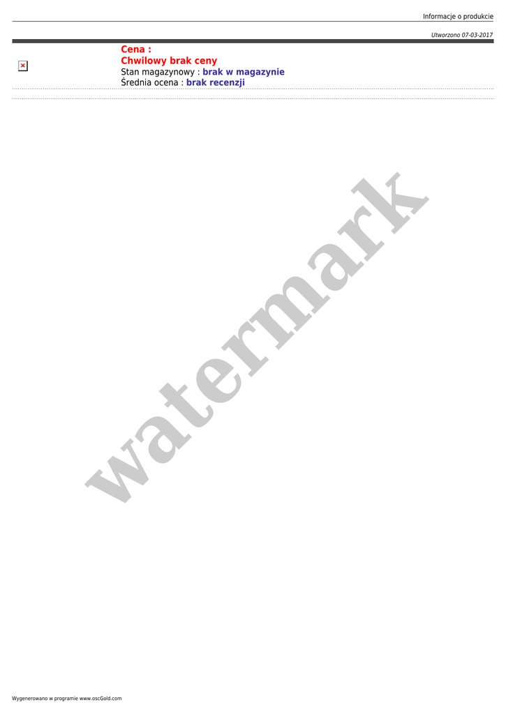 Informacje o produkcie Utworzono 07-03-2017 Cena : Chwilowy brak ceny w at er m ar k Stan magazynowy : brak w magazynie Średnia ocena : brak recenzji Wygenerowano w programie www.oscGold.com