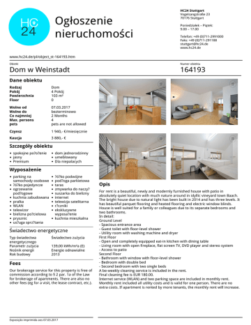 Ogłoszenie nieruchomości HC24 Stuttgart Vogelsangstraße 23 70176 Stuttgart Poniedziałek – Piątek: 9.00 – 17.00 Telefon: +49 (0)711-2991000 Faks: +49 (0)711-291188 [email protected] www.hc24.de www.hc24.de/pl/object_st-164193.htm Obiekt Numer obiektu Dom w Weinstadt 164193 Dane obiektu Rodzaj Pokój Powierzchnia Floor Dom 4 Pokój 103 m² 0 Wolne od Wolne do Co najmniej Max. persons pets 07.03.2017 bezterminowo 2 Months 4 pets are not allowed Czynsz 1 940,- €/miesięcznie Kaucja 3 880,- € Szczegóły obiektu spokojne po?o?enie jasny Premium dom jednorodzinny umeblowany Dla niepalacych Wyposażenie parking na samochody osobowe ?ó?ko pojedyncze ogrzewanie pod?ogowe kuchnia zabudowana pralka WLAN telewizor bielizna po?cielowa prysznic us?uga sprz?tania ?ó?ko podwójne pod?oga parkietowa taras zmywarka do naczy? suszarka do bielizny internet telewizja satelitarna r?czniki ekskluzywne wyposa?enie kuchnia mieszkalna Świadectwo energetyczne Typ świadectwa energetycznego Parametr zużycia Nośnik energii Rok budowy Świadectwo zużycia 139,00 kWh/m²a (E) Energie odnawialne 2013 Fees Our brokerage service for this property is free of commission according to § 2 par. 1a of the Law for brokerage of apartments. There are also no other fees (eg for a visit, the lease contract, etc.). Exposição imprimida aos 07.03.2017 Powered by TCPDF (www.tcpdf.org) Opis For rent is a beautiful, newly and modernly furnished house with patio in absolutely quiet location with much nature around in idyllic vineyard town Baach. The bright house due to natural light has been built in 2014 and has three levels. It has beautiful parquet flooring and heated flooring and electric window blinds. House is well suited for a family or colleagues due to its separate bedrooms and two bathrooms. In detail: Ground Level - Spacious entrance area - Guest toilet with floor-level shower - Utility room with washing machine and dryer First Floor - Open and completely equipped eat-in kitchen with dining table - Living room with open fireplace, flat screen TV, DVD player and stereo system - Access to patio Second Floor - Bathroom with window with floor-level shower - Bedroom with double bed - Second bedroom with two single beds A be-weekly cleaning service is included in the rent. Final cleaning fee is EUR 180.00. Internet service (WLAN) and two parking space are included in monthly rent. Monthly rent included all utility costs and is valid for one person. There are no extra costs. If apartment is rented by more tenants, the monthly rent will increase.