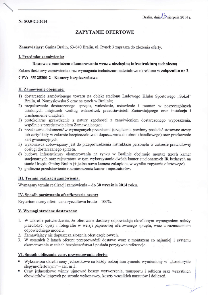 Bralin, dniai§ si erpnia2014 r. Nr S0.042.3.2014 ZAPYTANIE OFERTOWE Zamawiający: Gmina Bralin, 63-640 Bralin, ul. Rynek 3 zaprasza do ńożenia oferty. I. Przedmiot zamówienia: Dostawa z montażem okamerowania wraz z niezbędną infrastrukturą techniczną Zakes ilościowyzamówienia oraz wymagania techniczno-materiałowe okeślono w załączniku nr CPV: 2. 35125300-2 - Kamery bezpieczeństwa II. Zamówienie obeimuie: 1) dostarczenie zamówionego towaru na obiekt stadionu Ludowego Klubu Sporlowego ,,Sokół" 2) 3) 4) 5) 6) 7) Bralin, ul. Namysłowska 9 oraz na rynek w Bralinie; rozpakowanie dostarczonego sprzętu, wniesienie, ustawienie montaż w poszczególnych ustalonych miej scach według wskazówek przedstawicieli Zarńawiaj ące9o olaz instalacja i uruchomienie urządzeń. protokolame sprawdzenie nat:ulqy zgodnościz zamówieniem dostarczonego wyposa:żenia, wspólnie z przedstawicielem Zamavłiającego; przekazarlie dokumentów wymaganych przepisami (urządzenia powinny posiadać stosowne atesty lub ceĘfikaty w zakresie bezpieczeństwa i dopuszczenia do obrotu handlowego) oraz przekazarie kart gwarancyj nych. wykonawca zobowiązany jest do przeprowadzenia instruktażu personelu w zakresie prawidłowej obsfu gi dostarczanego splzętu. budowa infrastruktury okamerowania na rynku w Bralinie obejmuje montż trzech kamer stacjonamych olaz lejestTatora w tym wykorzystanie dwóch kamer stacjonamych IR będących na stanie Urzędu Gminy Bralin (+ jedna nowa kamera zakupiona w wyniku zapltania ofeńowego). graflczne przedstawienie rozmieszczenia kamer i rejestratorów. i z III. Termin realizacii zanówienia: Wymagany termin realizacji zamówienia - do 30 wneśnia 2014 roku. IV. Sposób porównania ofeń/kryteria oceny: KrYerium oceny ofeń: cena ryczahowa brutto - 100%. v. wvmogi stawiane dostawcom: 1. W zakesie 2. 3, potwierdzenia, że oferowane dostawy odpowiadają określonym wyqaganiom należy przedłożyć:opisy i fotografie w wersji papierowej oferowanego sprzętu, wraz z zaznaczeniem odpowiedniego modelu. zamawiający nie dopllszcza złożenia ofert częściowych, W ostatnich 2 latach oferent przeprowadził dostawę wlaz z montńem co najmniej 1 systemu okamerowania w celach bezpieczeństwa i posiada pozytlwłre referencje. vI. sposób obliczania ceny. przygotowania oferty: r . Wykonawca określiceny jednostkowe na kńdy rodzaj asortymentu wymieniony w ,,kosztorysie ślepym/ofertowym" zń. nr 3. Ceny jednostkowe winny ujmowaó kosźy wytworzenia, transportu i odbioru oraz wszystkich obowiązków leżących po stronie wykonawcy, kosźy wszelkich narzutów i doliczeń, . . . r r . . Wykonawca obliczy wartośćposzczególnych pozycji poptzez pomnożenie cen jednostkowych dla daaej pozycli przez ilośćjednostek. Wykonawca zsumuje wartośćwszystkich pozycji. Zsumowana wańośó stanowió będzie wartośó brutto realizacji danej częścizamówienia. Cenę oferty winna być zgodna z ceną wlłrikającą z kosźorysu ofertowego. Wszelkie ceny należy podawać z dokładnościądojednego grosza. Ewentualne upusty należy uwzględnió w cenach jednostkowych. Niedopuszczalne są upusĘ od wartości końcowej. Cena oferty winna byó obliczona przez wykonawcę jako jedyne i całkowite wynagrodzenie brutto (łącznie z podatkiem vat) należne wykonawcy za realizację całościprzedmiotu zamówienia w oferowanym terminie. Ofertę należy sporządzió w języku polskim, w formie pisemnej (wg zńączonego wzoru - zał. nt 1); Ofertę należy umieścićw zabezpieczonej kopercie opisanej: Gmina Bralin, 63-640 Bralin, ul. Rynek 3, naz:wa i adres Oferenta oraz napis uDostlwa z montażem okamełowania wraz z niezbędnq infrastr ukturq tec hnicznq" VII. Mieisce i termin złożeniaofert: Ofertę naleŻy dosiarcŻyć do dnia 29 sierpnia 2014 r. do godz. Rynek 3, sekretariat - pok, nr 8. 1200 do Urzędu Gminy Bralin, ul. oferta winna zawierać: 1. Formularz przedłoźeniaoferty - wg zńącznika w 7; 2. Kosztorys ofertowy - wg załącznlka nt 3; 3. Opisy i fotogtafie w wersji papierowej (np. karty katalogowe) oferowanego sprzętu; 4, Dokumenty potwierdzające prawidłowe wykonanie zrealizowanych dostaw (w tym referencje, protokoły odbioru) zaułierające następujące informacje: zaIrtańający dostawę, termin realizacji dostawy, wartośó dostawy; VIII. Ewentua|ne zapvtania kierowaó telefonicznie lub e-mailem: 1) Dawid Kosakiewicz - tel. (62) 78 II2 24, mńl: [email protected] -U.G. Bralin 2) Robert Kieruzal tel. (62) 78 112 18, mail: [email protected] - U.G. Bralin IX. Dodatkowe informacie; Zakup sprzętu współfinansowany ze środków w ramach dofinansowania Rzqdowego Program Ograniczania Przestępczości i Aspołecznych Zachowań prograln pn. ,, Razem bezpieczniej " - projeh ,,Zagraj w bezpieczne w Gminie Brąlin". Zaląezono:. Formularz przedłożenia ofeĘ; 2. Zestawieniesprzętu; 3. Kosztorys ślepy/ofertowy; 4. Wzór umowy; 5. Wzór oświadczenia o braku podstaw do wykluczenia. 6. Graficzne romrieszczenie kamer i rejestratorów. l. ( podpis Zana\łiające8o ) ),/