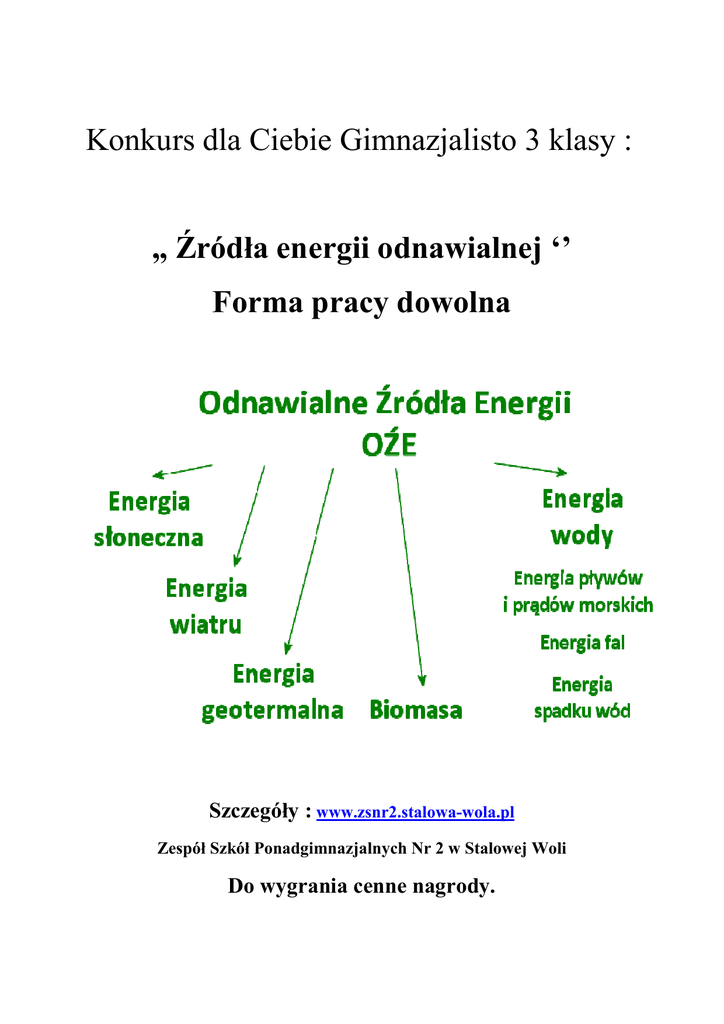 Konkurs dla Ciebie Gimnazjalisto 3 klasy : „ Źródła energii odnawialnej ‘’ Forma pracy dowolna Szczegóły : www.zsnr2.stalowa-wola.pl Zespół Szkół Ponadgimnazjalnych Nr 2 w Stalowej Woli Do wygrania cenne nagrody. Patronat Konkursu: Zespół Szkół Ponadgimnazjalnych Nr 2 im. Tadeusza Kościuszki w Stalowej Woli. Regulamin Konkursu 1. Organizator Organizatorem konkursu jest Zespół Szkół Ponadgimnazjalnych Nr 2 w Stalowej Woli. Nad konkursem czuwa nauczyciel przedmiotów zawodowych : mgr inż. Artur Wróblewski. ( [email protected]; tel. 505–65-25-33 ) 2. Cele konkursu Konkurs edukacyjny „ Źródła energii odnawialnej ” przyczyni się do wzrostu świadomości ekologicznej poprzez zdobycie lub poszerzenie wiedzy o odnawialnych źródłach energii, wśród uczestników trzecich klas szkół gimnazjalnych . Jest to szczególnie ważne w kontekście zachodzących obecnie w Polsce i całej Unii Europejskiej przemian gospodarczych. Wzrost świadomości społecznej przekłada się na lepsze wykorzystanie możliwości, jakie stwarzają odnawialne źródła energii. Głównym celem organizatora jest poszerzenie wiedzy z zakresu źródeł pozyskiwania energii i możliwości jej praktycznego wykorzystania. Po zrealizowaniu konkursu , jego uczestnicy będą potrafili zidentyfikować konsekwencje produkcji energii w tradycyjny sposób, wymienić źródła uzyskiwania energii odnawialnej. Wprowadzane są fachowe pojęcia z zakresu OZE oraz analizowane procesy produkcji energii. Dodatkowym celem jest propagowanie wykorzystania odnawialnych źródeł energii. 3. Czas trwania konkursu Konkurs edukacyjny „ Źródła energii odnawialnej ” realizowany będzie zgodnie z poniższym harmonogramem: • Termin składania prac do 15 kwiecień 2014 roku • Ocenienie prac i przyznanie nagród do końca kwietnia 2014 4. Zasięg terytorialny konkursu Konkurs kierowany jest do uczniów 3 klasy szkół gimnazjów znajdujących się w powiecie stalowowolskim. 5. Warunki uczestnictwa Uczestnikami konkursu są uczniowie kl. 3 gimnazjum. 6. Zasady uczestnictwa a) Warunkiem uczestnictwa jest niezbędne podanie danych takich jak: Miejscowość, w której znajduje się szkoła, Nazwa szkoły, Klasa, Imię i nazwisko, Adres e-mail, Numer legitymacji szkolnej. b) udział w konkursie jest równoznaczny z akceptacją treści niniejszego Regulaminu. c) Zgłoszenia nie odpowiadające warunkom Regulaminu lub dostarczone po terminie nie biorą udziału w Konkursie. d) Akceptacja Regulaminu przez uczestnika Konkursu jest równoznaczna ze złożeniem oświadczeń następujących treści: Zapoznałem się z Regulaminem i akceptuję jego wszystkie postanowienia Dobrowolnie przystąpiłem do uczestnictwa w Konkursie Dane podane przy rejestracji do Konkursu są zgodne z prawdą Oświadczam, że wszelkie treści, w tym dzieła, zdjęcia i dane osobowe są prawdziwe i nie naruszają jakichkolwiek praw autorskich i osobistych e) przygotowanie pracy w ramach Konkursu, musi być dokonane samodzielnie. Dzieła nadesłane na Konkurs muszą stanowić od początku do końca oryginalną twórczość osoby biorącej udział w Konkursie, nie mogą być obciążone prawami ustanowionymi na rzecz osób trzecich. Naruszenie przez uczestnika Konkursu któregokolwiek z wymienionych powyżej warunków uczestnictwa w Konkursie spowoduje utratę prawa do otrzymania nagrody. 7. Forma prac konkursowych Forma prac konkursowych dowolna np. prezentacja multimedialna. Prace można nadsyłać na adres e-mailowy opiekuna konkursu. 8. Wyniki konkursu Wyniki Konkursu będą opublikowane na stronie internetowej Zespołu Szkół Ponadgimnazjalnych Nr 2 w Stalowej Woli, na co każdy uczestnik wyraża zgodę. (http://www.zsnr2.stalowa-wola.pl/) Laureaci zostaną powiadomieni pocztą elektroniczną o zdobyciu nagrody. Dodatkowo o wynikach konkursu zostaną poinformowane placówki oświatowe, których uczniowie osiągnęli najlepsze rezultaty w konkursie. 9. Nagrody w konkursie a) Organizator przewidział nagrody za najciekawsze prace • Nagrody to między innymi wysokiej klasy Flashdrive ( pendrivy 16 GB ) • Nagrody pocieszenia dla wyróżniających się prac b) Nagrody będą przyznawane przez Komisję, w skład której wchodzić będą przedstawiciele ZSP Nr 2 w Stalowej Woli oraz przedstawiciele branży OZE. c) Za wygraną nagrodę nie przysługuje ekwiwalent pieniężny. d) ZSP Nr 2 w Stalowej Woli w uzasadnionych przypadkach ma prawo zmiany przyrzeczonych nagród, na nagrody o nie mniejszej wartości. 10. Komisja Do kontroli prawidłowości Konkursu oraz oceny nadesłanych prac powołana zostaje Komisja, w skład której wchodzić będą przedstawiciele ZSP NR 2 w Stalowej Woli oraz przedstawiciele branży energetycznej. 10. Postanowienia końcowe a) Regulamin niniejszego Konkursu jest dostępny na stronie http://www.zsnr2.stalowa-wola.pl b) ZSP Nr 2 ze Stalowej Woli oświadcza iż dane osobowe uczestników Konkursu tj. imię, nazwisko, adres będą przetwarzane przez Organizatora Konkursu wyłącznie na zasadach określonych w Regulaminie, w szczególności w celu opublikowania wyników Konkursu oraz przekazania laureatom nagród konkursowych.. Podanie danych jest dobrowolne, lecz ich brak uniemożliwia wysłanie przyrzeczonych w Konkursie nagród. Dane osobowe uczestników Konkursu będą chronione zgodnie z ustawą o ochronie danych osobowych. c) Biorąc udział w Konkursie, uczestnik potwierdza, że wyraża zgodę na wszystkie zasady zawarte w Regulaminie. d) Konkurs nie stanowi podstawy do wystawiania przez nauczycieli ocen z przedmiotów. e) W sprawach nieuregulowanych w niniejszym regulaminie zastosowanie znajdować będą przepisy Kodeksu Cywilnego.