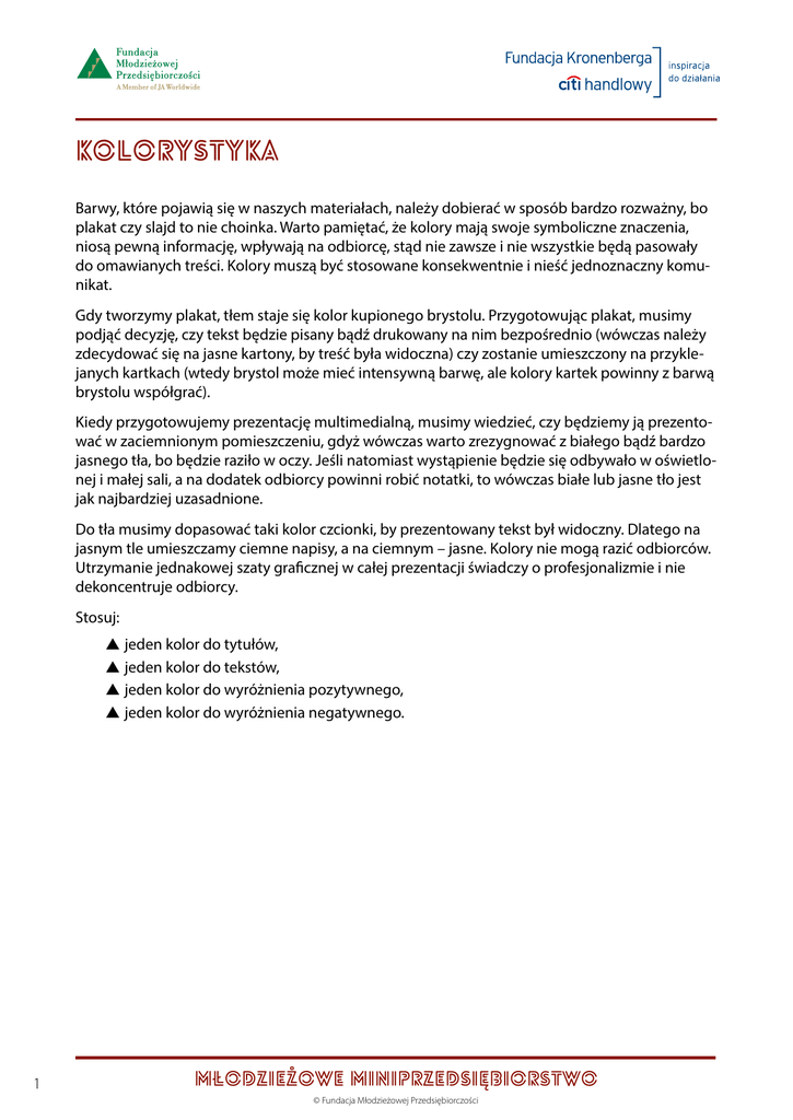 Kolorystyka Barwy, które pojawią się w naszych materiałach, należy dobierać w sposób bardzo rozważny, bo plakat czy slajd to nie choinka. Warto pamiętać, że kolory mają swoje symboliczne znaczenia, niosą pewną informację, wpływają na odbiorcę, stąd nie zawsze i nie wszystkie będą pasowały do omawianych treści. Kolory muszą być stosowane konsekwentnie i nieść jednoznaczny komunikat. Gdy tworzymy plakat, tłem staje się kolor kupionego brystolu. Przygotowując plakat, musimy podjąć decyzję, czy tekst będzie pisany bądź drukowany na nim bezpośrednio (wówczas należy zdecydować się na jasne kartony, by treść była widoczna) czy zostanie umieszczony na przyklejanych kartkach (wtedy brystol może mieć intensywną barwę, ale kolory kartek powinny z barwą brystolu współgrać). Kiedy przygotowujemy prezentację multimedialną, musimy wiedzieć, czy będziemy ją prezentować w zaciemnionym pomieszczeniu, gdyż wówczas warto zrezygnować z białego bądź bardzo jasnego tła, bo będzie raziło w oczy. Jeśli natomiast wystąpienie będzie się odbywało w oświetlonej i małej sali, a na dodatek odbiorcy powinni robić notatki, to wówczas białe lub jasne tło jest jak najbardziej uzasadnione. Do tła musimy dopasować taki kolor czcionki, by prezentowany tekst był widoczny. Dlatego na jasnym tle umieszczamy ciemne napisy, a na ciemnym – jasne. Kolory nie mogą razić odbiorców. Utrzymanie jednakowej szaty graficznej w całej prezentacji świadczy o profesjonalizmie i nie dekoncentruje odbiorcy. Stosuj: ss jeden kolor do tytułów, ss jeden kolor do tekstów, ss jeden kolor do wyróżnienia pozytywnego, ss jeden kolor do wyróżnienia negatywnego. 1 MŁODZIEŻOWE MINIPRZEDSIĘBIORSTWO © Fundacja Młodzieżowej Przedsiębiorczości