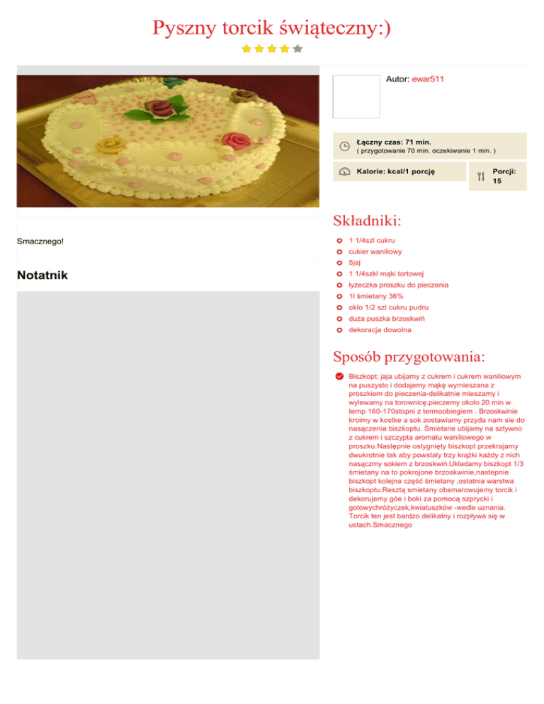 Pyszny torcik świąteczny:) Autor: ewar511 Łączny czas: 71 min. ( przygotowanie 70 min. oczekiwanie 1 min. ) Kalorie: kcal/1 porcję Porcji: 15 Składniki: Smacznego! 1 1/4szl cukru cukier waniliowy 5jaj Notatnik 1 1/4szkl mąki tortowej łyżeczka proszku do pieczenia 1l śmietany 36% oklo 1/2 szl cukru pudru duża puszka brzoskwiń dekoracja dowolna Sposób przygotowania: Biszkopt; jaja ubijamy z cukrem i cukrem waniliowym na puszysto i dodajemy mąkę wymieszana z proszkiem do pieczeniadelikatnie mieszamy i wylewamy na torownicę.pieczemy okolo 20 min w temp 160170stopni z termoobiegiem . Brzoskwinie kroimy w kostke a sok zostawiamy przyda nam sie do nasączenia biszkoptu. Śmietane ubijamy na sztywno z cukrem i szczypta aromatu waniliowego w proszku.Następnie ostygnięty biszkopt przekrajamy dwukrotnie tak aby powstaly trzy krążki każdy z nich nasączmy sokiem z brzoskwiń.Ukladamy biszkopt 1/3 śmietany na to pokrojone brzoskwinie,nastepnie biszkopt kolejna część śmietany ,ostatnia warstwa biszkoptu.Resztą smietany obsmarowujemy torcik i dekorujemy góe i boki za pomocą szprycki i gotowychróżyczek,kwiatuszków wedle uznania. Torcik ten jest bardzo delikatny i rozpływa się w ustach.Smacznego