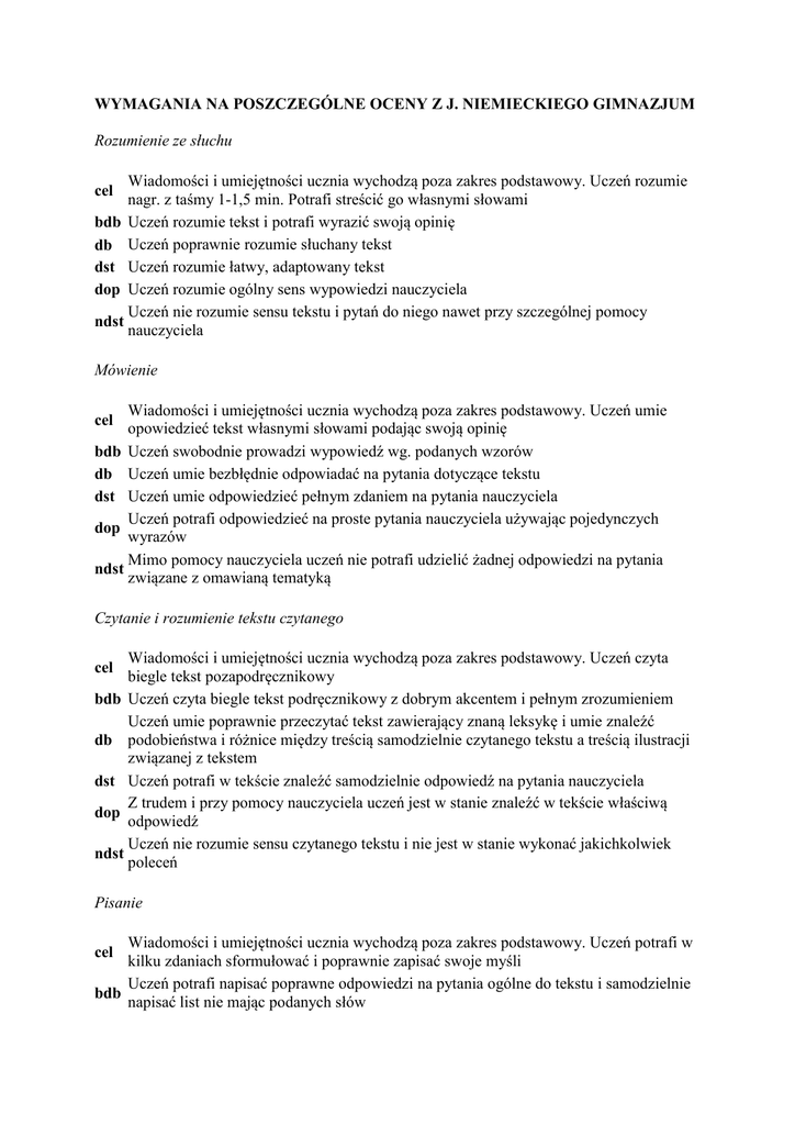 WYMAGANIA NA POSZCZEGÓLNE OCENY Z J. NIEMIECKIEGO GIMNAZJUM Rozumienie ze słuchu Wiadomości i umiejętności ucznia wychodzą poza zakres podstawowy. Uczeń rozumie nagr. z taśmy 1-1,5 min. Potrafi streścić go własnymi słowami bdb Uczeń rozumie tekst i potrafi wyrazić swoją opinię db Uczeń poprawnie rozumie słuchany tekst dst Uczeń rozumie łatwy, adaptowany tekst dop Uczeń rozumie ogólny sens wypowiedzi nauczyciela Uczeń nie rozumie sensu tekstu i pytań do niego nawet przy szczególnej pomocy ndst nauczyciela cel Mówienie Wiadomości i umiejętności ucznia wychodzą poza zakres podstawowy. Uczeń umie opowiedzieć tekst własnymi słowami podając swoją opinię bdb Uczeń swobodnie prowadzi wypowiedź wg. podanych wzorów db Uczeń umie bezbłędnie odpowiadać na pytania dotyczące tekstu dst Uczeń umie odpowiedzieć pełnym zdaniem na pytania nauczyciela Uczeń potrafi odpowiedzieć na proste pytania nauczyciela używając pojedynczych dop wyrazów Mimo pomocy nauczyciela uczeń nie potrafi udzielić żadnej odpowiedzi na pytania ndst związane z omawianą tematyką cel Czytanie i rozumienie tekstu czytanego Wiadomości i umiejętności ucznia wychodzą poza zakres podstawowy. Uczeń czyta biegle tekst pozapodręcznikowy bdb Uczeń czyta biegle tekst podręcznikowy z dobrym akcentem i pełnym zrozumieniem Uczeń umie poprawnie przeczytać tekst zawierający znaną leksykę i umie znaleźć db podobieństwa i różnice między treścią samodzielnie czytanego tekstu a treścią ilustracji związanej z tekstem dst Uczeń potrafi w tekście znaleźć samodzielnie odpowiedź na pytania nauczyciela Z trudem i przy pomocy nauczyciela uczeń jest w stanie znaleźć w tekście właściwą dop odpowiedź Uczeń nie rozumie sensu czytanego tekstu i nie jest w stanie wykonać jakichkolwiek ndst poleceń cel Pisanie Wiadomości i umiejętności ucznia wychodzą poza zakres podstawowy. Uczeń potrafi w kilku zdaniach sformułować i poprawnie zapisać swoje myśli Uczeń potrafi napisać poprawne odpowiedzi na pytania ogólne do tekstu i samodzielnie bdb napisać list nie mając podanych słów cel db Uczeń potrafi samodzielnie napisać list z możliwością korzystania ze słownika dst Mając podane zwroty uczeń potrafi napisać krótki list Uczeń potrafi z pamięci napisać pewne zwroty i sentencje. Mając podane słowa uczeń dop potrafi wstawić je w luki w liście Uczeń nie potrafi napisać bezbłędnie podstawowych zwrotów ani nawet pojedynczych ndst wyrazów Gramatyka Wiadomości i umiejętności ucznia wychodzą poza zakres podstawowy. Uczeń potrafi swobodnie wypowiadać się w czasie przyszłym(Futur), przeszłych(Perfekt, Präteritum) cel używając poprawnie gramatycznie zbudowanych zdań podrzędnie złożonych stosując określenia przyimkowe i przymiotnikowe Uczeń potrafi napisać i powiedzieć proste zdania złożone w cz. przeszłych i przyszłym, bdb zastosować odpowiednie przyimki i poprawnie odmienione przymiotniki z r. określ. i nieokreśl. w zdaniach Uczeń potrafi zastosować podane czasowniki w cz. przeszłych i przyszłym oraz db przyporządkować podane przyimki i wypełnić końcowki rzymiotników Uczeń potrafi odmienić czasowniki modalne oraz pozostałe w cz. przyszłym i dst przeszłych, zna przyimki oraz odmienia przymiotniki przez przypadki Uczeń potrafi z pomocą nauczyciela odmienić czasowniki modalne oraz pozostałe w cz. dop przyszłym i przeszłych, zna przyimki oraz odmienia przymiotniki z rodz. określ. i nieokreśl. przez przypadki Uczeń nie potrafi odmienić czasowniki modalne oraz pozostałe w cz. przyszłym i ndst przeszłych nawet z pomocą nauczyciela, nie zna przyimków oraz nie odmienia przymiotników z rodz. określ. i nieokreśl. przez przypadki 1. DIAGNOZA WSTĘPNA UCZNIA W KLASIE PIERWSZEJ GIMNAZJUM Umiejętności uczniów sprawdzane są na pierwszych trzech godzinach lekcyjnych i polegają na prowadzeniu na pierwszej godzinie dialogu zawierającego podstawowe wiadomości leksykalne przerobione w szkole podstawowej. Poprzez swobodną rozmowę można się zorientować czy uczeń poprawnie wymawia, akcentuje i stosuje zasady gramatyczne a także na jaką skalę ma opanowane słownictwo. Pozostałe dwie godziny to powtórzenie wiadomości gramatycznych ze szkoły podstawowej oraz test sprawdzający opanowane wiadomości. 2. WYMAGANIA PROGRAMOWE Z JĘZYKA NIEMIECKIEGO Wymagania programowe z języka niemieckiego dla poszczególnych klas są wywieszone na gazetce klasowej w sali 44. Z wymaganiami programowymi zarówno uczniowie jak i rodzice zostają zapoznani na początku każdego roku szkolnego i mają możliwość wglądu w każdej chwili. 3. FORMY AKTYWNOŚCI PODLEGAJĄCE OCENIE Uczniowie mogą się wykazać: o aktywnością na lekcji, o dodatkowym zadaniem domowym, o ciekawie odrobionym zadaniem domowym, o prowadzonymi dialogami, o pracą w grupach, o pracą nad projektem,w o o o o wykonaniem plakatu, collage’u, sprawozdaniem z przeczytanej książki, artykułu z czasopisma, oglądanego programu telewizyjnego lub filmu, przedstawieniem scenki teatralnej lub rodzajowej, uczestnictwem w konkursach przedmiotowym, recytatorskim, literackim, 4. METODY I ZASADY SPRAWDZANIA UMIEJĘTNOŚCI I WIADOMOŚCI Uczniowie są oceniani z prac klasowych, pisemnych i ustnych odpowiedzi, prac domowych, prac długoterminowych (plakaty, sprawozdania, projekty) oraz z aktywności. o W ciągu roku szkolnego przeprowadzam cztery lub sześć prac klasowych czyli dwie lub trzy na jeden semestr, które są zapowiedziane co najmniej z tygodniowym wyprzedzeniem i poprzedzone godziną powtórzeniową. o Prace klasowe obejmują sprawdzenie czterech rodzajów umiejętności: rozumienia ze słuchu, rozumienia czytanego tekstu, wypowiedż pisemną i część gramatyczną (zadania). Oceny z prac klasowych: celujący – bdb + zad. dodatkowe bdb - 100% - 86% db – 85 – 71% dst – 70 – 51% dop – 50 – 31% ndst – 30%-0% o o o o o Odpowiedzi