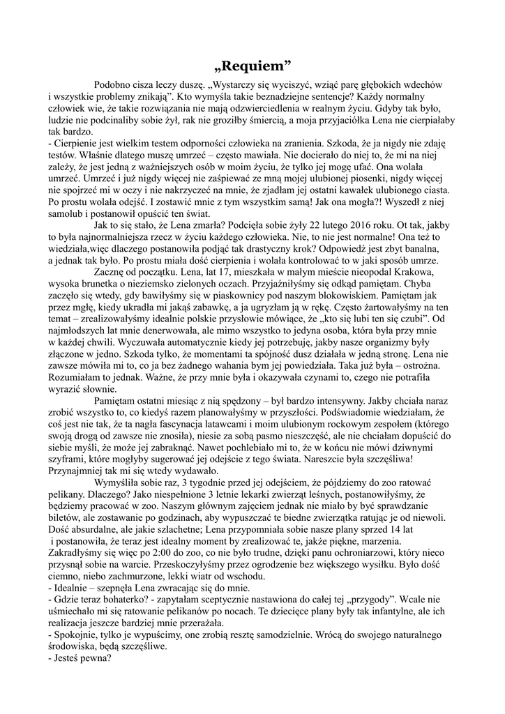 „Requiem” Podobno cisza leczy duszę. „Wystarczy się wyciszyć, wziąć parę głębokich wdechów i wszystkie problemy znikają”. Kto wymyśla takie beznadziejne sentencje? Każdy normalny człowiek wie, że takie rozwiązania nie mają odzwierciedlenia w realnym życiu. Gdyby tak było, ludzie nie podcinaliby sobie żył, rak nie groziłby śmiercią, a moja przyjaciółka Lena nie cierpiałaby tak bardzo. - Cierpienie jest wielkim testem odporności człowieka na zranienia. Szkoda, że ja nigdy nie zdaję testów. Właśnie dlatego muszę umrzeć – często mawiała. Nie docierało do niej to, że mi na niej zależy, że jest jedną z ważniejszych osób w moim życiu, że tylko jej mogę ufać. Ona wolała umrzeć. Umrzeć i już nigdy więcej nie zaśpiewać ze mną mojej ulubionej piosenki, nigdy więcej nie spojrzeć mi w oczy i nie nakrzyczeć na mnie, że zjadłam jej ostatni kawałek ulubionego ciasta. Po prostu wolała odejść. I zostawić mnie z tym wszystkim samą! Jak ona mogła?! Wyszedł z niej samolub i postanowił opuścić ten świat. Jak to się stało, że Lena zmarła? Podcięła sobie żyły 22 lutego 2016 roku. Ot tak, jakby to była najnormalniejsza rzecz w życiu każdego człowieka. Nie, to nie jest normalne! Ona też to wiedziała,więc dlaczego postanowiła podjąć tak drastyczny krok? Odpowiedź jest zbyt banalna, a jednak tak było. Po prostu miała dość cierpienia i wolała kontrolować to w jaki sposób umrze. Zacznę od początku. Lena, lat 17, mieszkała w małym mieście nieopodal Krakowa, wysoka brunetka o nieziemsko zielonych oczach. Przyjaźniłyśmy się odkąd pamiętam. Chyba zaczęło się wtedy, gdy bawiłyśmy się w piaskownicy pod naszym blokowiskiem. Pamiętam jak przez mgłę, kiedy ukradła mi jakąś zabawkę, a ja ugryzłam ją w rękę. Często żartowałyśmy na ten temat – zrealizowałyśmy idealnie polskie przysłowie mówiące, że „kto się lubi ten się czubi”. Od najmłodszych lat mnie denerwowała, ale mimo wszystko to jedyna osoba, która była przy mnie w każdej chwili. Wyczuwała automatycznie kiedy jej potrzebuję, jakby nasze organizmy były złączone w jedno. Szkoda tylko, że momentami ta spójność dusz działała w jedną stronę. Lena nie zawsze mówiła mi to, co ja bez żadnego wahania bym jej powiedziała. Taka już była – ostrożna. Rozumiałam to jednak. Ważne, że przy mnie była i okazywała czynami to, czego nie potrafiła wyrazić słownie. Pamiętam ostatni miesiąc z nią spędzony – był bardzo intensywny. Jakby chciała naraz zrobić wszystko to, co kiedyś razem planowałyśmy w przyszłości. Podświadomie wiedziałam, że coś jest nie tak, że ta nagła fascynacja latawcami i moim ulubionym rockowym zespołem (którego swoją drogą od zawsze nie znosiła), niesie za sobą pasmo nieszczęść, ale nie chciałam dopuścić do siebie myśli, że może jej zabraknąć. Nawet pochlebiało mi to, że w końcu nie mówi dziwnymi szyframi, które mogłyby sugerować jej odejście z tego świata. Nareszcie była szczęśliwa! Przynajmniej tak mi się wtedy wydawało. Wymyśliła sobie raz, 3 tygodnie przed jej odejściem, że pójdziemy do zoo ratować pelikany. Dlaczego? Jako niespełnione 3 letnie lekarki zwierząt leśnych, postanowiłyśmy, że będziemy pracować w zoo. Naszym głównym zajęciem jednak nie miało by być sprawdzanie biletów, ale zostawanie po godzinach, aby wypuszczać te biedne zwierzątka ratując je od niewoli. Dość absurdalne, ale jakie szlachetne; Lena przypomniała sobie nasze plany sprzed 14 lat i postanowiła, że teraz jest idealny moment by zrealizować te, jakże piękne, marzenia. Zakradłyśmy się więc po 2:00 do zoo, co nie było trudne, dzięki panu ochroniarzowi, który nieco przysnął sobie na warcie. Przeskoczyłyśmy przez ogrodzenie bez większego wysiłku. Było dość ciemno, niebo zachmurzone, lekki wiatr od wschodu. - Idealnie – szepnęła Lena zwracając się do mnie. - Gdzie teraz bohaterko? - zapytałam sceptycznie nastawiona do całej tej „przygody”. Wcale nie uśmiechało mi się ratowanie pelikanów po nocach. Te dziecięce plany były tak infantylne, ale ich realizacja jeszcze bardziej mnie przerażała. - Spokojnie, tylko je wypuścimy, one zrobią resztę samodzielnie. Wrócą do swojego naturalnego środowiska, będą szczęśliwe. - Jesteś pewna? - Oczywiście, że nie. Niczego nie można być w życiu pewnym, jedynie śmierć jest pewniakiem w tej dziedzinie, ale o tym kiedy indziej – pelikany na nas czekają! - powiedziała to z taką radością w oczach, jakby sama miała zaraz odfrunąć i uwolnić się od tej kuli, którą od tak dawna ma przyczepioną do swej nogi. Od razu opuściły mnie wątpliwości i choć to szalone, popędziłam pierwsza ile sił w nogach w stronę klatek uwięzionych ptaków. Gdy dotarłyśmy na miejsce, przyjaciółka zaczęła szukać czegoś po kieszeniach. - Hej, skąd masz klucz?– zapytałam Lenę widząc, że to właśnie klucz był jej celem do odnalezienia w pojemnych kieszeniach spodni. - Plan idealny tyczy się również tego, że trzeba idealnie podkraść pewne rzeczy. - Aha? - zapytałam sarkastycznie nie za bardzo rozumiejąc. - Ukradłam ochroniarzowi. To żaden problem skoro śpi. - O więcej nie pytałam, po prostu działałam. Lena podała mi klucz, a ja otwarłam klatkę pozwalając, by ptaki leciały ponad przestworzami do swojego, lepszego świata. W końcu były wolne, samodzielne i szczęśliwe. Może mi się wydawało, ale widziałam łzy w oczach towarzyszki. Wolałam nie drążyć tematu, by jej nie speszyć, ale to było tak niezwykłe ujrzeć w niej wzruszenie, jak to, że pelikany leciały nad Krakowem w środku nocy. Innym razem zabrała mnie by popuszczać latawce. Nie robiłyśmy tego od dzieciństwa, a przecież kiedyś sprawiało nam to tak ogromną przyjemność. Bardzo się ucieszyłam na wieść o wietrznej pogodzie i popędziłam wraz z Len