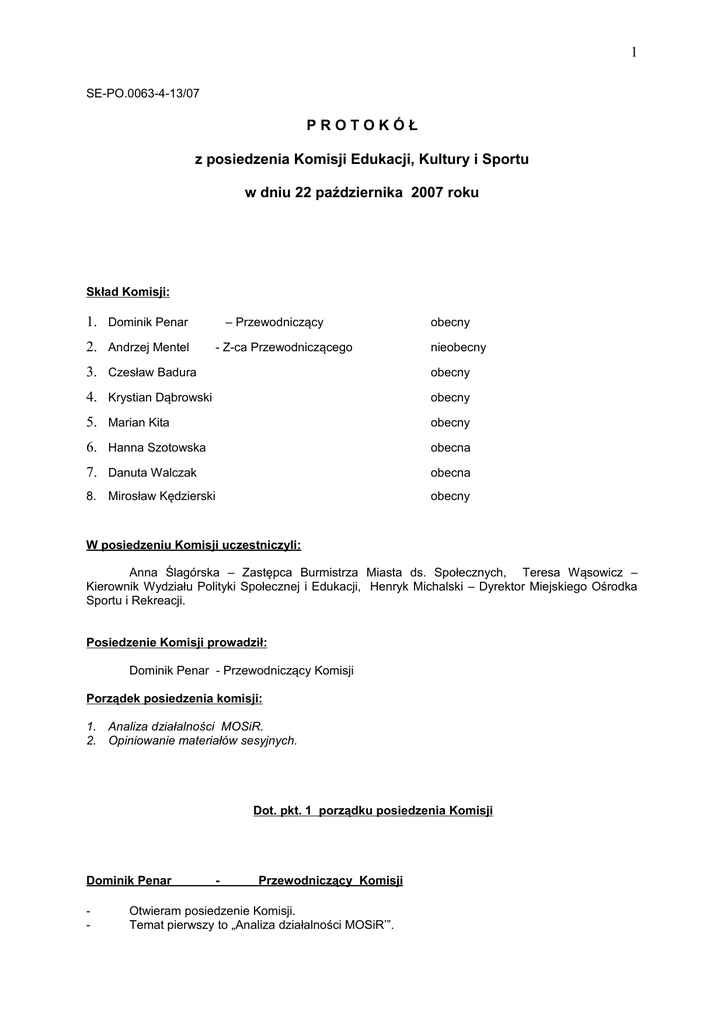 1 SE-PO.0063-4-13/07 PROTOKÓŁ z posiedzenia Komisji Edukacji, Kultury i Sportu w dniu 22 października 2007 roku Skład Komisji: 1. Dominik Penar 2. Andrzej Mentel – Przewodniczący - Z-ca Przewodniczącego obecny nieobecny 3. Czesław Badura obecny 4. Krystian Dąbrowski obecny 5. Marian Kita obecny 6. Hanna Szotowska obecna 7. Danuta Walczak obecna 8. Mirosław Kędzierski obecny W posiedzeniu Komisji uczestniczyli: Anna Ślagórska – Zastępca Burmistrza Miasta ds. Społecznych, Teresa Wąsowicz – Kierownik Wydziału Polityki Społecznej i Edukacji, Henryk Michalski – Dyrektor Miejskiego Ośrodka Sportu i Rekreacji. Posiedzenie Komisji prowadził: Dominik Penar - Przewodniczący Komisji Porządek posiedzenia komisji: 1. Analiza działalności MOSiR. 2. Opiniowanie materiałów sesyjnych. Dot. pkt. 1 porządku posiedzenia Komisji Dominik Penar - - Przewodniczący Komisji Otwieram posiedzenie Komisji. Temat pierwszy to „Analiza działalności MOSiR’”. 2 Henryk Michalski - - Dyrektor MOSiR Dokonuje wprowadzenia do materiałów. DYSKUSJA W dyskusji udział wzięli: 1. Danuta Walczak 2. Anna Ślagórska 3. Mirosław Kędzierski 4. Dominik Penar 5. Hanna Szołowska 6. Teresa Wąsowicz 7. Marian Kita 8. Czesław Badura - członek Komisji Zastępca Burmistrza ds. Społecznych członek Komisji Przewodniczący Komisji członek Komisji Kierownik Wydziału Polityki Społecznej i Edukacji członek Komisji członek Komisji Członkowie Komisji zapoznali się z rozkładem pomieszczeń oraz zakresem wykonanych remontów na terenie Hali Sportowej. Komisja pozytywnie zaopiniowała materiały nt. „Analiza działalności MOSiR”. Dot. pkt. 2 porządku posiedzenia Komisji Dominik Penar - - Zastępca Burmistrza Miasta ds. Społecznych Dokonuje wprowadzenia do tematu 2006/2007 rok”. Teresa Wąsowicz - Przewodniczący Komisji Kultura oraz Sport w mieście- sprawozdanie za 2006/2007 rok. Anna Ślagórska - - - „Kultura oraz Sport w mieście - sprawozdanie za Kierownik Wydziału Polityki Społecznej i Edukacji Omawia temat sesyjny „Kultura oraz Sport w mieście - sprawozdanie za 2006/2007 rok”. 3 DYSKUSJA W dyskusji udział wzięli: 1. Dominik Penar 2. Danuta Walczak 3. 4. 5. 6. - Mirosław Kędzierski Anna Ślagórska Teresa Wąsowicz Czesław Badura Przewodniczący Komisji członek Komisji członek Komisji Zastępca Burmistrza ds. Społecznych Kierownik Wydziału Polityki Społecznej i Edukacji członek Komisji Przewodniczący Komisji przystąpił do przegłosowania przyjęcia materiałów nt. „Kultura oraz Sport w mieście - sprawozdanie za 2006/2007 rok”. Obecnych 6 członków Komisji Głosowanie 5 0 1 głosów za głosów przeciwnych głos wstrzymujący się Dominik Penar - Przewodniczący Komisji Program „Przedsiębiorczość”. Anna Ślagórska - - - Zastępca Burmistrza Miasta ds. Społecznych Dokonuje wprowadzenia do Programu „Przedsiębiorczość”. DYSKUSJA W dyskusji udział wzięli: 1. Dominik Penar 2. Anna Ślagórska 3. Hanna Szotowska Dominik Penar - - - Przewodniczący Komisji Zastępca Burmistrza ds. Społecznych członek Komisji Przewodniczący Komisji Zaproponował zwołanie posiedzenia Komisji nt. polityki oświatowej w mieście. DYSKUSJA 4 W dyskusji udział wzięli: 1. Dominik Penar 2. Anna Ślagórska 3. Krystian Dąbrowski 4. Teresa Wąsowicz 5. Danuta Walczak 6. Mirosław Kędzierski Dominik Penar - - - Przewodniczący Komisji Zastępca Burmistrza ds. Społecznych członek Komisji Kierownik Wydziału Polityki Społecznej i Edukacji członek Komisji członek Komisji Przewodniczący Komisji Projekt uchwały w sprawie zmian w budżecie miasta na 2007 rok. DYSKUSJA W dyskusji udział wzięli: 1. 2. 3. 4. 5. Dominik Penar Danuta Walczak Teresa Wąsowicz Czesław Badura Anna Ślagórska Dominik Penar - - - Przewodniczący Komisji członek Komisji Kierownik Wydziału Polityki Społecznej i Edukacji członek Komisji Zastępca Burmistrza ds. Społecznych Przewodniczący Komisji Projekt uchwały w sprawie regulaminu przyznawania stypendiów sportowych dla wybitnych sportowców. DYSKUSJA W dyskusji udział wzięli: 1. 2. 3. 4. 5. 6. 7. Dominik Penar Krystian Dabrowski Teresa Wąsowicz Anna Ślagórska Czesław Badura Danuta Walczak Mirosław Kędzierski - Przewodniczący Komisji członek Komisji Kierownik Wydziału Polityki Społecznej i Edukacji Zastępca Burmistrza ds. Społecznych członek Komisji członek Komisji członek Komisji Przewodniczący Komisji poddał pod głosowanie następujące wnioski: 5 1. Komisja wnioskuje o przygotowanie na najbliższą sesję Rady Miejskiej propozycji realizowanych inwestycji MOSiR-u na 2008 rok i środków finansowych, które będą wykorzystane z własnych środków MOSiR i środków z zewnątrz i określenie źródła ich pochodzenia. Obecnych 5 członków Komisji Głosowanie 5 0 0 głosów za głosów przeciwnych głosów wstrzymujących się 2. Komisja wnioskuje o przedstawienie koncepcji zagospodarowania obiektów sportowych MOSiR w tzw. Dolinie Brynicy oraz w okolicach klubu Trafik w Czeladzi – Piaski z uwzględnieniem działalności kulturalnej i sportowej oraz umiejscowienie ich w czasie. Obecnych 5 członków Komisji Głosowanie 5 0 0 głosów za głosów przeciwnych głosów wstrzymujących się 3. Komisja wnioskuje o zorganizowanie w MOSiR corocznego dnia Miejskiego Ośrodka Sportu i Rekreacji – imprezy promocyjno – informacyjnej. Obecnych 5 członków Komisji Głosowanie 5 0 0 głosów za głosów przeciwnych głosów wstrzymujących się 6 4. Komisja wnioskuje o zorganizowanie spotkania prezentującego plany związane z polityką edukacyjną w mieście na poziomie szkół ponad gimnazjalnych do 15 grudnia z udziałem przedstawicieli szkół, władz miasta oraz powiatu. Obecnych 5 członków Komisji Głosowanie 5 0 0 głosów za głosów przeciwnych głosów wstrzymujących się 5. Komisja wnioskuje o stworzenie w bibliotekach miejskich oraz filiach tych bibliotek punktów informacyjnych – dostęp do 