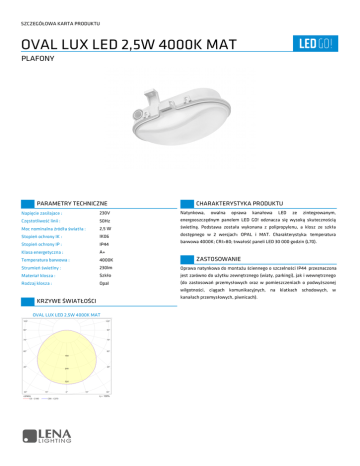 SZCZEGÓŁOWA KARTA PRODUKTU OVAL LUX LED 2,5W 4000K MAT PLAFONY PARAMETRY TECHNICZNE CHARAKTERYSTYKA PRODUKTU Napięcie zasilajace : 230V Natynkowa, owalna oprawa kanałowa LED ze zintegrowanym, Częstotliwość linii : 50Hz energooszczędnym panelem LED GO! odznacza się wysoką skutecznością Moc nominalna źródła światła : 2,5 W świetlną. Podstawa została wykonana z polipropylenu, a klosz ze szkła Stopień ochrony IK : IK06 dostępnego w 2 wersjach: OPAL i MAT. Charakterystyka: temperatura Stopień ochrony IP : IP44 Klasa energetyczna : A+ Temperatura barwowa : 4000K Strumień świetlny : 230lm Oprawa natynkowa do montażu ściennego o szczelności IP44 przeznaczona Materiał klosza : Szkło jest zarówno do użytku zewnętrznego (wiaty, parkingi), jak i wewnętrznego Rodzaj klosza : Opal (do zastosowań przemysłowych oraz w pomieszczeniach o podwyższonej barwowa 4000K; CRI>80; trwałość paneli LED 30 000 godzin (L70). ZASTOSOWANIE wilgotności, ciągach komunikacyjnych, na klatkach schodowych, w KRZYWE ŚWIATŁOŚCI OVAL LUX LED 2,5W 4000K MAT kanałach przemysłowych, piwnicach). SZCZEGÓŁOWA KARTA PRODUKTU OVAL LUX LED 2,5W 4000K MAT PLAFONY TABELA PARAMETRÓW TECHNICZNYCH indeks: 233456 Napięcie zasilajace: 230V Częstotliwość linii: 50Hz Moc nominalna źródła światła: 2,5 W Stopień ochrony IK: IK06 Stopień ochrony IP: IP44 Skuteczność świetlna: 77lm/W Klasa energetyczna: A+ Klasa ochrony: I Wymiary: 170/130/70mm Waga: 0,33kg Materiał korpusu: PP Temperatura barwowa: 4000K Sposób montażu: Natynkowy Kolor: Biały Strumień świetlny: 230lm Moc znamionowa oprawy: 2,8W Kod EAN: 5905963233456 Oznaczenie CE: Tak Materiał klosza: Szkło Rodzaj klosza: Opal Nominalny okres trwałości lampy: 30000h Znamionowa trwałość lampy: 30000h Oddawanie barw: Ra>80 Źródło światła: LED GO! Źródło światła wymienne: Nie Data aktualizacji karty: 2016-06-13 6/2016 www.lenalighting.pl | Strona 2