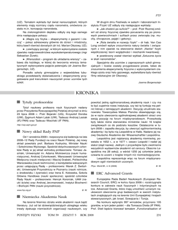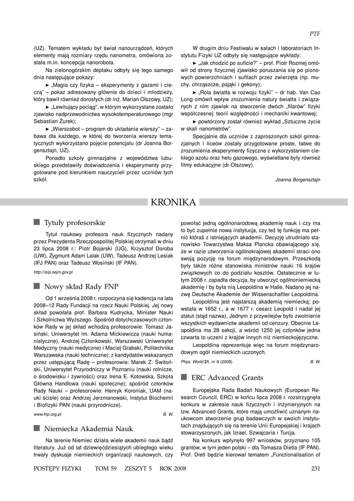 PTF (UZ). Tematem wykładu był świat nanourządzeń, których elementy mają rozmiary rzędu nanometra, omówiona została m.in. koncepcja nanorobota. Na zielonogórskim deptaku odbyły się tego samego dnia następujące pokazy: ◮ „Magia czy fizyka – eksperymenty z gazami i cieczą” – pokaz adresowany głównie do dzieci i młodzieży, który bawił również dorosłych (dr inż. Marian Olszowy, UZ); ◮ „Lewitujący pociąg”, w którym wykorzystane zostało zjawisko nadprzewodnictwa wysokotemperaturowego (mgr Sebastian Żurek); ◮ „Wierszobot – program do układania wierszy” – zabawa dla każdego, w której do tworzenia wierszy tematycznych wykorzystano pojęcie potencjału (dr Joanna Borgensztajn, UZ). Ponadto szkoły gimnazjalne z województwa lubuskiego przedstawiły doświadczenia i eksperymenty przygotowane pod kierunkiem nauczycieli przez uczniów tych szkół. W drugim dniu Festiwalu w salach i laboratoriach Instytutu Fizyki UZ odbyły się następujące wykłady: ◮ „Jak chodzić po suficie?” – prof. Piotr Rozmej omówił od strony fizycznej zjawisko poruszania się po pionowych powierzchniach i sufitach przez zwierzęta (np. muchy, chrząszcze, pająki i gekony); ◮ „Rola światła w rozwoju fizyki” – dr hab. Van Cao Long omówił wpływ zrozumienia natury światła i związanych z nim zjawisk na stworzenie dwóch „filarów” fizyki współczesnej: teorii względności i mechaniki kwantowej; ◮ powtórzony został również wykład „Sztuczne życie w skali nanometrów”. Specjalnie dla uczniów z zaproszonych szkól gimnazjalnych i liceów zostały przygotowane proste, łatwe do zrozumienia eksperymenty fizyczne z wykorzystaniem ciekłego azotu oraz helu gazowego, wyświetlane były również filmy edukacyjne (dr Olszowy). Joanna Borgensztajn KRONIKA Tytuły profesorskie Tytuł naukowy profesora nauk fizycznych nadany przez Prezydenta Rzeczpospolitej Polskiej otrzymali w dniu 23 lipca 2008 r.: Piotr Bojarski (UG), Krzysztof Doroba (UW), Zygmunt Adam Lalak (UW), Tadeusz Andrzej Lesiak (IFJ PAN) oraz Tadeusz Wosiński (IF PAN). http://isip.sejm.gov.pl Nowy skład Rady FNP Od 1 września 2008 r. rozpoczyna się kadencja na lata 2008–12 Rady Fundacji na rzecz Nauki Polskiej. Jej nowy skład powołała prof. Barbara Kudrycka, Minister Nauki i Szkolnictwa Wyższego. Spośród dotychczasowych członków Rady w jej skład wchodzą profesorowie: Tomasz Jasiński, Uniwersytet im. Adama Mickiewicza (nauki humanistyczne), Andrzej Członkowski, Warszawski Uniwersytet Medyczny (nauki medyczne) i Maciej Grabski, Politechnika Warszawska (nauki techniczne); z kandydatów wskazanych przez ustępującą Radę – profesorowie: Marek Z. Świtoński, Uniwersytet Przyrodniczy w Poznaniu (nauki rolnicze, o środowisku i żywności) oraz Irena E. Kotowska, Szkoła Główna Handlowa (nauki społeczne); spośród członków Rady Nauki – profesorowie: Henryk Koroniak, UAM (nauki ścisłe) oraz Andrzej Jerzmanowski, Instytut Biochemii i Biofizyki PAN (nauki przyrodnicze). www.fnp.org.pl B. W. Niemiecka Akademia Nauk Na terenie Niemiec działa wiele akademii nauk bądź literatury. Już od lat dziewięćdziesiątych ubiegłego wieku trwały dyskusje niemieckich organizacji naukowych, czy POSTĘPY FIZYKI TOM 59 ZESZYT 5 powołać jedną ogólnonarodową akademię nauk i czy ma to być zupełnie nowa instytucja, czy też tę funkcję ma pełnić któraś z istniejących akademii. Decyzję utrudniało stanowisko Towarzystwa Maksa Plancka obawiającego się, że w razie utworzenia ogólnokrajowej akademii straci ono swoją pozycję na forum międzynarodowym. Przeszkodą były także różne stanowiska ministrów nauki 16 krajów związkowych co do podziału kosztów. Ostatecznie w lutym 2008 r. zapadła decyzja, by utworzyć ogólnoniemiecką akademię i by była nią Leopoldina w Halle. Nadano jej nazwę Deutsche Akademie der Wissenschaftler Leopoldina. Leopoldina jest najstarszą akademią niemiecką; powstała w 1652 r., a w 1677 r. cesarz Leopold I nadał jej statut (stąd nazwa). Jednym z przywilejów było zwolnienie wszystkich wydawnictw akademii od cenzury. Obecnie Leopoldina ma 28 sekcji, a wśród 1250 jej członków jedna czwarta to uczeni z krajów innych niż niemieckojęzyczne. Leopoldina reprezentuje więc na forum międzynarodowym ogół niemieckich uczonych. Phys. World 21, nr 8 (2008) B. W. ERC Advanced Grants Europejska Rada Badań Naukowych (European Research Council, ERC) w końcu lipca 2008 r. rozstrzygnęła konkurs w zakresie nauk fizycznych i inżynieryjnych na tzw. Advanced Grants, które mają umożliwić uznanym naukowcom stworzenie grup badawczych w swoich instytutach znajdujących się na terenie Unii Europejskiej i krajach stowarzyszonych, jak Izrael, Szwajcaria i Turcja. Na konkurs wpłynęło 997 wniosków, przyznano 105 grantów, w tym jeden polski – dla Tomasza Dietla (IF PAN). Prof. Dietl będzie kierował tematem „Functionalisation of ROK 2008 231 Kronika diluted magnetic semiconductors”. Wysokość grantu wynosi ok. 2,3 mln euro, płatne przez 5 lat. http://erc.europa.eu B. W. Polski synchrotron Porozumienie o utworzeniu „Krajowego Konsorcjum Polski Synchrotron” zostało podpisane przez 32 uczelnie i instytuty naukowe w dniu 18 marca 2008 r. Koordynatorem jest Uniwersytet Jagielloński. Celem Konsorcjum jest budowa i eksploatacja synchrotronu o obwodzie 250 m i energii elektronów 3 GeV. Koszt inwestycji (budynek, akcelerator, pierścień akumulacyjny, 7 linii pomiarowych) przewidziany jest na 130 mln euro, a uruchomienie ma nastąpić w 2013 r. Forum Akademickie 15, nr 5 (2008) Nagroda EPS za prace nad grafenem Nagrodę Oddziału Materii Skondensowanej Europejskiego Towarzystwa Fizycznego (EPS Europhysics Prize) dostali w roku 2008 Andre Geim i Kostia Novoselov za pionierskie badania nad jednoatomowymi warstwami węgla (grafen), odkrycie i wyodrębnienie pojedynczej warstwy, wyjaśnienie jej zadziwiających wła