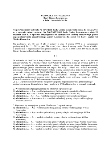 UCHWAŁA Nr 146/XII/2015 Rady Gminy Lesznowola z dnia 11 września 2015 r. w sprawie zmiany uchwały Nr 50/V/2015 Rady Gminy Lesznowola z dnia 17 lutego 2015 r. w sprawie zmiany uchwały Nr 346/XXIV/2009 Rady Gminy Lesznowola z dnia 29 stycznia 2009 r. w sprawie przystąpienia do sporządzenia zmiany miejscowego planu zagospodarowania przestrzennego gminy Lesznowola dla części wsi Łazy i części wsi Wólka Kosowska. Na podstawie art. 18 ust. 2 pkt 5 ustawy z dnia 8 marca 1990 r. o samorządzie gminnym (t.j. Dz. U. z 2013 r., poz. 594 ze zm.) i art. 14 ust. 1 ustawy z dnia 27 marca 2003 r. o planowaniu i zagospodarowaniu przestrzennym (t.j. Dz. U. z 2015 r. poz. 199 ze zm.) Rada Gminy Lesznowola uchwala co następuje: § 1. W uchwale Nr 50/V/2015 Rady Gminy Lesznowola z dnia 17 lutego 2015 r. w sprawie zmiany uchwały Nr 346/XXIV/2009 Rady Gminy Lesznowola z dnia 29 stycznia 2009 r. w sprawie przystąpienia do sporządzenia zmiany miejscowego planu zagospodarowania przestrzennego gminy Lesznowola dla części wsi Łazy i części wsi Wólka Kosowska, zmienionej uchwałą Nr 395/XXXI/2013 Rady Gminy Lesznowola z dnia 26 sierpnia 2013 r. w sprawie zmiany uchwały 346/XXIV/2009 Rady Gminy Lesznowola z dnia 29 stycznia 2009 r. w sprawie przystąpienia do sporządzenia zmiany miejscowego planu zagospodarowania przestrzennego gminy Lesznowola dla części wsi Łazy i części wsi Wólka Kosowska zmienia się § 2 który otrzymuje brzmienie: „§ 2.1. Dopuszcza się uchwalenie miejscowego planu zagospodarowania przestrzennego gminy Lesznowola dla części wsi Łazy i części wsi Wólka Kosowska w czterech częściach. 2. Wyznacza się następujące granice dla obszaru I ograniczonego: 1) odcinkiem A 23 – A 24 – wzdłuż południowej linii rozgraniczającej ulicy Nadrzecznej; 2) odcinkiem A 24 – A 16 – wzdłuż zachodniej granicy działki o nr ew. 97; 3) odcinkiem A 16 –A 17 –A 18, – wzdłuż południowej granicy rowu melioracyjnego; 4) odcinkiem A 18 – A 19 – A 20 – A 23 – wzdłuż zachodniej granicy obrębu ewidencyjnego Wólka Kosowska. 3.Wyznacza się następujące granice dla obszaru II ograniczonego: 1) odcinkiem A 23 – A 21 – wzdłuż zachodniej granicy obrębu ewidencyjnego Wólka Kosowska; 2) odcinkiem A 21 – A 22 – wzdłuż południowej granicy obrębu ewidencyjnego Wólka Kosowska; 3) odcinkiem A 22 – A 1 – wzdłuż zachodniej granicy obrębu ewidencyjnego Wólka Kosowska; 4) odcinkiem A 1 – A 2 – wzdłuż północnej granicy obrębu ewidencyjnego Wólka Kosowska; 5) odcinkiem A 2 – A 3 – wzdłuż zachodniej granicy obrębu ewidencyjnego Wólka Kosowska; 6) odcinkiem A 3 – A 4 – wzdłuż północnej granicy obrębu ewidencyjnego Wólka Kosowska; 7) odcinkiem A 4 – A 5 – wzdłuż zachodniej granicy obrębu ewidencyjnego Wólka Kosowska; 8) odcinkiem A 5 – A 6 – wzdłuż północnej granicy obrębu ewidencyjnego Wólka Kosowska; 9) odcinkiem A 6 – A 7 – wzdłuż wschodniej granicy działki o nr ew. 115 (ul. Wesoła); 10) odcinkiem A 7 – A 8 – wzdłuż południowej granicy działki o nr ew. 27/6 (południowy brzeg rowu melioracyjnego); 11) odcinkiem A 8 – A 9 – wzdłuż zachodniego brzegu rzeki Utraty; 12) odcinkiem A 9 – A 10 – A 11 – A 12 – wzdłuż północnej granicy obrębu ewidencyjnego Wólka Kosowska; 13) odcinkiem A 12 – A 13 – wzdłuż wschodniej granicy działki o nr ew. 46 (ul. Polna); 14) odcinkiem A 13 – A 14 – wzdłuż osi jezdni ul. Nadrzecznej; 15) odcinkiem A 14 – A 15 – wzdłuż zachodniej granicy działki o nr ew. 113/2; 16) odcinkiem A 15 – A 16 – wzdłuż osi rowu melioracyjnego; 17) odcinkiem A 16 – A 24 – wzdłuż zachodniej granicy działki o nr ew. 97; 18) odcinkiem A 24 – A 23 – wzdłuż południowej linii rozgraniczającej ulicy Nadrzecznej. 4.Wyznacza się następujące granice dla obszaru III ograniczonego: 1) odcinkiem B 1 – B 2 – wzdłuż północnej linii rozgraniczającej ulicy Podleśnej; 2) odcinkiem B 2 – B 3 – wzdłuż osi jezdni Alei Krakowskiej; 3) odcinkiem B 3 – B 4 – wzdłuż południowej granicy działki o nr ew. 503 oraz jej przedłużeniem do ul. Usługowej; 4) odcinkiem B 4 – B 1 – wzdłuż osi jezdni ulicy Usługowej. oraz 5) odcinkiem C 1 – C 2 – wzdłuż północnej granicy obrębu ewidencyjnego Łazy; 6) odcinkiem C 2 – C 3 – wzdłuż zachodniej granicy obrębu ewidencyjnego Łazy; 7) odcinkiem C 3 – C 4 – wzdłuż osi jezdni ul. Wąskiej; 8) odcinkiem C 4 – C 5 – wzdłuż osi jezdni Alei Krakowskiej; 9) odcinkiem C 5 – C 6 – wzdłuż osi jezdni ul. Wiejskiej; 10) odcinkiem C 6 – C 7 – wzdłuż wschodniej granicy działki o nr ew. 161; 11) odcinkiem C 7 – C 8 – wzdłuż południowego brzegu rowu melioracyjnego; 12) odcinkiem C 8 – C 9 – wzdłuż osi jezdni Alei Krakowskiej; 13) odcinkiem C 9 – C 10 – wzdłuż przedłużenia południowej linii rozgraniczającej ul. Kwiatowej; 14) odcinkiem C 10 – C 11 – wzdłuż wschodniej linii rozgraniczającej Alei Krakowskiej; 15) odcinkiem C 11 – C 12 – C 13 – C 14 – wzdłuż północno-wschodniej granicy obrębu ewidencyjnego Łazy; 16) odcinkiem C 14 – C 15 – wzdłuż wschodniej granicy obrębu ewidencyjnego Łazy; 17) odcinkiem C 15 – C 16 – C 17 – C 18 – wzdłuż południowej granicy obrębu ewidencyjnego Łazy; 18) odcinkiem C 18 – C 19 – C 20 – C 21 – wzdłuż zachodniej granicy obrębu ewidencyjnego Łazy; 19) odcinkiem C 21 – C 22 – wzdłuż południowej granicy obrębu ewidencyjnego Łazy; 20) odcinkiem C 22 – C 23 – wzdłuż zachodniej granicy obrębu ewidencyjnego Łazy; 21) odcinkiem C 23 – C 24 – C 25 – wzdłuż południowej granicy obrębu ewidencyjnego Łazy; 22) odcinkiem C 25 – C 26 – C 27 – wzdłuż zachodniej granicy obrębu ewidencyjnego Łazy; 23) odcinkiem C 27 – C 28 – wzdłuż południowej granicy obrębu ewidencyjnego Łazy; 24) odcinkiem C 28 – C 1 – wzdłuż zach