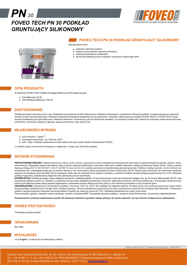 PN 30 FOVEO TECH PN 30 PODKŁAD GRUNTUJĄCY SILIKONOWY FOVEO TECH PN 30 PODKŁAD GRUNTUJĄCY SILIKONOWY Najważniejsze cechy: ujednolica chłonność podłoża zwiększa przyczepność wyprawy tynkarskiej redukuje powstawanie przebarwień wyrównuje przebieg procesu wiązania i wysychania nałożonego tynku OPIS PRODUKTU W systemach FOVEO TECH Podkład Gruntujący Silikonowy PN 30 stosuje się pod: Tynk Silikonowy TN 30 Tynk Silikatowo-Silikonowy TSS 25 ZASTOSOWANIE Podkład gruntujący stosowany jest w celu zwiększenia przyczepności tynków silikonowych i silikatowosilikonowych, zmniejszenia chłonności podłoża. Umożliwia poprawne wykonanie struktury tynków cienkowarstwowych. Redukuje możliwość powstawania przebarwień na ich powierzchni. Wchodzi w skład systemów ociepleń FOVEO TECH S i FOVEO TECH W jako warstwa podkładowa pod tynki silikonowe i silikatowosilikonowe. Przeznaczony jest do stosowania wewnątrz i na zewnątrz pomieszczeń. Można nim pokrywać powierzchnie betonowe, cementowe, cementowowapienne, gipsowe, gipsowokartonowe, płyty wiórowe itp. WŁAŚCIWOŚCI WYROBU czas schnięcia 3 godz.(*) temperatura stosowania - od +10oC do +25oC kolor biały; możliwość wybarwienia na kolor zbliżony do koloru tynku (System Koloraowania FOVEO) (*) wielkość zależy od warunków temperatury i wilgotności; rodzaju oraz chłonności podłoża SPOSÓB STOSOWANIA PRZYGOTOWANIE PODŁOŻA: Podłoże powinno być równe, suche, mocne, oczyszczone z kurzu, pozbawione zanieczyszczeń oraz wolne od agresji biologicznej (grzyby, pleśnie, mchy), chemicznej itp. Wszelkiego rodzaju zabrudzenia należy oczyścić wodą pod zwiększonym ciśnieniem. Stare tynki i powłoki malarskie o słabej przyczepności należy usunąć. Ubytki uzupełnić Zaprawą Klejącą KS 10, KS 20, KU 11, KU 21 lub KW 12 (max do 6,0 mm w jednej warstwie) lub standardową zaprawą tynkarską. Podłoża o słabej nośności, mocno chłonne lub skredowane (tzn. zostawiające ślady pyłu po potarciu dłonią) w celu wzmocnienia należy pomalować Gruntem Silikonowym GN 30. Świeże tynki cementowe lub cementowowapienne malować nie wcześniej niż po 28 dniach od ich wykonania, beton zaś nie wcześniej niż po upływie 3 miesięcy, w systemie ociepleń warstwę zbrojoną wysezonować min. 3 dni. Wszystkie podłoża muszą mieć ustabilizowaną wilgotność oraz zakończony proces twardnienia. SPOSÓB UŻYCIA: Podkład gruntujący należy dokładnie wymieszać i nakładać pędzlem. W razie konieczności można go rozcieńczyć dodając max. do 5% Gruntu Silikonowego GN 30. Czas wysychania podkładu wynosi ok. 3 godziny, w zależności od warunków nakładania (temperatury otoczenia, wilgotności powietrza, chłonności podłoża itp.). W przypadku stosowania pod ciemne tynki silikonowe farbę należy zabarwić pigmentami z mieszalnika na kolor zbliżony do koloru tynku w celu uniknięcia prześwitów w razie przetarcia tynku. UWAGI/ZALECENIA: Stosować przy temperaturze podłoża i otoczenia +10ºC do +25ºC. Nie nakładać na nagrzane podłoże. W trakcie pracy oraz podczas wysychania należy unikać bezpośredniego nasłonecznienia, silnego wiatru, działania deszczu. Chronić wymalowaną powierzchnię do czasu wyschnięcia za pomocą folii lub gęstej siatki osłonowej. Temperatura podłoża i otoczenia podczas malowania oraz przez kolejne 24 godzin nie może być niższa od +10ºC. Narzędzia bezpośrednio po użyciu umyć wodą. Prace prowadzić zgodnie z zasadami sztuki budowlanej, normami i przepisami BHP. W przypadku łączenia podkładu z wyrobami innych Producentów, nie ponosimy odpowiedzialności. Pomieszczenia w którym zastosowano wyrób lub elementy malowane wyrobem należy wietrzyć do zaniku zapachu i po tym okresie nadają się do użytkowania. OKRES PRZYDATNOŚCI 18 miesięcy od daty produkcji OPAKOWANIA 8kg, 16kg WYDAJNOŚĆ ok. 0,3 kg/m², w zależności od właściwości podłoża Karta techniczna 1/2 Ostatnia aktualizacja: 2016-08-12 Fabryka Farb i Lakierów Śnieżka SA, 39102 Lubzina 34A, Administracja: 39207 Brzeźnica, ul. Dębicka 44 Tel. + 48 14 681 11 11, fax +48 14 682 22 22, KRS 0000060537 XII Wydział Gospodarczy KRS w Rzeszowie NIP: 8181433438, Kapitał zakładowy w pełni opłacony: 12 617 778 zł, www.foveotech.pl KOLORYSTYKA Kolor biały; możliwość wybarwienia na kolor zbliżony do koloru tynku (System Koloraowania FOVEO) LZO Limit zawartości LZO dla tego produktu: kat.(A/c/FW) max 40g/l (2010). Produkt zawiera max 40g/l. NORMY, BADANIA I ATESTY Produkt wchodzi w skład Zestawu wyrobów do wykonywania ociepleń systemem FOVEO TECH W objętego Aprobatą Techniczną ITB AT158291/2011 + ANEKS nr 1+ ANEKS nr 2 Deklaracja zgodności nr 02/FTW/2010, wydanie 5 z 01.03.2015r Jednostka certyfikująca: Zakład Certyfikacji Instytutu Techniki Budowlanej w Warszawie Deklaracja zgodności i Deklaracja właściwości użytkowych dostępna na stronie internetowej: www.foveotech.pl Producent: Fabryka Farb i Lakierów ŚNIEŻKA S.A., 39102 Lubzina 34 a Zakład produkcyjny: Fabryka Farb i Lakierów ŚNIEŻKA S.A., Oddział: 39205 Pustków 604 Produkt wchodzi w skład: Zestawu wyrobów do wykonywania ociepleń ścian zewnętrznych budynków systemem FOVEO TECH S objętego Aprobatą Techniczną ITB AT15 8290/2011 + ANEKS nr 1 oraz Zestawu wyrobów do wykonywania ociepleń systemem FOVEO TECH W objętego Aprobatą Techniczną ITB AT158291/2011 Deklaracja zgodności nr 01/FTS/2010, wydanie 4 z 07.03.2013r Deklaracja zgodności nr 02/FTW/2010, wydanie 4 z 07.03.2013r Jednostka certyfikująca: Zakład Certyfikacji Instytutu Techniki Budowlanej w Warszawie WSKAZÓWKI BHP I PPOŻ BEZPIECZEŃSTWO: Zawiera mieszaninę 5chloro2metylo2Hizotiazol3onu [WE 2475007] i 2metylo2Hizotiazol3onu [WE 2202396] (3:1). Może powodować reakcję alergiczną skóry. W razie konieczności zasięgnięcia porady lekarza należy pokazać pojemnik lub etykietę. Chronić przed dziećmi. Przed użyciem przeczytać etyk