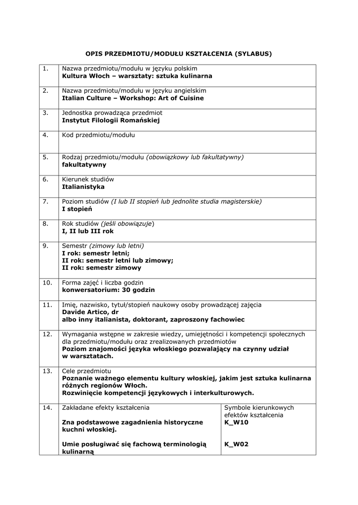 OPIS PRZEDMIOTU/MODUŁU KSZTAŁCENIA (SYLABUS) 1. Nazwa przedmiotu/modułu w języku polskim Kultura Włoch – warsztaty: sztuka kulinarna 2. Nazwa przedmiotu/modułu w języku angielskim Italian Culture – Workshop: Art of Cuisine 3. Jednostka prowadząca przedmiot Instytut Filologii Romańskiej 4. Kod przedmiotu/modułu 5. Rodzaj przedmiotu/modułu (obowiązkowy lub fakultatywny) fakultatywny 6. Kierunek studiów Italianistyka 7. Poziom studiów (I lub II stopień lub jednolite studia magisterskie) I stopień 8. Rok studiów (jeśli obowiązuje) I, II lub III rok 9. Semestr (zimowy lub letni) I rok: semestr letni; II rok: semestr letni lub zimowy; II rok: semestr zimowy 10. Forma zajęć i liczba godzin konwersatorium: 30 godzin 11. Imię, nazwisko, tytuł/stopień naukowy osoby prowadzącej zajęcia Davide Artico, dr albo inny italianista, doktorant, zaproszony fachowiec 12. Wymagania wstępne w zakresie wiedzy, umiejętności i kompetencji społecznych dla przedmiotu/modułu oraz zrealizowanych przedmiotów Poziom znajomości języka włoskiego pozwalający na czynny udział w warsztatach. 13. Cele przedmiotu Poznanie ważnego elementu kultury włoskiej, jakim jest sztuka kulinarna różnych regionów Włoch. Rozwinięcie kompetencji językowych i interkulturowych. 14. Zakładane efekty kształcenia Zna podstawowe zagadnienia historyczne kuchni włoskiej. Umie posługiwać się fachową terminologią kulinarną Symbole kierunkowych efektów kształcenia K_W10 K_W02 Potrafi czytać i komentować wybrane źródła historyczne i historycznoliterackie na temat kuchni włoskiej K_U01 Potrafi pracować w zespole, przyjmując w nim różne role, dzieli się posiadaną wiedzą i umiejętnościami K_K02 Ma świadomość różnic kulturowych i związanych z tym wyzwań, potrafi w praktyce stosować wiedzę o mechanizmach komunikacji interkulturowej K_K06 15. Treści programowe 1. Bankiet renesansowy, jego symbolika i znaczenia. 2. Pellegrino Artusi, La scienza in cucina e l’arte di mangiar bene (fragmenty). 3. Podstawowa terminologia kulinarna. 4. Poznawanie włoskich realiów kulinarnych z wykorzystaniem zasobów internetowych. 5. Analiza odniesień kulturowych związanych z kuchnią różnych regionów Włoch w wybranych tekstach literackich i paraliterackich oraz filmach. 6. Refleksja nad dostępnością włoskich produktów kulinarnych we Wrocławiu. 7. Zajęcia praktyczne w wybranym lokalu gastronomicznym, z udziałem i pod kierunkiem specjalistów. 16. Zalecana literatura (podręczniki) Artusi P., La scienza in cucina, red. Alberto Capatti, Mediolan 2010. Benporat C., Feste e banchetti. Convivialità italiana fra Tre e Quattrocento, Florencja 2001. Buon appetito! Tra lingua italiana e cucina regionale. Livello intermedio, Bonacci, Perugia 2004. 17. Forma zaliczenia poszczególnych komponentów przedmiotu/modułu, sposób sprawdzenia osiągnięcia zamierzonych efektów kształcenia: zaliczenie na ocenę na podstawie: - uczestnictwa w zajęciach odbywających się w wybranym lokalu gastronomicznym, z udziałem i pod kierunkiem specjalistów; - zrealizowanych projektów (np. w formie prezentacji PowerPoint); - obserwacji zachowań; - przygotowania do zajęć. 18. Język wykładowy włoski 19. Obciążenie pracą studenta Forma aktywności studenta Godziny zajęć teoretycznych i ćwiczeń praktycznych z nauczycielem: Średnia liczba godzin na zrealizowanie aktywności 30 Praca własna studenta. m.in.: - lektura zalecanych tekstów; - przygotowanie do zajęć. 30 Suma godzin 60 Liczba punktów ECTS *objaśnienie symboli: K (przed podkreśleniem) - kierunkowe efekty kształcenia W - kategoria wiedzy U - kategoria umiejętności K (po podkreśleniu) - kategoria kompetencji społecznych 01, 02, 03 i kolejne - numer efektu kształcenia 2
