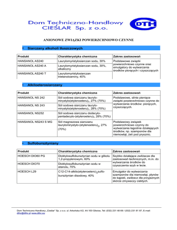 ANIONOWE ZWIĄZKI POWIERZCHNIOWO CZYNNE • Siarczany alkoholi tłuszczowych Produkt Charakterystyka chemiczna Zakres zastosowań HANSANOL AS240 Laurylomyristylosiarczan sodu, 30% HANSANOL AS240 A Laurylomyristylosiarczan sodu, 30%, alkaliczny HANSANOL AS240 T Laurylomyristylosiarczan trietanoloaminy, 40% Podstawowe związki powierzchniowo czynne oraz emulgatory do wytwarzania środków piorących i czyszczących • Alkiloeterosiarczany Produkt Charakterystyka chemiczna Zakres zastosowań HANSANOL NS 242 Sól sodowa siarczanu laurylomirystylo(etylenoeteru)2, 27% (70%) HANSANOL NS 243 Sól sodowa siarczanu laurylomirystylo(etylenoeteru)3, 28% (70%) Podstawowe, silnie pieniące związki powierzchniowo czynne do wytwarzania środków: piorących, czyszczących. HANSANOL NS252 Sól sodowa siarczanu dodecylopentadecylo-(etylenoeteru)2, 26% (70%) HANSANOL NS243 S MG Sól magnezowa siarczanu laurylomirystylo-(etylenoeteru)3, 27% (70%) • Podstawowy związek powierzchniowo czynny do wytwarzania łagodnie działających środków, np. szamponów dla niemowląt, żeli pod prysznic. Sulfobursztyniany Produkt Charakterystyka chemiczna HOESCH DIO60 PG Dioktylosulfobursztynian sodu w glikolu Szybko działające zwilżacze dla 1,2-propylenowym, 60% zastosowań technicznych, m.in. do wytwarzania środków do Dioktylosulfobursztynian sodu w czyszczenia szyb w lecie. etanolu, 70% HOESCH DIO70 HOESCH L29 C12-C14-alkilo(etylenoetero)3sulfobursztynian disodowy, 40% Zakres zastosowań Emulgator do wytwarzania szamponów dla niemowląt, płynów do kąpieli, zwilżacz dla przyjaznych skórze zmywaczy ciekłych. Dom Techniczno-Handlowy „Cieślar” Sp. z o.o. ul. Arkońska 4/2, 44-100 Gliwice, Tel: (032) 231 48 69 / (032) 231 81 87, E-mail: [email protected] www.dthc.eu • Benzenosulfoniany alkilowe Produkt Charakterystyka chemiczna Zakres zastosowań HOESCH AE15 Sól sodowa sulfonianu dodecylobenzenu, 15% HOESCH AE30 Sól sodowa sulfonianu dodecylobenzenu 30% HOESCH AE50 Sól sodowa sulfonianu dodecylobenzenu, 50% Uniwersalne związki powierzchniowo czynne do wytwarzania ciekłych i pastowatych środków czyszczących. HOESCH AT50 Sól trietanoloaminowa dodecylobenzenu, 50% Wytwarzanie delikatnych środków piorących, płynów do zmywania naczyń, szamponów. HOESCH ABS typ H Kwas liniowy-alkilobenzenosulfonowy z wysoką zawartością izomerów, 2 - fenylowy HOESCH ABS typ L Kwas liniowy alkilobenzenosulfonowy z niską zawartością izomerów 2 - fenolowych, 96% Surowce do wytwarzania środków piorących i środków czyszczących WALLISAP AS98 Kwas n-C10-C13alkilobenzeno-sulfonowy WALLISAP AE50 Sól sodowa kwasu n-C10-C13-alkilobenzenosulfonowego WALLISAP AT50 Sól trietanoloaminowa kwasu n-C10- C13 alkilobenzeno-sulfonowego WALLASOL L29 Sól sodowa sulfobursztynianu C12-C16 alkoholopoliglikoloeteru Surfaktanty do wytwarzania szamponów dla dzieci, płynów do kąpieli, łagodnych dla skóry oczyszczaczy ciekłych. WALLASOL DIO60 PG Sól sodowa diizooktylosulfo-bursztynianu, zawiera glikol 1,2-propylenowy WALLASOL DIO70 Sól sodowa diizooktylosulfo-bursztynianu, zawiera etanol Szybki zwilżacz dla środków pomocniczych do: skóry, papieru, tkanin. WALLIPHOS LMP30 Ester fosforowy poliglikoloeteru nonylofenolu Niskopienne zwilżacze dla obojętnych i słabo alkalicznych środków czyszczących. WALLIPHOS NOP90 Ester fosforowy poliglikoloeteru alkoholu C12 - C16 Koemulgator dla reakcji polimeryzacji. WALLIPHOS TRP40 Ester fosforowy poliglikoloeteru alkoholu i-C13 Surfaktanty uniwersalne do wytwarzania proszkowych i ciekłych środków: piorących, czyszczących, pomocniczych dla tkanin Dom Techniczno-Handlowy „Cieślar” Sp. z o.o. ul. Arkońska 4/2, 44-100 Gliwice, Tel: (032) 231 48 69 / (032) 231 81 87, E-mail: [email protected] www.dthc.eu • Sulfoniany olefinowe, parafinowe Produkt Charakterystyka chemiczna HANSANYL OS Sól sodowa sulfonianu olefiny C14-C16, 37% Podstawowe, silnie pieniące związki powierzchniowo czynne do Sól sodowa sulfonianu olefiny C14-C16, 37% wytwarzania środków: piorących, alkaliczna, bez środków konserwujących czyszczących. Sól sodowa sulfonianu olefiny C14-C16, proszek HANSANYL OS A HANSANYL OS P HOESCH NAS 30 Sól sodowa sulfonowanej parafiny, 30% HOESCH NAS 60 Sól sodowa sulfonowanej parafiny, 60% • Zakres zastosowań Podstawowy, pieniący surfaktant do wytwarzania ciekłych, stężonych, przyjaznych skórze środków czyszczących. Estry kwasu fosforowego Produkt Charakterystyka chemiczna Zakres zastosowań HOESCH TRP40 Fosforan izo-C13-alkoholopoliglikoloetylenoeteru, 40% Niskopienny zwilżacz hydrotropowy do wytwarzania przemysłowych środków czyszczących. HOESCH BP80 Na Mieszanina fosforanu laurylomyristylopolikoglikoloetyleno-eteru i fosforanuizooktylowego – sól Na Emulgator do olejów do wiercenia i cięcia oraz przy odtłuszczaniu metali. Dom Techniczno-Handlowy „Cieślar” Sp. z o.o. ul. Arkońska 4/2, 44-100 Gliwice, Tel: (032) 231 48 69 / (032) 231 81 87, E-mail: [email protected] www.dthc.eu