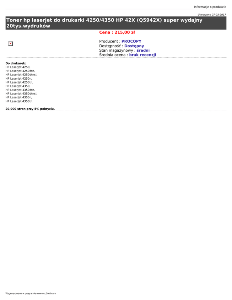 Informacje o produkcie Utworzono 07-03-2017 Toner hp laserjet do drukarki 4250/4350 HP 42X (Q5942X) super wydajny 20tys.wydruków Cena : 215,00 zł Producent : PROCOPY Dostępność : Dostępny Stan magazynowy : średni Średnia ocena : brak recenzji Do drukarek: HP LaserJet 4250, HP LaserJet 4250dtn, HP LaserJet 4250dtnsl, HP LaserJet 4250n, HP LaserJet 4250tn, HP LaserJet 4350, HP LaserJet 4350dtn, HP LaserJet 4350dtnsl, HP LaserJet 4350n, HP LaserJet 4350tn. 20.000 stron przy 5% pokryciu. Wygenerowano w programie www.oscGold.com