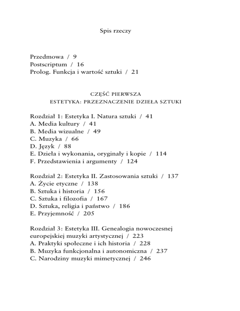 Spis rzeczy Przedmowa / 9 Postscriptum / 16 Prolog. Funkcja i wartość sztuki / 21 CZĘŚĆ PIERWSZA ESTETYKA: PRZEZNACZENIE DZIEŁA SZTUKI Rozdział 1: Estetyka I. Natura sztuki / 41 A. Media kultury / 41 B. Media wizualne / 49 C. Muzyka / 66 D. Język / 88 E. Dzieła i wykonania, oryginały i kopie / 114 F. Przedstawienia i argumenty / 124 Rozdział 2: Estetyka II. Zastosowania sztuki / 137 A. Życie etyczne / 138 B. Sztuka i historia / 156 C. Sztuka i filozofia / 167 D. Sztuka, religia i państwo / 186 E. Przyjemność / 205 Rozdział 3: Estetyka III. Genealogia nowoczesnej europejskiej muzyki artystycznej / 223 A. Praktyki społeczne i ich historia / 228 B. Muzyka funkcjonalna i autonomiczna / 237 C. Narodziny muzyki mimetycznej / 246 D. Narodziny muzyki abstrakcyjnej / 272 E. Zimna wojna mimesis i abstrakcji / 282 F. Znaczenie abstrakcji / 309 CZĘŚĆ DRUGA POETYKA I HERMENEUTYKA: TREŚĆ I INTERPRETACJA DZIEŁA SZTUKI Rozdział 4: Poetyka I. Diegesis i mimesis. Sposoby i materia przedstawienia artystycznego / 329 A. Głosy / 331 B. Sposoby przedstawiania w malarstwie i muzyce / 340 C. Autor implikowany i rzeczywisty, martwy i żywy / 368 Rozdział 5: Poetyka II. Narracja i liryka. Formy literackie i przedmiot przedstawienia artystycznego / 377 A. Narracja i liryka / 379 B. Formy w malarstwie i muzyce / 391 C. Działanie i uczucie / 403 Rozdział 6: Hermeneutyka. Interpretacja i jej zasadność / 423 A. Interpretacja: metafora i metonimia / 423 B. Zasadność: perswazja i prawomocność / 450 Epilog. Potęga smaku / 463 Przypisy / 479 Indeks nazwisk / 515 Nota o ilustracjach / 524