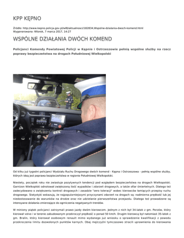 KPP KĘPNO Źródło: http://www.kepno.policja.gov.pl/wl8/aktualnosci/182834,Wspolne-dzialania-dwoch-komend.html Wygenerowano: Wtorek, 7 marca 2017, 14:27 WSPÓLNE DZIAŁANIA DWÓCH KOMEND Policjanci Komendy Powiatowej Policji w Kępnie i Ostrzeszowie pełnią wspólne służby na rzecz poprawy bezpieczeństwa na drogach Południowej Wielkopolski Od kilku już tygodni policjanci Wydziału Ruchu Drogowego dwóch komend - Kępna i Ostrzeszowa - pełnią wspólne służby, których ideą jest poprawa bezpieczeństwa w regionie Południowej Wielkopolski. Niestety, początek roku nie zwiastuje pozytywnych tendencji pod względem bezpieczeństwa na drogach Wielkopolski. Garnizon Wielkoplski odnotował zwiększoną ilość wypadków i zdarzeń drogowych, a także ofiar śmiertelnych. Dlatego też zadecydowano o zwiększeniu kontroli drogowych i zasadzie "zero toleracji" wobec kierowców łamiących przepisy ruchu drogowego. Statystyki wskazują, że najpopularniejszymi przyczynami zdarzeń na drogach są: nadmierna prędkość lub jej niedostosowanie do warunków na drodze oraz nie udzielanie pierwszeństwa przejazdu. Dlatego też prowadzone są intensywne działania zmierzające do ogrniczenia negatywnych trendów. W miniony piątek policjanci zatrzymali prawo jazdy dwóm kierowcom. Jednym z nich był 34-latek z gm. Perzów, który kierował volvo i w terenie zabudowanym przekroczył prędkość o ponad 50 km/h. Drugim kierowcą był natomiast 35-latek z gm. Bralin, który kierował osobowym renault mimo wydanego już wniosku o sprawdzenie kwalifikacji z powodu przekroczenia limitu dozwolonych punktów karnych. Obaj mężczyźni tymczasowo stracili uprawnienia do kierowania pojazdami. Ponadto tego dnia policjanci Wydziału Ruchu Drogowego zatrzymali obywatela Ukrainy, który czasowo zamieszkuje w Wieruszowie, 32-latka kierującego samochodem osobowym w stanie po użyciu alkoholu. Badanie wykazało około 0,26 promila alkoholu. Nie są to ostatnie wspólne działania prowadzone na terenie obu powiatów. Ponadto funkcjonariusze będą szczególnie intensywnie kontrolować kierowców pod względem korzystania przez nich z telefonów komórkowych podczas prowadzenia samochodu. Korzystanie z telefonu za kierownicą jest przyczyą wielu zdarzeń drogowych, w tym również wypadków prowadzących do śmierci. Ocena: 0/5 (0) Tweetnij