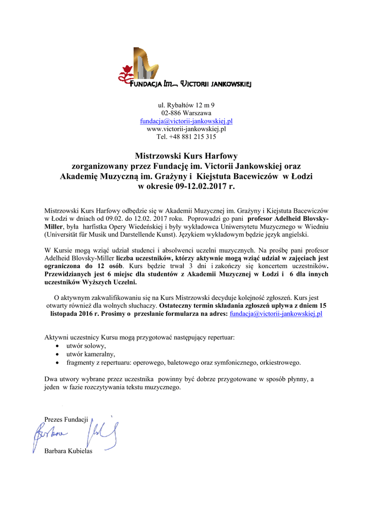 ul. Rybałtów 12 m 9 02-886 Warszawa [email protected] www.victorii-jankowskiej.pl Tel. +48 881 215 315 Mistrzowski Kurs Harfowy zorganizowany przez Fundację im. Victorii Jankowskiej oraz Akademię Muzyczną im. Grażyny i Kiejstuta Bacewiczów w Łodzi w okresie 09-12.02.2017 r. Mistrzowski Kurs Harfowy odbędzie się w Akademii Muzycznej im. Grażyny i Kiejstuta Bacewiczów w Łodzi w dniach od 09.02. do 12.02. 2017 roku. Poprowadzi go pani profesor Adelheid BlovskyMiller, była harfistka Opery Wiedeńskiej i były wykładowca Uniwersytetu Muzycznego w Wiedniu (Universität fűr Musik und Darstellende Kunst). Językiem wykładowym będzie język angielski. W Kursie mogą wziąć udział studenci i absolwenci uczelni muzycznych. Na prośbę pani profesor Adelheid Blovsky-Miller liczba uczestników, którzy aktywnie mogą wziąć udział w zajęciach jest ograniczona do 12 osób. Kurs będzie trwał 3 dni i zakończy się koncertem uczestników. Przewidzianych jest 6 miejsc dla studentów z Akademii Muzycznej w Łodzi i 6 dla innych uczestników Wyższych Uczelni. O aktywnym zakwalifikowaniu się na Kurs Mistrzowski decyduje kolejność zgłoszeń. Kurs jest otwarty również dla wolnych słuchaczy. Ostateczny termin składania zgłoszeń upływa z dniem 15 listopada 2016 r. Prosimy o przesłanie formularza na adres: [email protected] Aktywni uczestnicy Kursu mogą przygotować następujący repertuar: utwór solowy, utwór kameralny, fragmenty z repertuaru: operowego, baletowego oraz symfonicznego, orkiestrowego. Dwa utwory wybrane przez uczestnika powinny być dobrze przygotowane w sposób płynny, a jeden w fazie rozczytywania tekstu muzycznego. Prezes Fundacji Barbara Kubielas