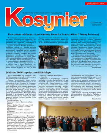 październik 2014 Uroczystość odsłonięcia i poświęcenia Pomnika Pamięci Ofiar II Wojny Światowej W niedzielę 5 października w Trzemesznie odbyły się uroczystości osłonięcia i poświęcenia Pomnika Pamięci Ofiar II Wojny Światowej na Cmentarzu Parafialnym w Trzemesznie po dokonanej renowacji. O godz. 11:00 na skwerze Hipolita Cegielskiego odbyła się zbiórka pocztów sztandarowych, delegacji oraz uczestników uroczystości. Następnie wszyscy przemaszerowali do bazyliki trzemeszeńskiej, składając wiązanki kwiatów pod tablicą Kazimierza Jarosława Szymańskiego Burmistrza Trzemeszna w latach 19361939 oraz pod tablicą Andrzeja Marchlewicza - dowódcy obrony Trzemeszna w 1939 r., rozstrzelanego w Kociniu 05.10.2014 r. O godz. 11:30 rozpoczęła się msza św. w intencji Ofiar II Wojny Światowej z terenu Miasta i Gminy Trzemeszno, podczas której homilię wygłosił ks. prof. dr hab. Bogdan Czyżewski. Nabożeństwo uświetnił Chór Kantata oraz orkiestra dęta z Mogilna. Następnie wszyscy uczestnicy udali się na Cmentarz Parafialny, gdzie nastąpiło uroczyste odsłonięcie i poświęcenie odnowionego Pomnika - Mogiły Zbiorowej Ofiar II Wojny Światowej. Odsłonięcia dokonali Pani Maria Wojciechowska, Zastępca Burmistrza Trzemeszna Dariusz Jankowski oraz Przewodniczący Rady Miejskiej Trzemeszna Wiesław Pokorski. Renowacja pomnika możliwa była dzięki otrzymanej dotacji od Wojewody Wielkopolskiego oraz z Rady Ochrony Pamięci Walk i Męczeństwa w Warszawie. W dalszej części uroczystości Pan Jarosław Majewski odczytał apel poległych. Na zakończenie wiązanki kwiatów złożyły przybyłe delegacje: przedstawiciele Wojewody Wielkopolskiego, Starosta Mogileński, władze samorządowe Trzemeszna, przedstawiciele jednostek organizacyjnych oraz organizacji pozarządowych. Edyta Kubiak Jubileusz 50-lecia pożycia małżeńskiego Aż 15 małżeńskich par z miasta i gminy Trzemeszno otrzymało wyróżnienia za długoletnie pożycie małżeńskie Podczas uroczystości, która odbyła się w dniu 10 października 2014 r. w sali Ochotniczej Straży Pożarnej w Trzemesznie, Zastępca Burmistrza Trzemeszna Dariusz Jankowski oraz zastępca kierownika Urzędu Stanu Cywilnego Elżbieta Peno wręczyli parom medale z okazji 50-Lecia (i więcej) Pożycia Małżeńskiego przyznane przez Prezydenta Rzeczypospolitej Polskiej. W uroczystości wziął też udział Przewodniczący Rady Miejskiej w Trzemesznie Wiesław Pokorski oraz ks. Prałat Piotr Kotowski. Odznaczone pary to: Kazimierz i Janina Borowscy z Trzemeszna Julian i Barbara Chmielewscy z Miat Włodzimierz i Jadwiga Dokładni z Kruchowa Mieczysław i Czesława Jaskulscy z Mijanowa Franciszek i Stanisława Kuchta z Trzemeszna Stefan i Jadwiga Łanieccy z Trzemeszna Jerzy i Czesława Nalewaj z Kruchowa Zygmunt i Krystyna Peno z Trzemeszna Jan i Krystyna Różalscy z Kamieńca Wincenty i Józefa Skulscy z Trzemżala Henryk i Janina Szajda z Trzemeszna Tadeusz i Teresa Szymczak z Gołąbek Jan i Halina Śramscy z Trzemeszna Zbigniew i Stanisława Wawrzeccy z Trzemeszna Szczepan i Jadwiga Wełnogórscy z Niewolna Złote Gody to niecodzienna i wspaniała chwila nie tylko dla Jubilatów, Ich najbliższych i przyjaciół, ale też dla władz państwowych i samorządowych – rodzina to przecież fundament społeczności. Wyrazem ogromnego szacunku i uznania wielkiej wartości tego wspaniałego Jubileuszu jest przyznawanie przez Prezydenta Rzeczypospolitej Polskiej parom małżeńskim Medali Za Długoletnie Pożycie Małżeńskie. W trakcie uroczystości wyrażono wiele słów uznania dla trudu, jaki trzeba ponieść, aby trwale przejść przez wspólne życie, utrzymać rodzinę, zmierzać się z codziennością, nie zawsze łatwą i nie zawsze przynoszącą satysfakcję, a przy tym niezmiennie obdarzać miłością, troską, opieką, dawać poczucie bezpieczeństwa i ostoi. To wielka radość móc gościć tak znamienitych Jubilatów, widzieć Ich uśmiechniętymi, w otoczeniu rodzin i mieć okazję do uściśnięcia ręki, wyrażenia uznania i szacunku i złożenia szczerych gratulacji i najlepszych życzeń jeszcze wielu, wielu wspólnych lat. Dla zacnych Jubilatów wystąpiły dzieci z Przedszkola nr 1 im. Chatka Puchatka w Trzemesznie w przedstawieniu „Kopciuszek”. Edyta Kubiak OBWIESZCZENIE BURMISTRZA TRZEMESZNA o numerach i granicach obwodów głosowania z dnia 15 października 2014 r. Na podstawie art. 16 § 1 i 2 oraz art. 61a § 1 ustawy z dnia 5 stycznia 2011 roku – Kodeks wyborczy (Dz. U. Nr 21, poz. 112 ze zm.), w zw. art. 7 ust. 2 pkt. 1 i 2 ustawy z dnia 11 lipca 2014 r. o zm. ustawy o zmianie ustawy – Kodeks wyborczy oraz niektórych innych ustaw (Dz. U. z 2014 poz. 1072) podaje się do publicznej wiadomości informację o numerach i granicach obwodów głosowania, siedzibach obwodowych komisji wyborczych oraz lokalach komisji wyborczych dostosowanych do potrzeb wyborców niepełnosprawnych wraz z informacją o możliwości głosowania korespondencyjnego przez wyborców niepełnosprawnych w wyborach do rad gmin, rad powiatów, sejmików województw, rad dzielnic m.st. Warszawy oraz wyborów wójtów, burmistrzów i prezydentów miast zarządzonych na dzień 16 listopada 2014 r. Nr obwodu głosowania Granice Obwodu Siedziba obwodowej komisji wyborczej 1 Trzemeszno: Bolesława Chrobrego, 22 Stycznia, Al. Jarosława Kazimierza Szymańskiego, Aleja Odzyskania Niepodległości, Dworcowa, Foluska, Jesionowa, mjr Władysława Wleklińskiego, Plac Powstańców, Przemysłowa, Składowa, Tadeusza Kościuszki, Przedszkole Nr 2 im. „Misia Uszatka” ul. B. Chrobrego 8 62-240 Trzemeszno tel. 61 666 91 65 (lokal przystosowany dla osób niepełnosprawnych) 2 Trzemeszno: Piastowska (numery nieparzyste) Mieszka I, Piastowska (numery parzyste) Ośrodek Sportu i Rekreacji ul. Piastowska 11 62-240 Trzemeszno tel. 667 747 215 (lokal przystosowany dla osób niepełnosprawnych) 3 Trzemeszno: Działkowa, Górna, Kalin
