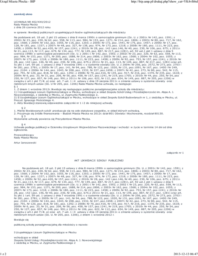 Urząd Miasta Płocka - BIP 1z2 http://bip.ump.pl/drukuj.php?show_cat=YK4vlbbd zamknij okno UCHWAŁA NR 402/XXV/2012 Rady Miasta Płocka z dnia 26 czerwca 2012 roku w sprawie: likwidacji publicznych uzupełniających liceów ogólnokształcących dla młodzieży Na podstawie art. 18 ust. 2 pkt 15 ustawy z dnia 8 marca 1990r. o samorządzie gminnym (Dz. U. z 2001r. Nr 142, poz. 1591; z 2002r. Nr 23, poz. 220, Nr 62, poz. 558, Nr 113, poz. 984, Nr 153, poz. 1271, Nr 214, poz. 1806; z 2003r. Nr 80, poz. 717, Nr 162, poz. 1568; z 2004r. Nr 102, poz. 1055, Nr 116, poz. 1203; z 2005r. Nr 172, poz. 1441, Nr 175, poz. 1457; z 2006r. Nr 17, poz. 128, Nr 181, poz. 1337; z 2007r. Nr 48, poz. 327, Nr 138, poz. 974, Nr 173, poz. 1218; z 2008r. Nr 180, poz. 1111, Nr 223, poz. 1458; z 2009r. Nr 52, poz.420, Nr 157, poz.1241; z 2010r. Nr 28, poz. 142 i poz.146, Nr 40, poz. 230, Nr 106, poz. 675; z 2011r. Nr 21, poz.113, Nr 117, poz. 679, Nr 134, poz. 777, Nr 149, poz. 887, Nr 217, poz.1281), art. 92 ust.1 pkt 1 ustawy z dnia 5 czerwca 1998r. o samorządzie powiatowym (Dz. U. z 2001 r. Nr 142, poz. 1592; z 2002r. Nr 23, poz. 220, Nr 62, poz. 558, Nr 113, poz. 984, Nr 153, poz. 1271, Nr 200, poz. 1688, Nr 214, poz.1806; z 2003r. Nr 162, poz. 1568; z 2004r. Nr 102, poz. 1055; z 2007r. Nr 173, poz. 1218; z 2008r. Nr 180, poz. 1111, Nr 223, poz. 1458; z 2009r. Nr 92, poz. 753, Nr 157, poz.1241; z 2010r. Nr 28, poz. 142 i poz. 146, Nr 40, poz. 230, Nr 106, poz. 675;z 2011r. Nr 21, poz. 113, Nr 149, poz. 887, Nr 217, poz. 1281) oraz art. 5c pkt 1 i art. 59 ust. 1 ustawy z dnia 7 września 1991 r. o systemie oświaty (Dz. U. z 2004r. Nr 256, poz. 2572, Nr 273, poz. 2703 i Nr 281, poz. 2781; z 2005r. Nr 17, poz. 141, Nr 94, poz. 788, Nr 122, poz. 1020, Nr 131, poz.1091, Nr 167, poz. 1400 i Nr 249, poz. 2104: z 2006r. Nr 144, poz. 1043, Nr 208, poz. 1532, Nr 227, poz.1658; z 2007r. Nr 42, poz. 273, Nr 80, poz. 542, Nr 115, poz. 791, Nr 120, poz. 818, Nr 181, poz. 1292; z 2008r. Nr 70, poz.416, Nr 145, poz. 917, Nr 216, poz. 1370, Nr 235, poz. 1618; z 2009r. Nr 6, poz. 33, Nr 31, poz. 206, Nr 56, poz. 458, Nr 157, poz.1241, Nr 219, poz.1705; z 2010r. Nr 44, poz. 250, Nr 54, poz 250, Nr 127, poz. 857, Nr 148, poz. 991;z 2011r. Nr 106, poz. 622, Nr 112, poz. 654, Nr 149, poz. 887, Nr 205, poz.1206) w związku z art.1 pkt 7) lit. a) oraz art. 7 ust. 1 i 4 ustawy z dnia 19 sierpnia 2011r. o zmianie ustawy o systemie oświaty oraz niektórych innych ustaw (Dz. U Nr 205, poz. 1206) Rada Miasta Płocka uchwala, co następuje: §1 1. Z dniem 1 września 2012r. likwiduje się następujące publiczne ponadgimnazjalne szkoły dla młodzieży: 1) I Uzupełniające Liceum Ogólnokształcące w Płocku, wchodzące w skład Zespołu Szkół Usług i Przedsiębiorczości im. Abpa A. J. Nowowiejskiego, z siedzibą w Płocku, ul. Zygmunta Padlewskiego 2, 2) II Uzupełniające Liceum Ogólnokształcące w Płocku, wchodzące w skład Zespołu Szkół Budowlanych nr 1, z siedzibą w Płocku, ul. Prezyd. Ignacego Mościckiego 4. 2. Akty likwidacji stanowią odpowiednio załączniki nr 1 i 2 do niniejszej uchwały. §2 1. Mienie likwidowanych szkół przekazuje się na cele statutowe zespołów, w skład których wchodzą. 2. Przyjmuje się źródło finansowania – Budżet Miasta Płocka na 2012r. dział 801 Oświata i Wychowanie, rozdział 80130. §3 Wykonanie uchwały powierza się Prezydentowi Miasta Płocka. §4 Uchwała podlega publikacji w Dzienniku Urzędowym Województwa Mazowieckiego i wchodzi w życie w terminie 14 dni od dnia ogłoszenia. Przewodniczący Rady Miasta Płocka Artur Jaroszewski załącznik nr 1 AKT LIKWIDACJI SZKOŁY PUBLICZNEJ Na podstawie art. 18 ust. 2 pkt 15 ustawy z dnia 8 marca 1990r. o samorządzie gminnym (Dz. U. z 2001r. Nr 142, poz. 1591; z 2002r. Nr 23, poz. 220, Nr 62, poz. 558, Nr 113, poz. 984, Nr 153, poz. 1271, Nr 214, poz. 1806; z 2003r. Nr 80, poz. 717, Nr 162, poz. 1568; z 2004r. Nr 102, poz. 1055, Nr 116, poz. 1203; z 2005r. Nr 172, poz. 1441, Nr 175, poz. 1457; z 2006r. Nr 17, poz. 128, Nr 181, poz. 1337; z 2007r. Nr 48, poz. 327, Nr 138, poz. 974, Nr 173, poz. 1218; z 2008r. Nr 180, poz. 1111, Nr 223, poz. 1458; z 2009r. Nr 52, poz.420, Nr 157, poz.1241; z 2010r. Nr 28, poz. 142 i poz.146, Nr 40, poz. 230, Nr 106, poz. 675; z 2011r. Nr 21, poz.113, Nr 117, poz. 679, Nr 134, poz. 777, Nr 149, poz. 887, Nr 217, poz.1281), art. 92 ust.1 pkt 1 ustawy z dnia 5 czerwca 1998r. o samorządzie powiatowym (Dz. U. z 2001 r. Nr 142, poz. 1592; z 2002 r. Nr 23, poz. 220, Nr 62, poz. 558, Nr 113, poz. 984, Nr 153, poz. 1271, Nr 200, poz. 1688, Nr 214, poz.1806; z 2003r. Nr 162, poz. 1568; z 2004r. Nr 102, poz. 1055; z 2007r. Nr 173, poz. 1218; z 2008r. Nr 180, poz. 1111, Nr 223, poz. 1458; z 2009r. Nr 92, poz. 753, Nr 157, poz.1241; z 2010r. Nr 28, poz. 142 i poz. 146, Nr 40, poz. 230, Nr 106, poz. 675;z 2011r. Nr 21, poz. 113, Nr 149, poz. 887, Nr 217, poz. 1281) oraz art. 5c pkt 1 i art. 59 ust. 1 ustawy z dnia 7 września 1991 r. o systemie oświaty (Dz. U. z 2004r. Nr 256, poz. 2572, Nr 273, poz. 2703 i Nr 281, poz. 2781; z 2005r. Nr 17, poz. 141, Nr 94, poz. 788, Nr 122, poz. 1020, Nr 131, poz.1091, Nr 167, poz. 1400 i Nr 249, poz. 2104: z 2006r. Nr 144, poz. 1043, Nr 208, poz. 1532, Nr 227, poz.1658; z 2007r. Nr 42, poz. 273, Nr 80, poz. 542, Nr 115, poz. 791, Nr 120, poz. 818, Nr 181, poz. 1292; z 2008r. Nr 70, poz.416, Nr 145, poz. 917, Nr 216, poz. 1370, Nr 235, poz. 1618; z 2009r. Nr 6, poz. 33, Nr 31, poz. 206, Nr 56, poz. 458, Nr 157, poz.1241, Nr 219, poz.1705; z 2010r. Nr 44, poz. 250, Nr 54, poz 250, Nr 127, poz. 857, Nr 148, poz. 991;z 2011r. Nr 106, poz. 622, Nr 112, poz. 654, Nr 149, poz. 887, Nr 205, poz.1206) w związku z art.1 pkt 7) lit. a) oraz art. 7 ust. 1 i 4 ustawy z dnia 19 sierpnia 2011r. o zmianie ustawy o systemie oświaty oraz niektórych innych ustaw (Dz. U. Nr 205, poz. 1206), z dniem 1 września 2012 r. likwiduje się publiczną szkołę ponadgimnazjalną dla młodzi