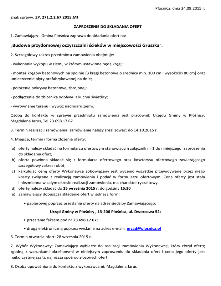 Płośnica, dnia 24.09.2015 r. Znak sprawy: ZP. 271.2.2.67.2015.MJ ZAPROSZENIE DO SKŁADANIA OFERT 1. Zamawiający: Gmina Płośnica zaprasza do składania ofert na: „Budowa przydomowej oczyszczalni ścieków w miejscowości Gruszka”. 2. Szczegółowy zakres przedmiotu zamówienia obejmuje: - wykonania wykopu w ziemi, w którym ustawione będą kręgi; - montaż kręgów betonowych na spoinie [3 kręgi betonowe o średnicy min. 100 cm i wysokości 80 cm] oraz umieszczenie płyty prefabrykowanej na dnie; - położenie pokrywy betonowej zbrojonej; - podłączenie do zbiornika odpływu z kuchni świetlicy; - wyrównanie terenu i wywóz nadmiaru ziemi. Osobą do kontaktu w sprawie przedmiotu zamówienia jest pracownik Urzędu Gminy w Płośnicy: Magdalena Jarus, Tel 23 698 17 67. 3. Termin realizacji zamówienia: zamówienie należy zrealizować: do 14.10.2015 r. 4. Miejsce, termin i forma złożenia oferty: a) oferty należy składać na formularzu ofertowym stanowiącym załącznik nr 1 do niniejszego zaproszenia do składania ofert; b) oferta powinna składać się z formularza ofertowego oraz kosztorysu ofertowego zawierającego szczegółowy zakres robót; c) kalkulując cenę oferty Wykonawca zobowiązany jest wycenić wszystkie przewidywane przez niego koszty związane z realizacją zamówienia i podać w formularzu ofertowym. Cena oferty jest stała i niezmienna w całym okresie realizacji zamówienia, ma charakter ryczałtowy. d) ofertę należy składać do 25 września 2015 r. do godziny 15:30 e) Zamawiający dopuszcza składanie ofert w jednej z form: • papierowej poprzez przesłanie oferty na adres siedziby Zamawiającego: Urząd Gminy w Płośnicy , 13-206 Płośnica, ul. Dworcowa 52; • przesłanie faksem pod nr 23 698 17 67; • drogą elektroniczną poprzez wysłanie na adres e-mail: [email protected] 6. Termin otwarcia ofert: 28 września 2015 r. 7. Wybór Wykonawcy: Zamawiający wybierze do realizacji zamówienia Wykonawcę, który złożył ofertę zgodną z warunkami określonymi w niniejszym zaproszeniu do składania ofert i cena jego oferty jest najkorzystniejsza tj. najniższa spośród złożonych ofert. 8. Osoba upoważniona do kontaktu z wykonawcami: Magdalena Jarus
