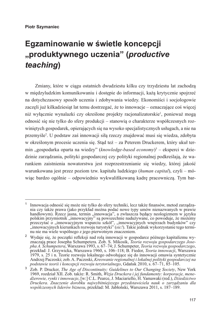 Piotr Szymaniec Egzaminowanie w świetle koncepcji „produktywnego uczenia” (productive teaching) Zmiany, które w ciągu ostatnich dwudziestu kilku czy trzydziestu lat zachodzą w międzyludzkim komunikowaniu i dostępie do informacji, każą krytycznie spojrzeć na dotychczasowy sposób uczenia i zdobywania wiedzy. Ekonomiści i socjologowie zaczęli już kilkadziesiąt lat temu dostrzegać, że to innowacje – oznaczające coś więcej niż wyłącznie wynalazki czy określone projekty racjonalizatorskie1, ponieważ mogą odnosić się nie tylko do sfery produkcji – stanowią o charakterze współczesnych rozwiniętych gospodarek, opierających się na wysoko specjalistycznych usługach, a nie na przemyśle2. U podstaw zaś innowacji siłą rzeczy znajdować musi się wiedza, zdobyta w określonym procesie uczenia się. Stąd też – za Peterem Druckerem, który ukuł termin „gospodarka oparta na wiedzy” (knowledge-based economy)3 – eksperci w dziedzinie zarządzania, polityki gospodarczej czy polityki regionalnej podkreślają, że warunkiem zaistnienia nowatorstwa jest rozprzestrzenianie się wiedzy, której jakość warunkowana jest przez poziom tzw. kapitału ludzkiego (human capital), czyli – mówiąc bardzo ogólnie – odpowiednio wykwalifikowaną kadrę pracowniczą. Tym bar- 1 2 3 Innowacja odnosić się może nie tylko do sfery techniki, lecz także finansów, metod zarządzania czy także prawa (jako przykład można podać nowe typy umów nienazwanych w prawie handlowym). Rzecz jasna, termin „innowacja”, a zwłaszcza będący neologizmem w języku polskim przymiotnik „innowacyjny” są powszechnie nadużywane, co powoduje, że możemy przeczytać o „innowacyjnym wsparciu szkół”, „innowacyjnych wnętrzach budynków” czy „innowacyjnych kierunkach rozwoju turystyki” (sic!). Takie jednak wykorzystanie tego terminu nie ma wiele wspólnego z jego pierwotnym znaczeniem. Wydaje się, że początki refleksji nad rolą innowacji w gospodarce późnego kapitalizmu wyznaczają prace Josepha Schumpetera. Zob. S. Mikosik, Teoria rozwoju gospodarczego Josepha A. Schumpetera, Warszawa 1993, s. 67–74; J. Schumpeter, Teoria rozwoju gospodarczego, przekład: J. Grzywicka, Warszawa 1960, s. 106–118; B. Fiedor, Teoria innowacji, Warszawa 1979, s. 25 i n. Teorie rozwoju lokalnego odwołujące się do innowacji omawia syntetycznie Andrzej Paczoski; zob. A. Paczoski, Kreowanie regionalnej i lokalnej polityki gospodarczej na podstawie teorii i koncepcji rozwoju terytorialnego, Gdańsk 2010, s. 67–71, 85–105. Zob. P. Drucker, The Age of Discontinuity; Guidelines to Our Changing Society, New York 1969, rozdział XII. Zob. także: R. Smith, Wizja Druckera i jej fundamenty: korporacje, menedżerowie, rynki i innowacje, [w:] C.L. Pearce, J. Maciariello, H. Yamawaki (red.), Dziedzictwo Druckera. Znaczenie dorobku najwybitniejszego przedstawiciela nauk o zarządzaniu dla współczesnych liderów biznesu, przekład: M. Jabłoński, Warszawa 2011, s. 187–189. 117 Piotr Szymaniec dziej zatem aktualne staje się pytanie, jak tę kadrę kształcić oraz jak sprawdzać poziom osiągniętych wiadomości. Wspomniany Peter Drucker uznawał, że w społeczeństwach post-kapitalistycznych, którymi stają się społeczeństwa najbardziej rozwiniętych gospodarczo krajów świata, uczenie się i system edukacyjny musi obejmować nie tylko tradycyjnie pojmowane szkolnictwo, ale wiele różnorodnych podmiotów, takich jak przedsiębiorstwa, urzędy i instytucje publiczne czy wreszcie organizacje pozarządowe, i powinny one wszystkie stać się organizacjami, których ma miejsce uczenie i nauczanie, stąd też powinno zaistnieć partnerstwo między nimi a instytucjami wchodzącymi w skład systemu edukacyjnego. Szkolnictwo powinno budzić motywację do uczenia się i w pierwszej kolejności uczyć samodyscypliny, która jest warunkiem sine qua non uczenia się przez całe życie. Ponieważ proces ciągłego zdobywania wiedzy dotyczy każdego, system edukacyjny powinien być otwarty – tzn. oferować możliwość podnoszenia kwalifikacji zarówno osobom najlepiej wykształconym, jak i tym, którzy z jakichś powodów „wypadli” na którymś z etapów z oficjalnego systemu szkolnego. Wreszcie przekazywać się powinno wiedzę jako coś skończonego, lecz również umiejętności, czyli wiedzę rozumianą jako proces (coś, co po niemiecku oznacza się jako können, w odróżnieniu od tego, co stanowi obszar wissen)4. Nie wartościując na razie tych propozycji ani też nie przesądzając o ich trafności, należy zastanowić się, co one ze sobą niosą dla instytucjonalnego systemu edukacyjnego. Jeżeli przyjąć za pewnik, że kraje europejskie budują stopniowo gospodarkę opartą na wiedzy, rację należy przyznać Druckerowi, iż dominujący jeszcze współcześnie system edukacyjny, oparty w dużej mierze na koncepcji czeskiego pedagoga, Jana Amosa Komenský’ego (1592–1670), staje się niewystarczający, a nawet nieskuteczny5. Wydaje mi się, że triumf systemuComeniusa, który przez przeszło trzy wieki wyznaczał oblicze edukacji w krajach Zachodu, ponieważ w porównaniu z konkurencyjnymi modelami kształcenia – by wymienić tutaj choćby pomysły Johna Locke’a i Jana Jakuba Rousseau – okazywał się niezwykle ekonomicznie efektywny. O ile doktryny Locke’a czy Rousseau zakładały kształcenie gentelmanów – uczniów z zamożnych rodzin, którym prywatny nauczyciel był w stanie poświęcić wiele czasu i uwagi, by osiągnąć zamierzone efekty dydaktyczne6, o tyle propozycje Komensky’ego nadawały się świet- 4 5 6 P. Drucker, Społeczeństwo pokapitalistyczne, przekład: G. Kranas, Warszawa 1999, s. 161–168. Zob. ibidem, s. 160–161; zob. też: S.D. Głazek, Chińczycy trzymają się mocno, „Nowa Krytyka. Czasopismo Filozoficzne”, 2011, wersja internetowa: http://nowakrytyka.pl/spip.php? article583, 2011, s. 1–2. John Locke, odmiennie 