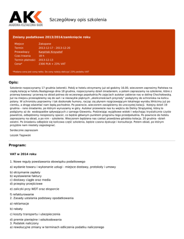 Szczegółowy opis szkolenia Zmiany podatkowe 2013/2014/zamknięcie roku Miejsce Zakopane Termin 2013-12-17 - 2013-12-20 Prowadzący Karpiński Krzysztof Czas trwania 18 h Termin płatności 2013-12-13 Cena* 2300 PLN + 23% VAT *Podana cena jest ceną netto. Do ceny należy doliczyć 23% podatku VAT Opis: Szkolenie rozpoczynamy 17 grudnia (wtorek). Pokój w hotelu otrzymamy już od godziny 16.00, wieczorem zaprosimy Państwa na ciepłą kolację w hotelu.Następnego dnia 18 grudnia, rozpoczynamy dzień śniadaniem, a potem zapraszamy na szkolenie, które z przerwą kawową i przerwą na obiad potrwa do wczesnego popołudnia.Po zajęciach autokar zabierze nas w dolinę Chochołowską. Już na miejscu przesiądziemy się do sań i w niezwykle pięknych „okolicznościach przyrody” podążymy do schroniska na końcu polany. W schronisku poprawimy i tak doskonałe humory, racząc się płynem rozgrzewającym lokalnego wyrobu.Wrócimy już po ciemku, a drogę oświetlać nam będą pochodnie. Po powrocie, wieczorem zasiądziemy do uroczystej kolacji. Kolejny dzień 19 grudnia – rano śniadanko, po którym wyruszamy w góry. Autokar przewiezie nas ku wejściu do Doliny Strążyskiej, którą to podążymy aż do wodospadów spływających z samego Giewontu. Podziwiając wyjątkowe widoki i wdychając krystalicznie czyste powietrze, odbędziemy niespieszny spacer, co będzie głównym punktem programu tego przedpołudnia. Po powrocie do hotelu zapraszamy na obiad, a po nim – szkolenie. Wieczorem będziena nas czekać prawdziwa góralska kolacja. 20 grudnia –dzień ostatni. Po śniadaniu odbędzie się końcowa część szkolenia, będzie czasna dyskusje i konsultacje. Potem obiad, po którym przyjdzie nam niestety siępożegnać. Serdecznie zapraszam Leszek Tagowski Program: VAT w 2014 roku 1. Nowe reguły powstawania obowiązku podatkowego a) wydanie towaru i wykonanie usługi - miejsce dostawy, protokoły i umowy b) otrzymanie zapłaty b) wystawienie faktury c) dostawy ciągłe oraz media d) przepisy przejściowe e) zaliczki przy WDT oraz eksporcie f) refakturowanie 2. Zasady ustalania podstawy opodatkowania a) reklamacje b) rabaty c) koszty transportu i ubezpieczenia d) premie pieniężne i odszkodowania 3. Podatek naliczony a) rewolucyjne zmiany w terminach odliczenia podatku naliczonego b) podatek naliczony przy zakupach z zagranicy c) przepisy przejściowe d) struktura sprzedaży e) korekty a niezapłacone faktury f) samochody osobowe a vat g) duplikaty h) faktury zaliczkowe 4. Regulacje w sprawie faktur a) definicja faktury - ułatwienia w obrocie gospodarczym b) treść faktury c) terminy wystawiania faktur d) faktury korygujące e) faktury wewnętrzne i zaliczkowe f) procedury kontroli g) wystawcy faktur 5. Dostawa towarów używanych 6. Dokumentacja korekt sprzedaży detalicznej 7. Świadczenia nieodpłatne a vat 8. Solidarna odpowiedzialność dostawcy za rozliczenie vat przez odbiorcę 9. Podatnicy vat 10. Rozliczanie vat przez małych podatników Podatek dochodowy wybrane zagadnienia 1. Koszty podatkowe a niezapłacone faktury a) koszty pośrednie b) koszty bezpośrednie c) amortyzacja d) leasing i zakupy na raty 2. Przychody z nieodpłatnych świadczeń a) zakres wyłączeń b) ustalanie podstawy opodatkowania c) świadczenia otrzymane przez pracowników 3. Reprezentacja 4. Koszty na przełomie roku a) koszty pośrednie i bezpośrednie b) koszt czy rezerwy c) korekty deklaracji podatkowych 5. Przychody na przełomie roku a) świadczenia ciągłe b) korekty 6. Spółki komandytowo – akcyjne jako podatnicy CIT w 2014 7. Dywidendy w formie niepieniężnej w 2014 8. Kapitalizacja i odsetki od pożyczek w 2014 9. Kapitały zapasowe i rezerwowe - opodatkowanie w 2014 10. Zbycie wierzytelności w 2014 11. Różnice kursowe 12. Transakcje międzynarodowe - certyfikat rezydencji, deklaracje Rachunkowość 1. Odpowiedzialność za księgi i rozliczenia podatkowe 2. Wycena i aktualizacja 3. Zasady przechowywania dokumentów 4. Wybrane zagadnienia z zakresu sporządzania sprawozdań finansowych 5. Transakcje w walutach obcych w trakcie i na zakończenie roku 6. Przychody, koszty bezpośrednie i pośrednie na przełomie roku 7. Rezerwy a RMB i zobowiązania warunkowe 8. Leasing - ujęcie księgowe, wady i zalety 9. Podatek odroczony Dla kogo: Szkolenie przeznaczone dla pracowników działów finansowo- ksiegowych. Cel: Najważniejszym aspektem szkolenia jest przedstawienie zmian w podatku VAT oraz dochodowym mających nastąpić w 2014 roku. Najwięcej miejsca poświęcone będzie podatkowi od towarów i usług. Poruszone zostaną również zmiany w przepisach podatkowych, które miały miejsce w roku 2013. Zagadnienia rachunkowe mają charakter utrwalający. Korzyści: Zajęcia będą w mieć miejsce w niewielkiej grupie. W sosób klarowny i wyczerpujący na przykładach omówione zostaną zmiany przepisów podatkowych mających mieć miejsce w 2014 roku. Przewidziany jest czas na zadawanie pytań. Wykładowca: Karpiński Krzysztof Krzysztof Karpiński jest wieloletnim specjalistą, wykładowcą i doradcą w zakresie rachunkowości i podatków. Autor artykułów prasowych. Od ponad 17 lat prowadzi szkolenia i kursy w zakresie podatków dochodowych, podatku od towarów i usług, rachunkowości oraz kursów kadrowo-płacowych. Wieloletni praktyk, od ponad 20 lat zajmuje się księgowością. Pracował na stanowiskach dyrektora finansowego oraz głównego księgowego. Prowadzi własne biuro rachunkowe. Posiada certyfikat Ministerstwa Finansów. Odbył aplikację na biegłego rewidenta. Pracował lub doradzał dla wielu firm z branży – budowlanej, transportowej, filmowej, stoczniowej, maszynowej, chemicznej, spożywczej, odzieżowej, sanitarnej, szkoleniowej, meblowej i handlowej. W trakcie pracy szkoleniowej zrealizował ok. 2000 dni szkoleniowych, szkoląc ponad 10000 osób, pracowników różnych szczebli służb finansowo księgowych. Szczegóły organizacyjne: Koszt uczestnictwa
