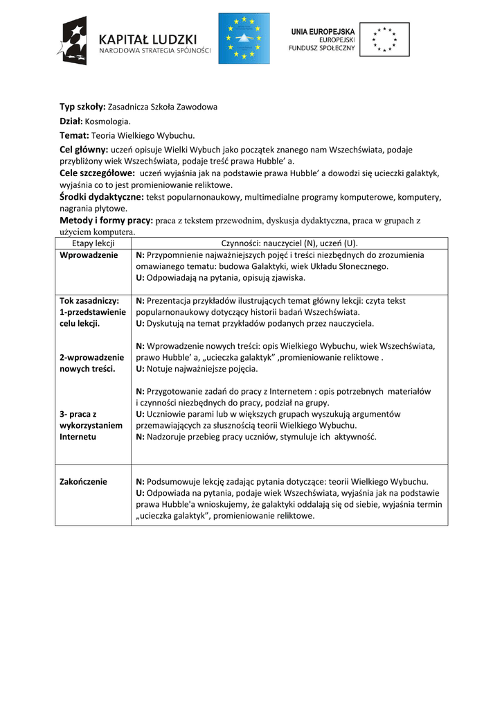 [Wpisz tekst] Typ szkoły: Zasadnicza Szkoła Zawodowa Dział: Kosmologia. Temat: Teoria Wielkiego Wybuchu. Cel główny: uczeń opisuje Wielki Wybuch jako początek znanego nam Wszechświata, podaje przybliżony wiek Wszechświata, podaje treść prawa Hubble’ a. Cele szczegółowe: uczeń wyjaśnia jak na podstawie prawa Hubble’ a dowodzi się ucieczki galaktyk, wyjaśnia co to jest promieniowanie reliktowe. Środki dydaktyczne: tekst popularnonaukowy, multimedialne programy komputerowe, komputery, nagrania płytowe. Metody i formy pracy: praca z tekstem przewodnim, dyskusja dydaktyczna, praca w grupach z użyciem komputera. Etapy lekcji Czynności: nauczyciel (N), uczeń (U). Wprowadzenie N: Przypomnienie najważniejszych pojęć i treści niezbędnych do zrozumienia omawianego tematu: budowa Galaktyki, wiek Układu Słonecznego. U: Odpowiadają na pytania, opisują zjawiska. Tok zasadniczy: 1-przedstawienie celu lekcji. N: Prezentacja przykładów ilustrujących temat główny lekcji: czyta tekst popularnonaukowy dotyczący historii badań Wszechświata. U: Dyskutują na temat przykładów podanych przez nauczyciela. 2-wprowadzenie nowych treści. N: Wprowadzenie nowych treści: opis Wielkiego Wybuchu, wiek Wszechświata, prawo Hubble’ a, „ucieczka galaktyk” ,promieniowanie reliktowe . U: Notuje najważniejsze pojęcia. 3- praca z wykorzystaniem Internetu N: Przygotowanie zadań do pracy z Internetem : opis potrzebnych materiałów i czynności niezbędnych do pracy, podział na grupy. U: Uczniowie parami lub w większych grupach wyszukują argumentów przemawiających za słusznością teorii Wielkiego Wybuchu. N: Nadzoruje przebieg pracy uczniów, stymuluje ich aktywność. Zakończenie N: Podsumowuje lekcję zadając pytania dotyczące: teorii Wielkiego Wybuchu. U: Odpowiada na pytania, podaje wiek Wszechświata, wyjaśnia jak na podstawie prawa Hubble'a wnioskujemy, że galaktyki oddalają się od siebie, wyjaśnia termin „ucieczka galaktyk”, promieniowanie reliktowe.