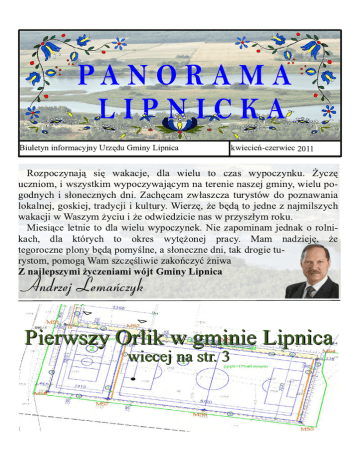 PA N O R A M A LIPNICKA Biuletyn informacyjny Urzędu Gminy Lipnica kwiecień-czerwiec 2011 Rozpoczynają się wakacje, dla wielu to czas wypoczynku. Życzę uczniom, i wszystkim wypoczywającym na terenie naszej gminy, wielu pogodnych i słonecznych dni. Zachęcam zwłaszcza turystów do poznawania lokalnej, goskiej, tradycji i kultury. Wierzę, że będą to jedne z najmilszych wakacji w Waszym życiu i że odwiedzicie nas w przyszłym roku. Miesiące letnie to dla wielu wypoczynek. Nie zapominam jednak o rolnikach, dla których to okres wytężonej pracy. Mam nadzieję, że tegoroczne plony będą pomyślne, a słoneczne dni, tak drogie turystom, pomogą Wam szczęśliwie zakończyć żniwa Z najlepszymi życzeniami wójt Gminy Lipnica AndrzejLemańczyk Pierwszy Orlik w gminie Lipnica wiecej na str. 3 2 Panorama Lipnicka | kwiecień-czerwiec 2011 r. ZMIANY W URZĘDZIE GMINY Nowy referat, nowy kierownik Od kilku miesięcy w Urzędzie Gminy funkcjonuje nowy referat. Od marca ma on także nowego kierownika. Referat Inwestycji, Infrastruktury i Gospodarki Komunalnej działa od lutego. Od marca na jego czele stoi Marcin Kiedrowski. Dotychczas pracował jako asystent kierownika budowy u lokalnego przedsiębiorcyprodukującego domy w konstrukcji szkieletowej. Po uzyskaniu uprawnień w zakresie projektowania i kierowania robotami budowlanymi w specjalności konstrukcyjnobudowlanej został kierownikiem produkcji na rynek skandynawski. Jak sam mówi scalenie dotychczasowych referatów w jeden nowy obyło się bez kłopotów organizacyjnych. Głównie dzięki zgranemu i dobranemu zespołowi osób go tworzących. To dzięki nim udało mu się tak szybko zaznajomić z bieżącymi spra- Lipnicy, a także 700. metrowy odcinek w Ostrowitem, jak również na odcinku w stronę Prądzony. Obecnie w referacie przygotowywana jest dokumentacja, a także wnioski o dofinansowanie budowy kanalizacji miejscowości Borzyszkowy i Gliśno Wielkie. Nowy kierownik Referatu Inwestycji, Infra- Sporządzana jest struktury i Gospodarki Komunalnej, Marcin dokuKiedrowski pracuje w Urzędzie Gminy od również marca. mentacja na budosportowych-wielofunkcyjne- wę nawierzchni na ul. go w Brzeźnie Szlacheckim i Polnej, a także pozostałych Orlika w Lipnicy. Na ich wy- drogach znajdujących się na konanie pozyskano już środ- nowym osiedlu w Lipnicy. ki z zewnątrz. Dodatkowo Złożono także wniosek do zakończono także kolejny Grupy Działania Sandry etap budowy gminnej kanali- Brdy na zagospodarowanie zacji we wsiach Ostrowite i plaży nad jeziorem WiejPrądzona. Wykorzystano tak- skim w Łąkiem. Przygotoże 1250 ton tłucznia na re- wywana jest również monty dróg, które koncepcja budowy domu przeprowadzono praktycznie kultury w Lipnicy. Poza tym w większości sołectw na tere- cały czas sprawowany jest nie gminy. Położono nowy nadzór nad już rozpoczętymi asfalt na ul. Kaszubskiej w inwestycjami. wami i inwestycjami. W nowej pracy za duży sukces uważa przygotowanie budowy dwóch boisk 3 Panorama Lipnicka | kwiecień-czerwiec 2011 r. Gmina stawia na sport Po boisku wielofunkcyjnym przy Zespole Szkół w Lipnicy, i podobnym przewidzianym dla Brzeźna Szlacheckiego, przyszedł czas na Orlika. Ogłoszono już przetarg na jego budowę. Nowy obiekt powstanie nieopodal obecnego boiska gminnego przy ul. Polnej, na nowym osiedlu. Plan obejmuje budowę boiska do piłki nożnej ze sztuczną murawą i drugiego, mniejszego, wielofunkcyjnego z poliuretanową nawierzchnią. Przed zamknięciem numeru nie wiadomo by- ło jeszcze ile pieniędzy także wniosek do Ministerpochłonie nowa inwestycja. stwa Sportu i Turystyki. Oferty na budowę składać bo- Do piątku 24.06. można było z kolei składać oferty na budowę boiska wielofunkcyjnego w Brzeźnie Szlachecwiem można było do 27.06. kim, które będzie podobne do Już teraz jednak gmina ma za- tego, znajdującego się w Lippewnione ponad 330 tys. zł z nicy. Na ten cel pozyskano Urzędu Marszałkowskiego. już z ministerstwa 200 tys. Na kwotę 500 tys. złożono zł. Głosuj na plac Kiedrowice, Osusznica i Prądzona mają szansę na plac zabaw w swojej miejscowości. Wszystko zależy od... mieszkańców gminy. Gmina Lipnica przystąpiła do projektu „100 placów zabaw na 100 lat Nivea”, wyznaczając trzy wsie, w których miałyby powstać place zabaw. Wspomniany projekt realizuje firma Nivea. Chce ona w ten sposób zrealizować marzenia nie tylko rodziców, ale przede wszystkim najmłodszych dzieci o budowie własnego placu zabaw. Konkurs trwa do 31.10.2011 r. Z naszej gminy zgłoszono Kiedrowice, Osusznicę i Prądzonę. By powstały w nich wspomniane place, na każdą z lokalizacji musi oddać swój głos jak największa licz- ba osób. Codziennie można oddać jeden. Głosować można wchodząc na stronę internetową www.100latnivea.pl lub odwiedzając stronę www.lipnica.pl, gdzie, w zakładce aktualności, przy opisie akcji znajduje się bezpośredni link do danej miejscowości. Zagłosuj, pomóż w rozwoju wsi. 4 Panorama Lipnicka | kwiecień-czerwiec 2011 r. KOLEJNY ETAP ZAKOŃCZONY Kanalizacja, a droga przy okazji Zakończono instalowanie kanalizacji w kolejnych dwóch wsiach naszej gminy. Firma Eko-Instal ze Studzienic położyła sieć kanalizacyjną w miejscowościach Ostrowite i Prądzona kładąc w nich blisko 15 km rur. W pierwszej z tych miejscowości podłączono 40 gospodarstw, w drugiej zaś ok. 35. Obecnie przygotowywana jest doku- Borzyszkowy i Gliśno Wielkie. Przy okazji budowy kanalizacji wyremontowano także drogę prowadzącą z Ostrowitego do Prądzony. Nie tylko położono nową nawierzchnię na tym odcinku, Do gminnej sieci kanalizacyjnej w Ostrowi- ale również wylatym podłączono 40 gospodarstw. no nowy asfalt na mentacja na budowę kanalizaodcinku ok. cji w miejscowościach Ostrowitego. 700 m w stronę Gminny urzędnik u każdego w domu Zamiast tracić czas na wizytę w urzędzie teraz każdy, kto ma internet, może pobrać od