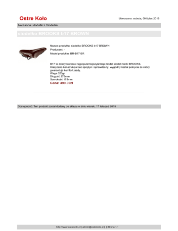 Ostre Koło Utworzono: sobota, 09 lipiec 2016 Akcesoria i dodatki > Siodełka siodełko BROOKS b17 BROWN Nazwa produktu: siodełko BROOKS b17 BROWN Producent: Model produktu: BR-B17-BR B17 to zdecydowanie najpopularniejszy model siodeł marki BROOKS. Klasyczna konstrukcja bez sprężyn i sprawdzony, wygodny kształ pokrycia ze skóry gwarantuje komfort jazdy. Waga 520gr Długość 275mm Szerokość 175mm Cena: 399.00zł Dostępność: Ten produkt został dodany do sklepu w dniu wtorek, 17 listopad 2015 http://www.ostrekolo.pl | [email protected] | | Strona 1/1